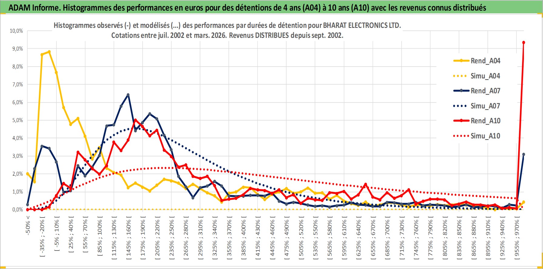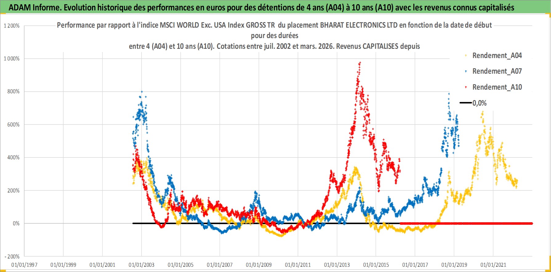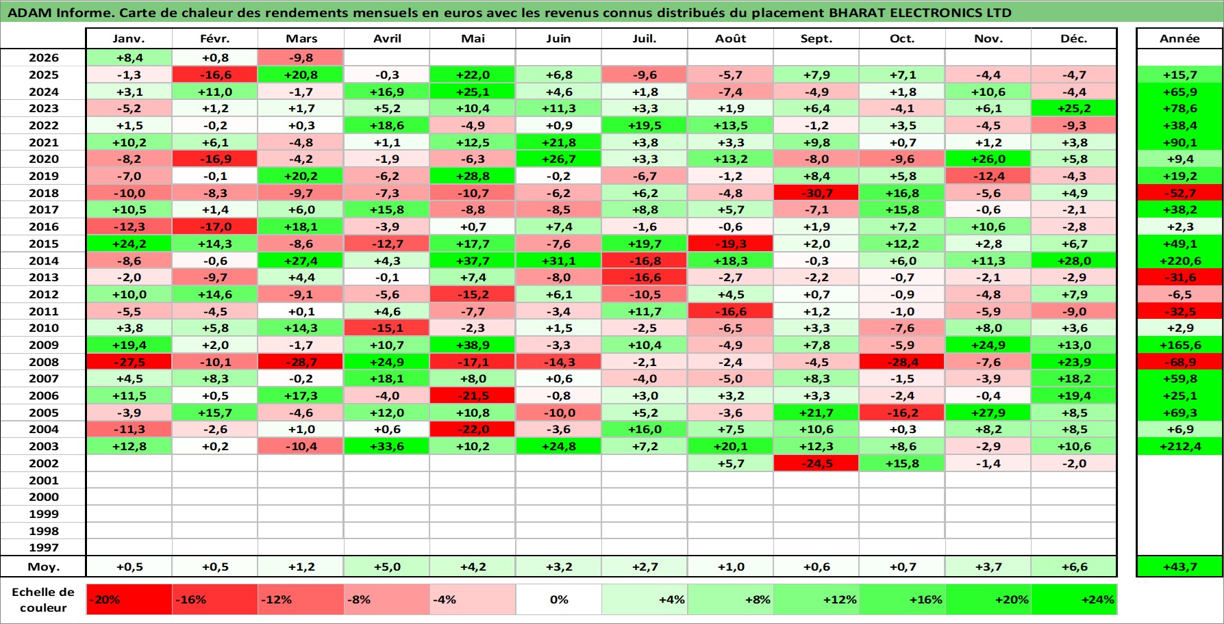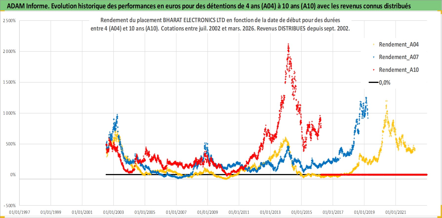 Site dédié aux investisseursPage dédiée sur site financeAnalyse des valorisations hebdomadaires de l'action BHARAT ELECTRONICS LTD. Cet actif est cote en INR. Les valorisations sont en contrevaleur EURO et couvrent les semaines 2002W27 a 2026W13. Les revenus de cet actif financier sont pris en compte depuis la semaine 2002W37. La note ESG de cet actif n'est pas connue.
