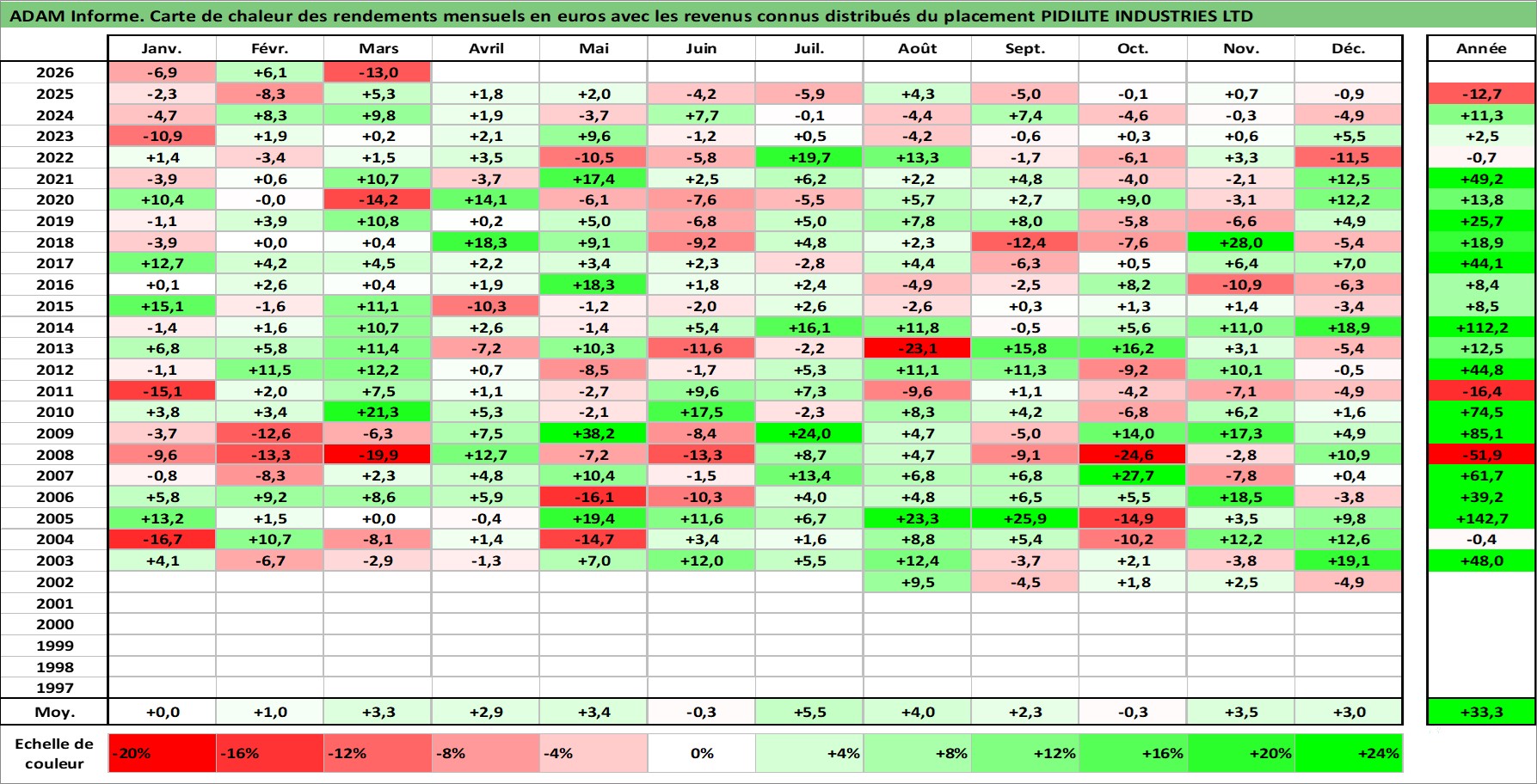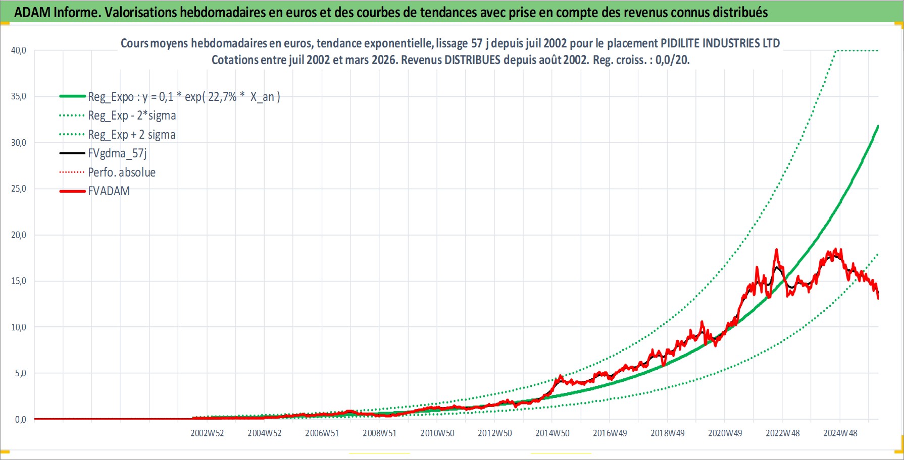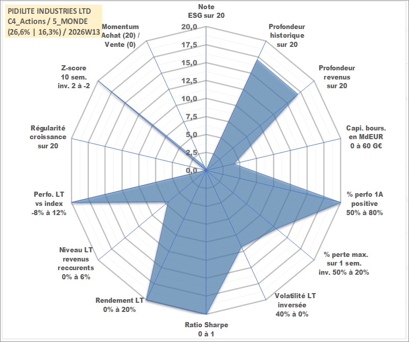 Site dédié aux investisseursPage dédiée sur site financeAnalyse des valorisations hebdomadaires de l'action PIDILITE INDUSTRIES LTD. Cet actif est cote en INR. Les valorisations sont en contrevaleur EURO et couvrent les semaines 2002W27 a 2026W13. Les revenus de cet actif financier sont pris en compte depuis la semaine 2002W34. La note ESG de cet actif n'est pas connue.