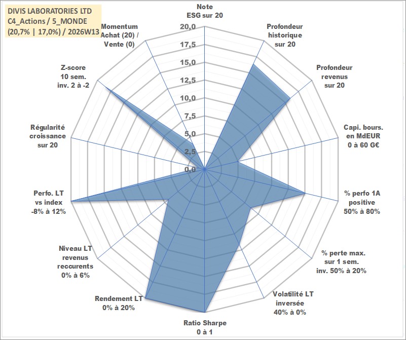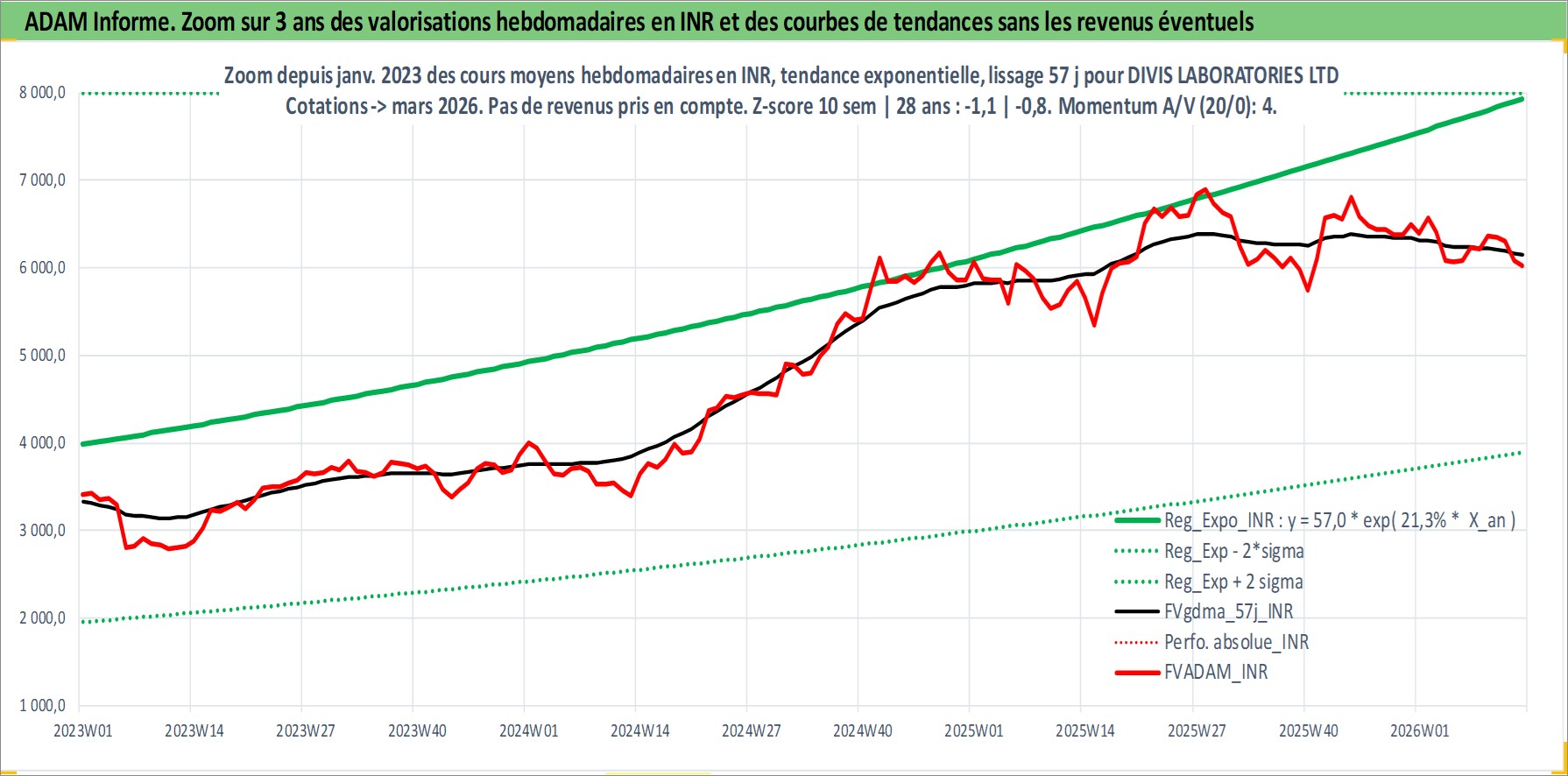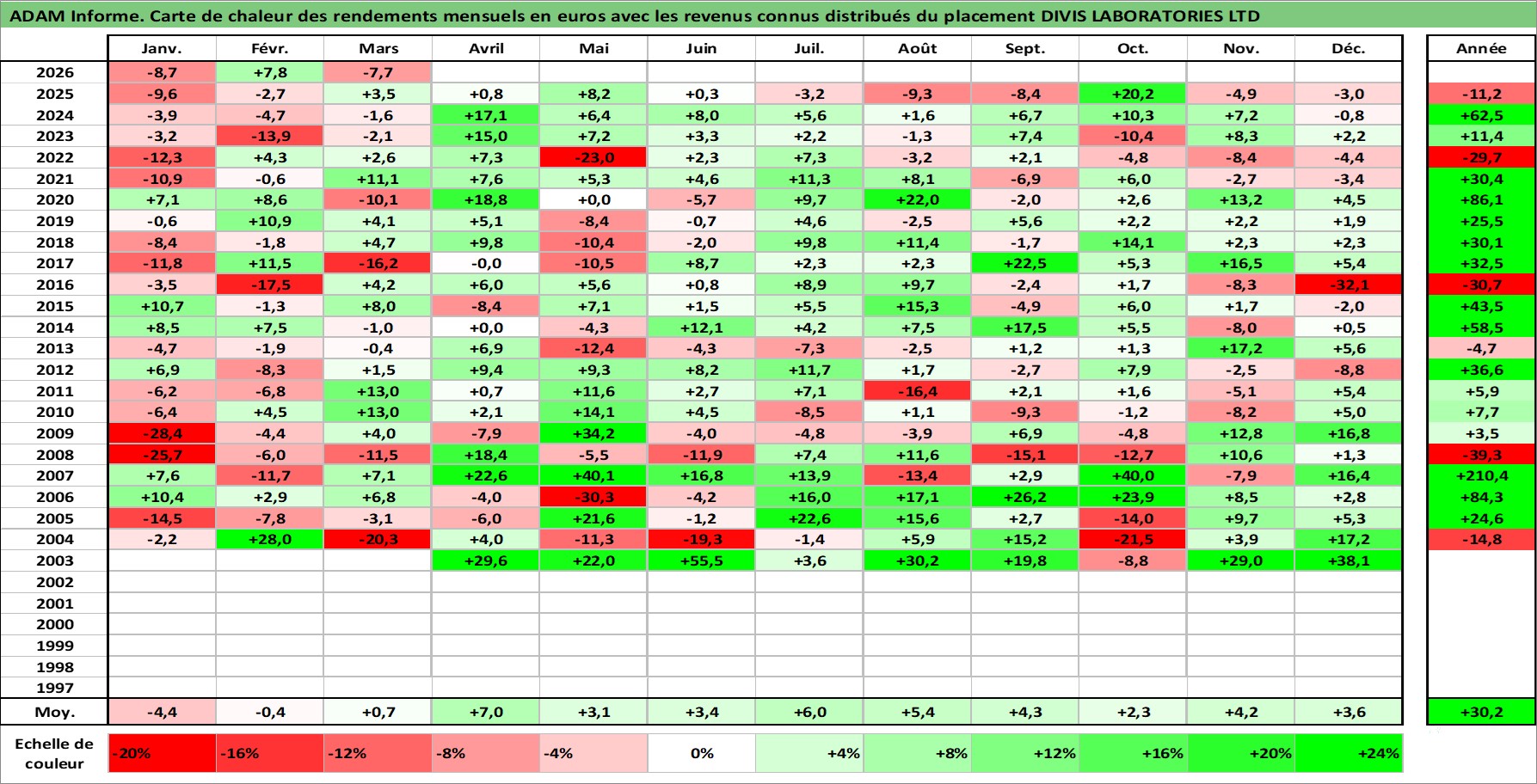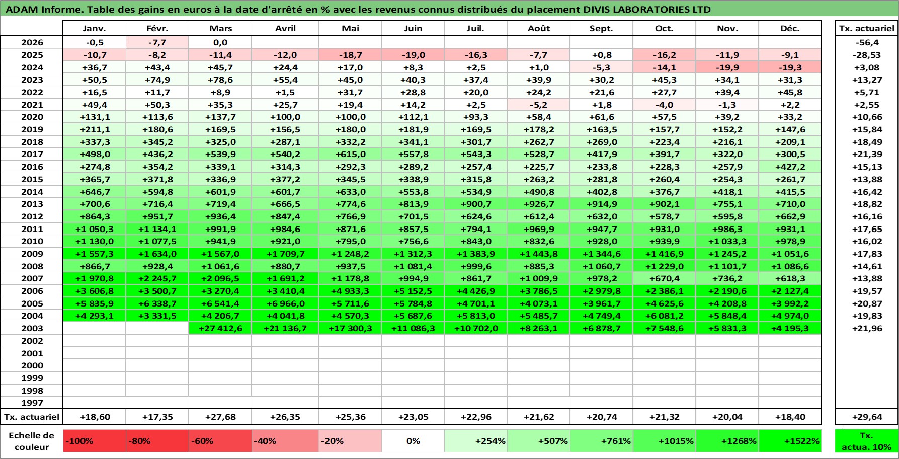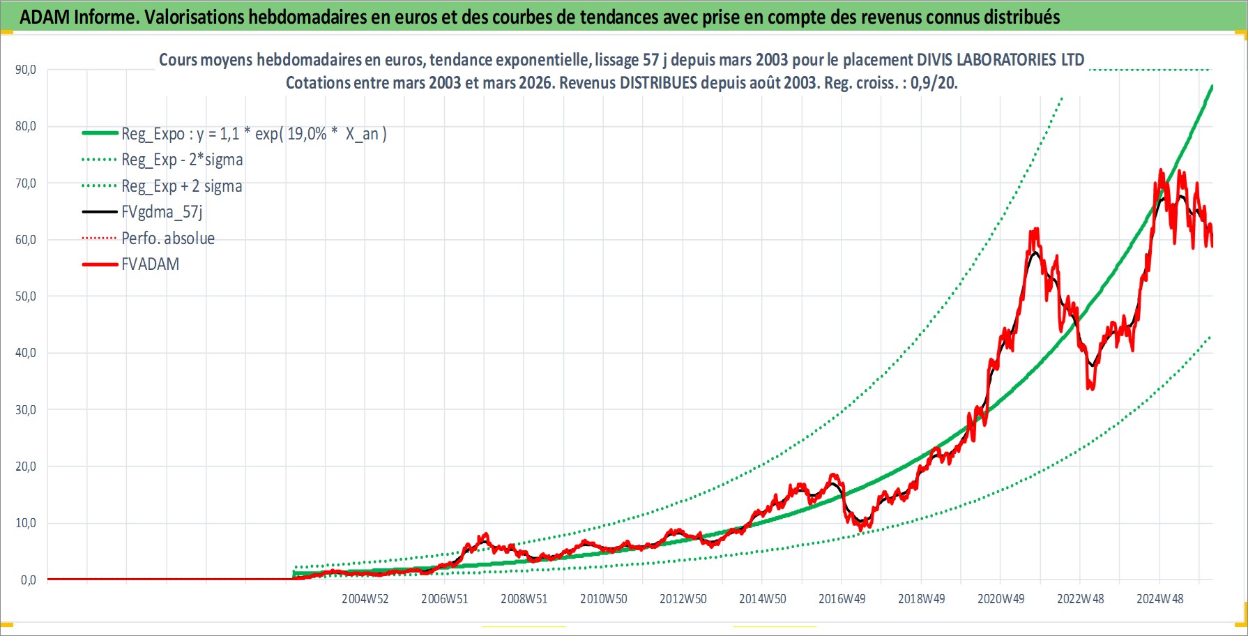 Site dédié aux investisseursPage dédiée sur site financeAnalyse des valorisations hebdomadaires de l'action DIVIS LABORATORIES LTD. Cet actif est cote en INR. Les valorisations sont en contrevaleur EURO et couvrent les semaines 2003W11 a 2026W13. Les revenus de cet actif financier sont pris en compte depuis la semaine 2003W33. La note ESG de cet actif n'est pas connue.