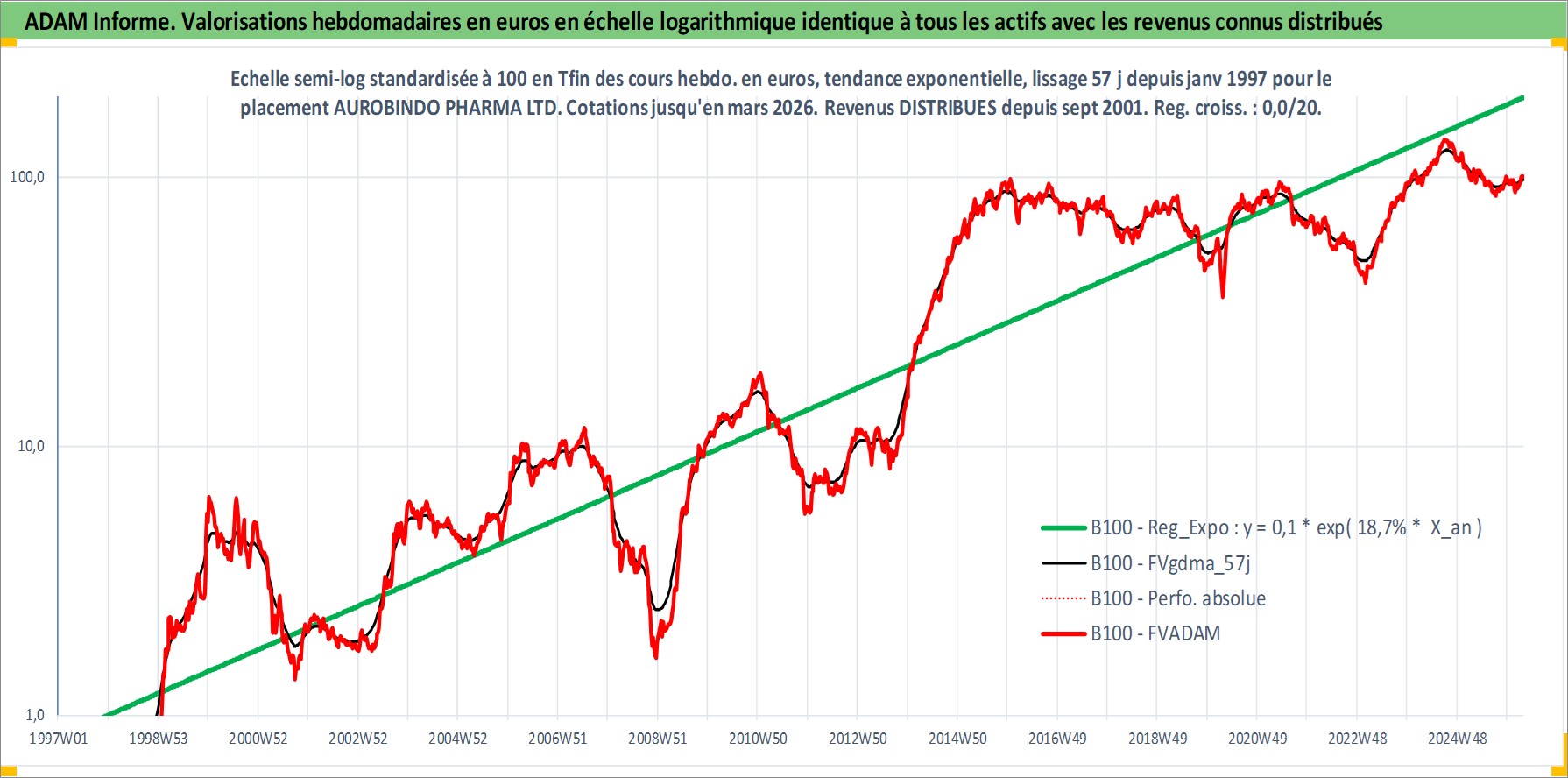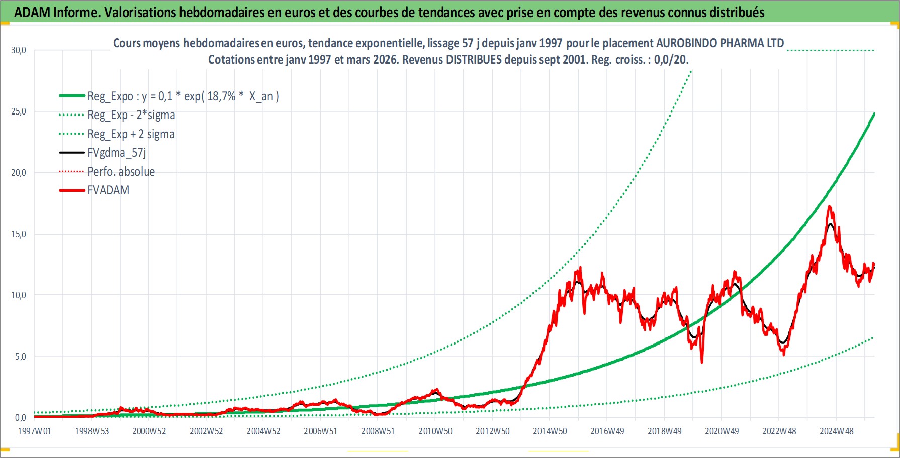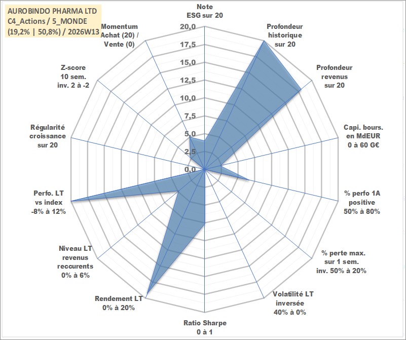 Site dédié aux investisseursPage dédiée sur site financeAnalyse des valorisations hebdomadaires de l'action AUROBINDO PHARMA LTD. Cet actif est cote en INR. Les valorisations sont en contrevaleur EURO et couvrent les semaines 1997W01 a 2026W13. Les revenus de cet actif financier sont pris en compte depuis la semaine 2001W37. La note globale ESG de cet actif est estimee a 4.0 (apres rebasage entre 0 et 20).
