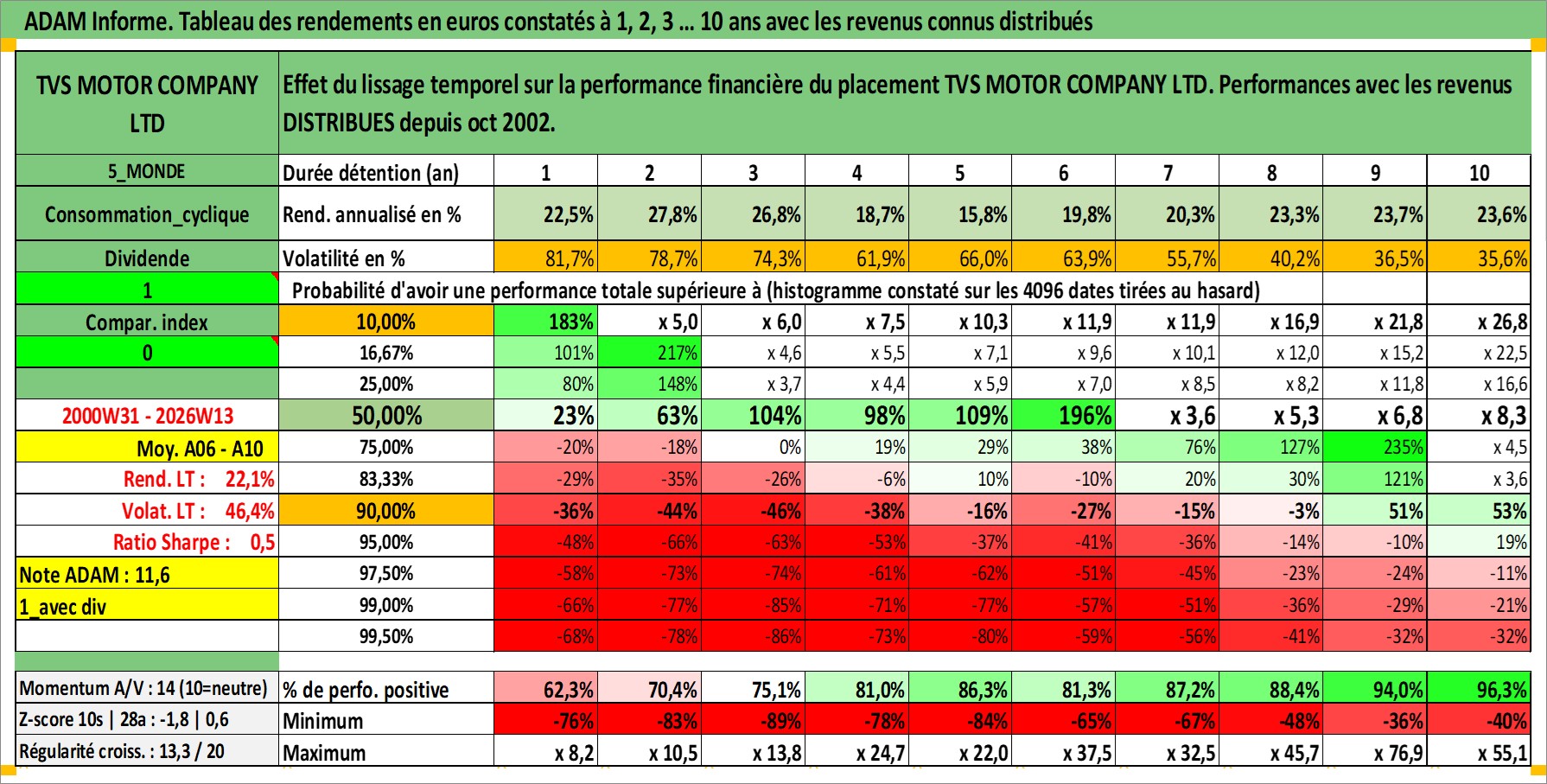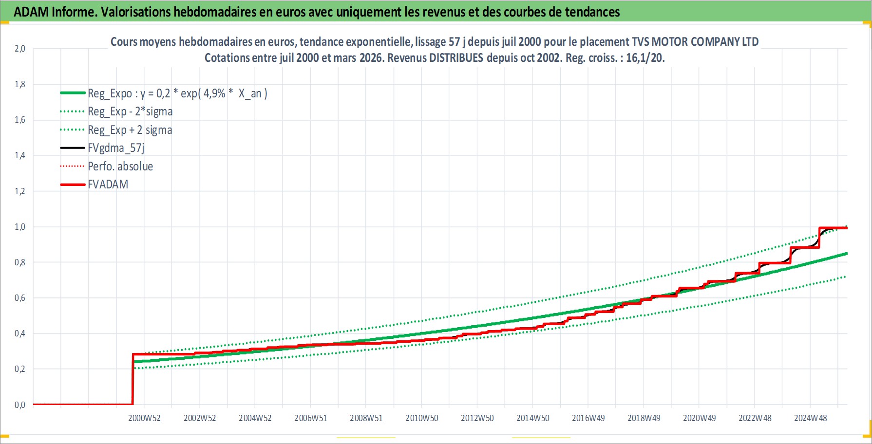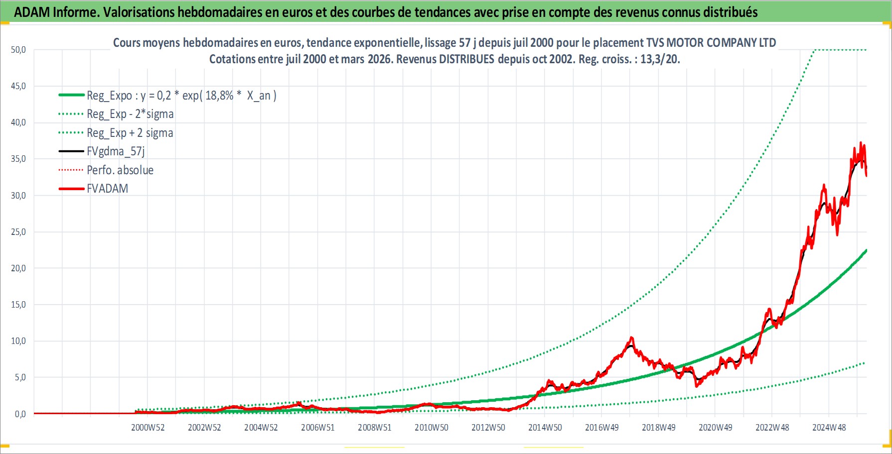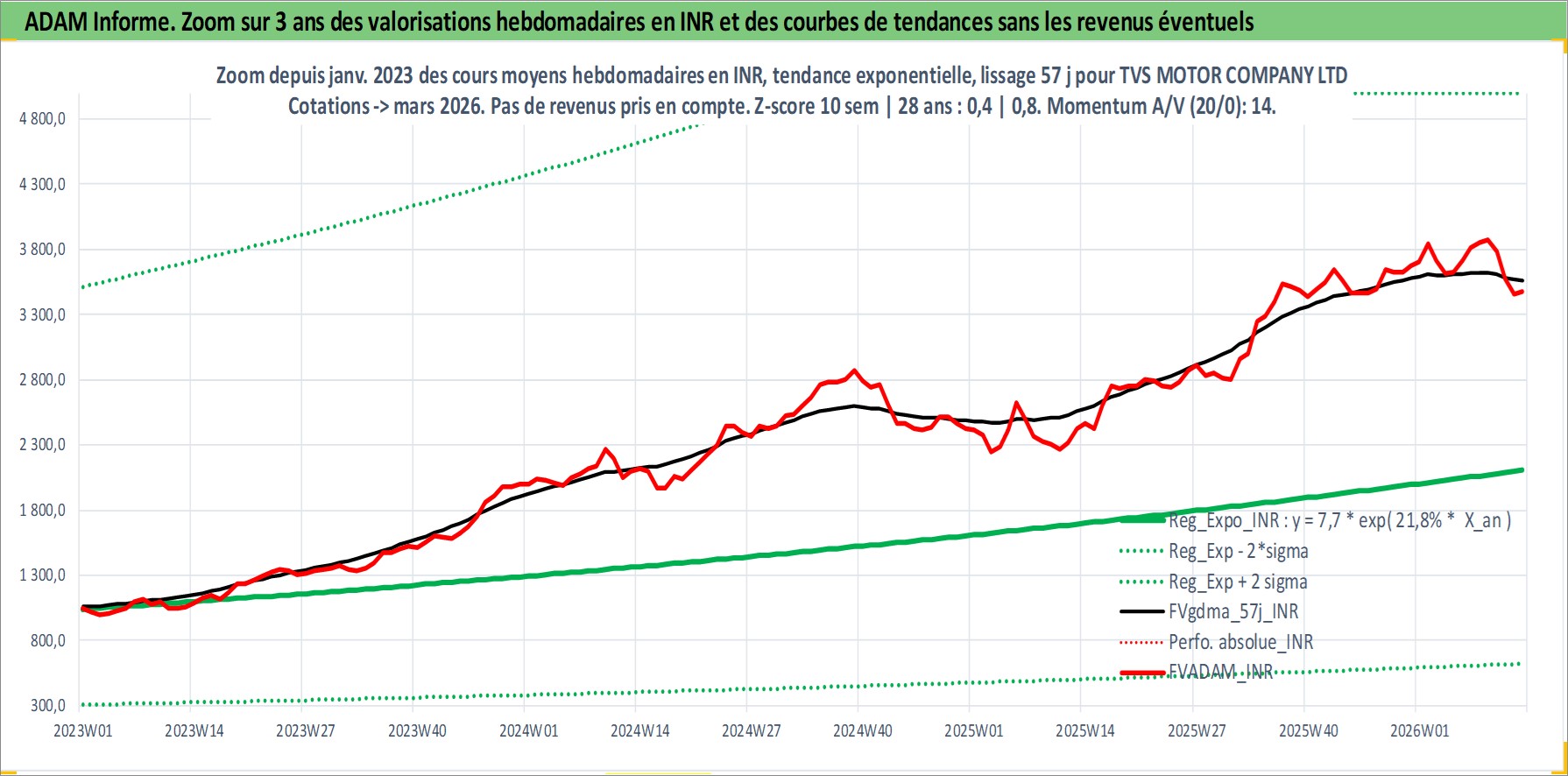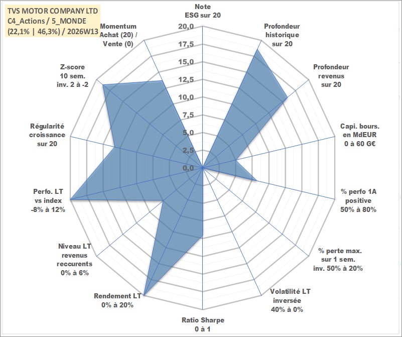 Site dédié aux investisseursPage dédiée sur site financeAnalyse des valorisations hebdomadaires de l'action TVS MOTOR COMPANY LTD. Cet actif est cote en INR. Les valorisations sont en contrevaleur EURO et couvrent les semaines 2000W31 a 2026W13. Les revenus de cet actif financier sont pris en compte depuis la semaine 2002W43. La note ESG de cet actif n'est pas connue.