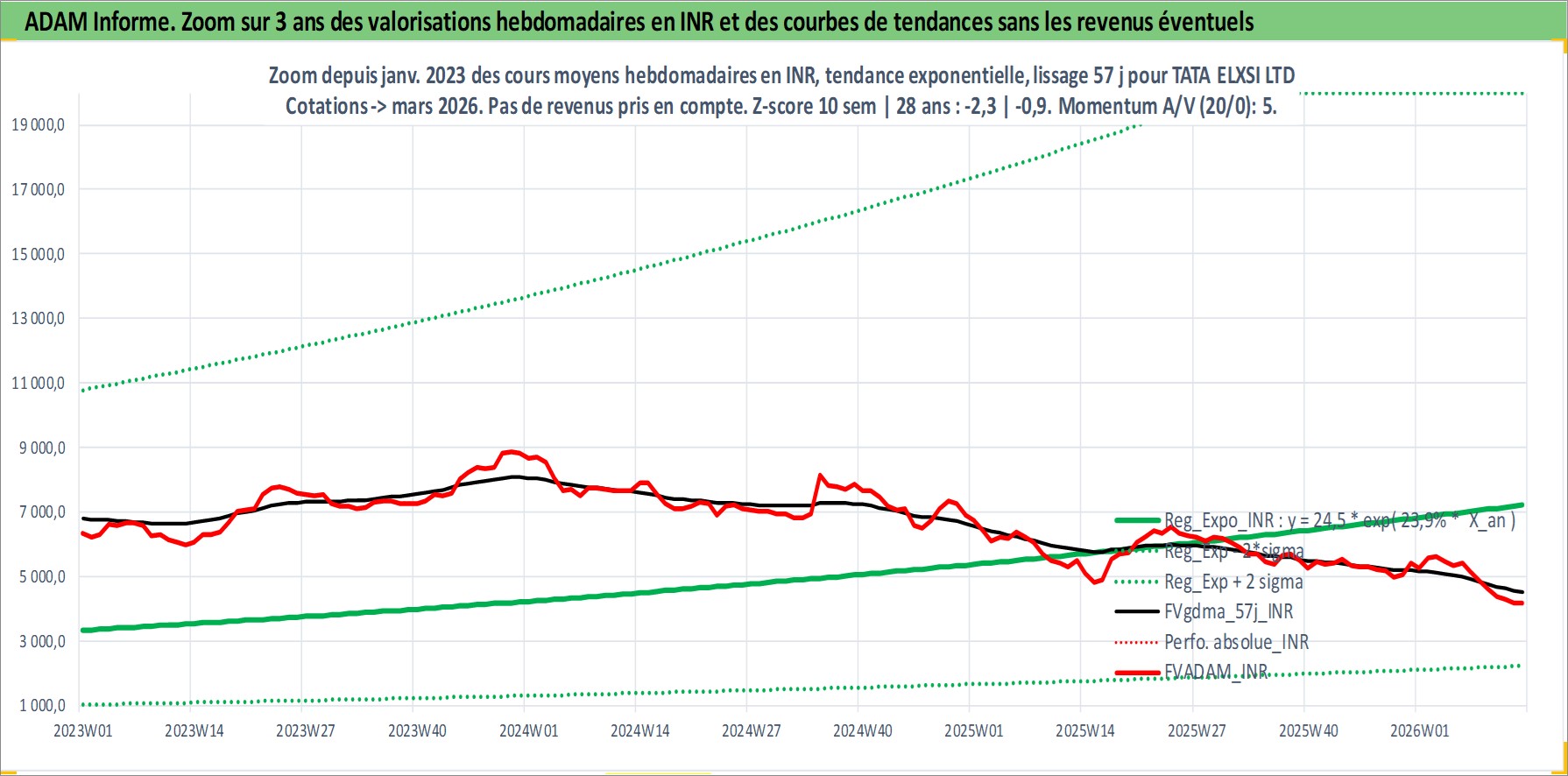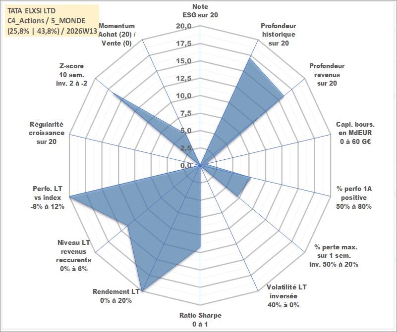 Site dédié aux investisseursPage dédiée sur site financeAnalyse des valorisations hebdomadaires de l'action TATA ELXSI LTD. Cet actif est cote en INR. Les valorisations sont en contrevaleur EURO et couvrent les semaines 2002W27 a 2026W13. Les revenus de cet actif financier sont pris en compte depuis la semaine 2004W29. La note ESG de cet actif n'est pas connue.