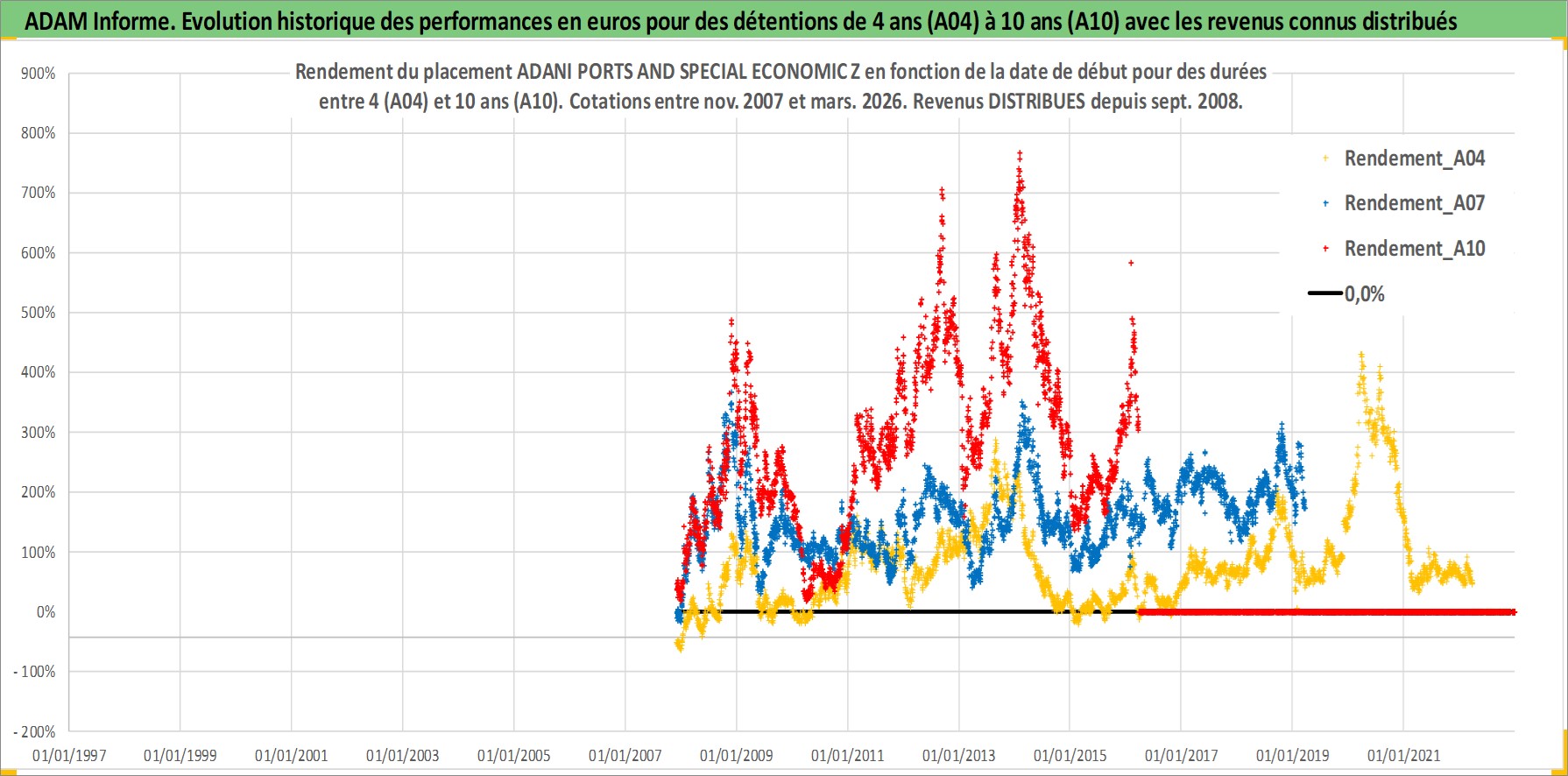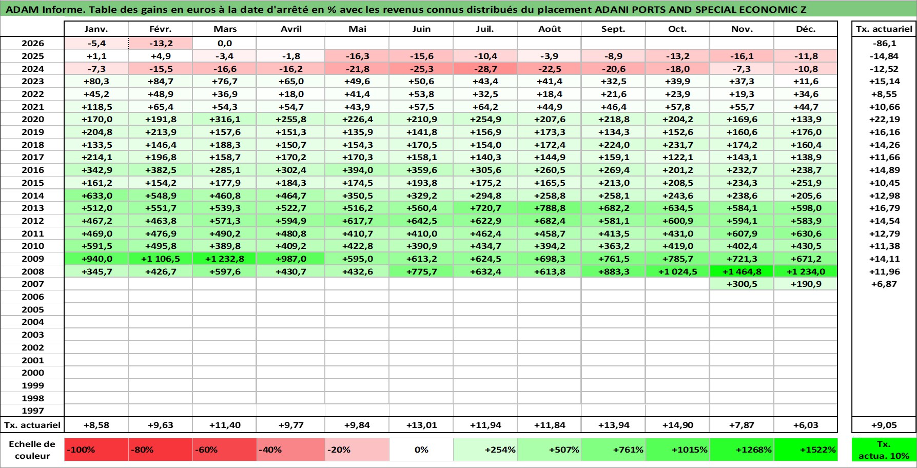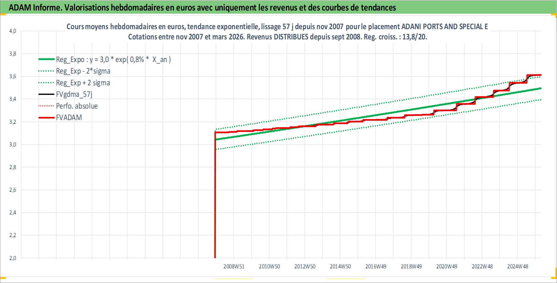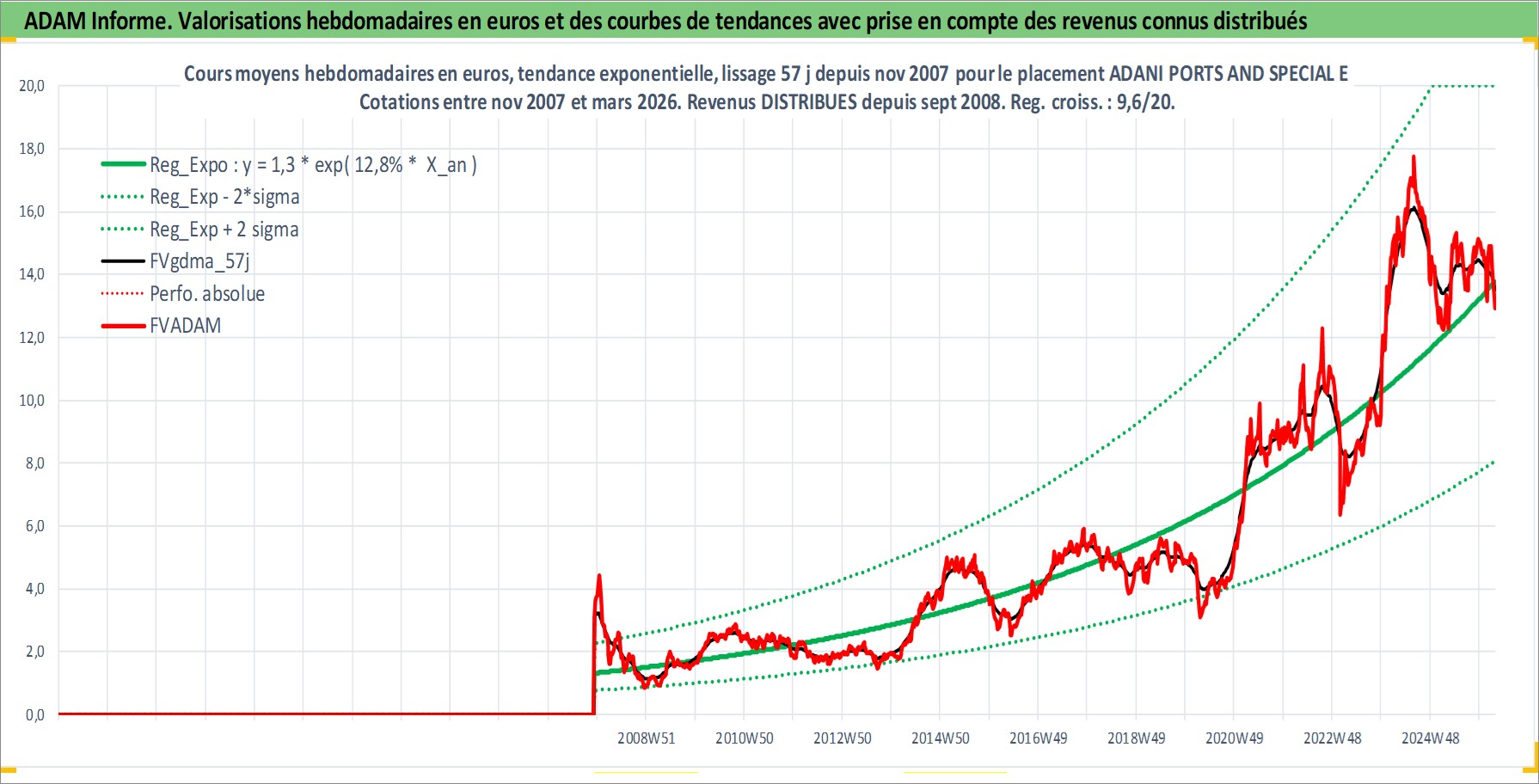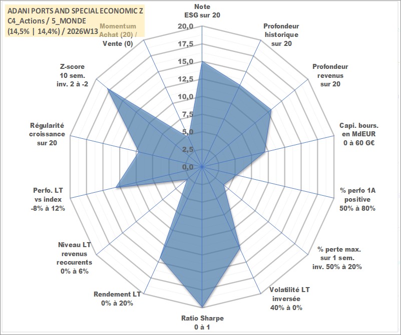 Site dédié aux investisseursPage dédiée sur site financeAnalyse des valorisations hebdomadaires de l'action ADANI PORTS AND SPECIAL ECONOMIC Z. Cet actif est cote en INR. Les valorisations sont en contrevaleur EURO et couvrent les semaines 2007W48 a 2026W13. Les revenus de cet actif financier sont pris en compte depuis la semaine 2008W37. La note globale ESG de cet actif est estimee a 15.0 (apres rebasage entre 0 et 20).