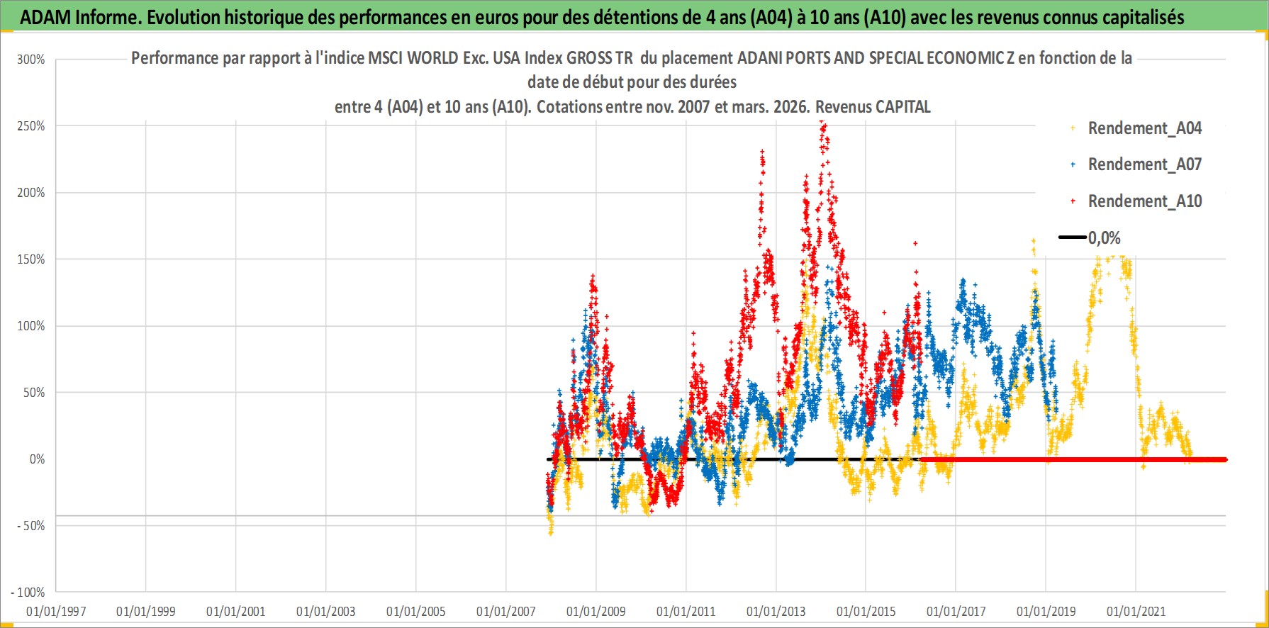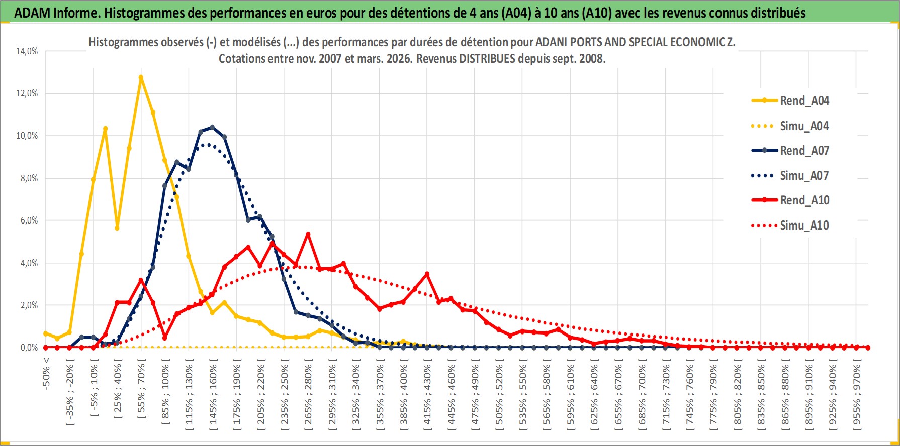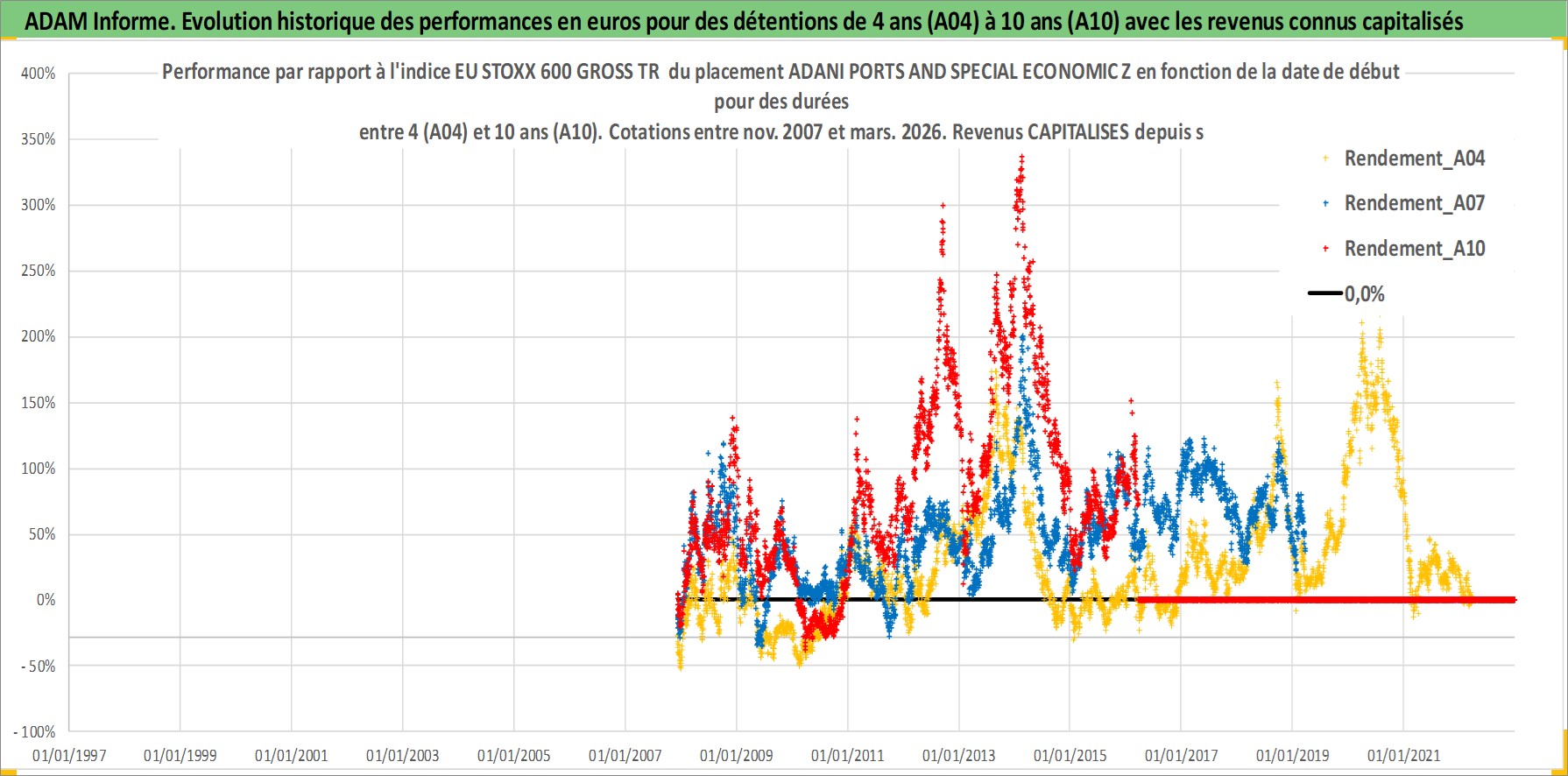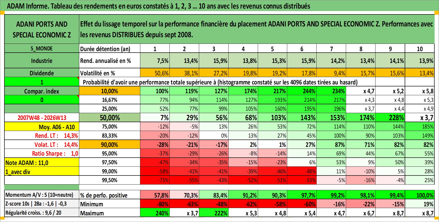 Site dédié aux investisseursPage dédiée sur site financeAnalyse des valorisations hebdomadaires de l'action ADANI PORTS AND SPECIAL ECONOMIC Z. Cet actif est cote en INR. Les valorisations sont en contrevaleur EURO et couvrent les semaines 2007W48 a 2026W13. Les revenus de cet actif financier sont pris en compte depuis la semaine 2008W37. La note globale ESG de cet actif est estimee a 15.0 (apres rebasage entre 0 et 20).