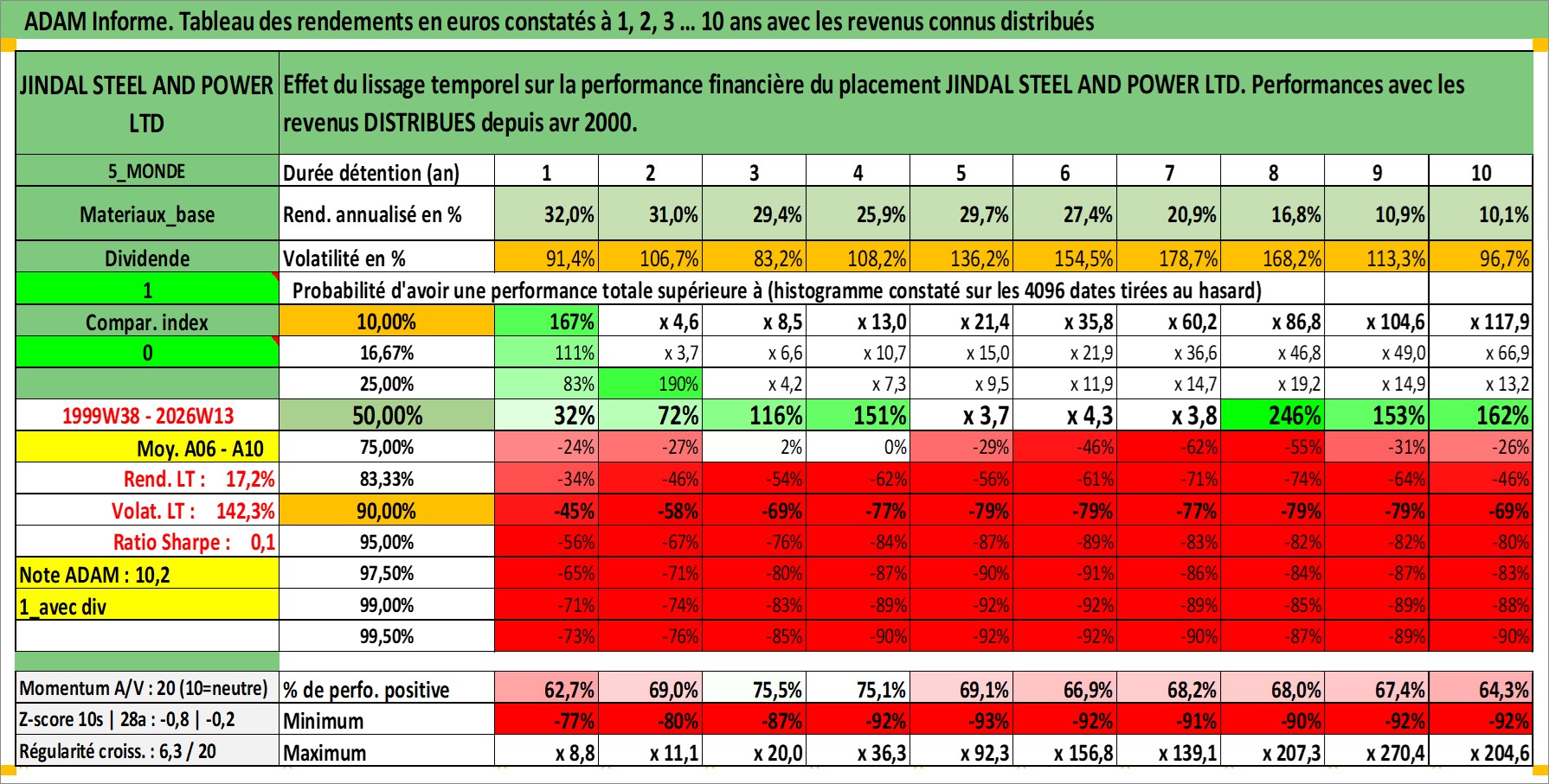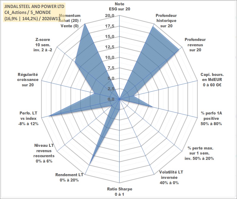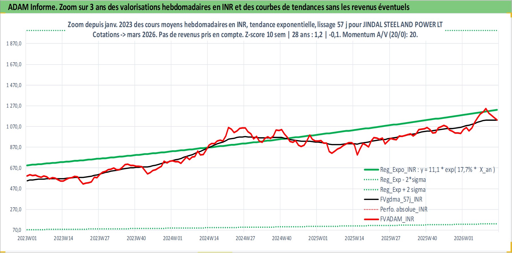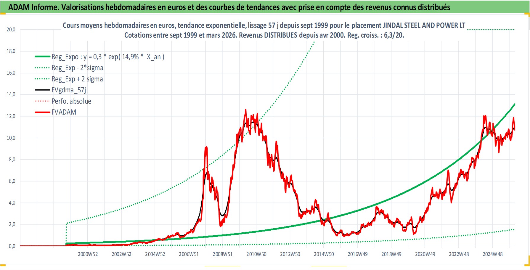 Site dédié aux investisseursPage dédiée sur site financeAnalyse des valorisations hebdomadaires de l'action JINDAL STEEL AND POWER LTD. Cet actif est cote en INR. Les valorisations sont en contrevaleur EURO et couvrent les semaines 1999W38 a 2026W13. Les revenus de cet actif financier sont pris en compte depuis la semaine 2000W17. La note ESG de cet actif n'est pas connue.