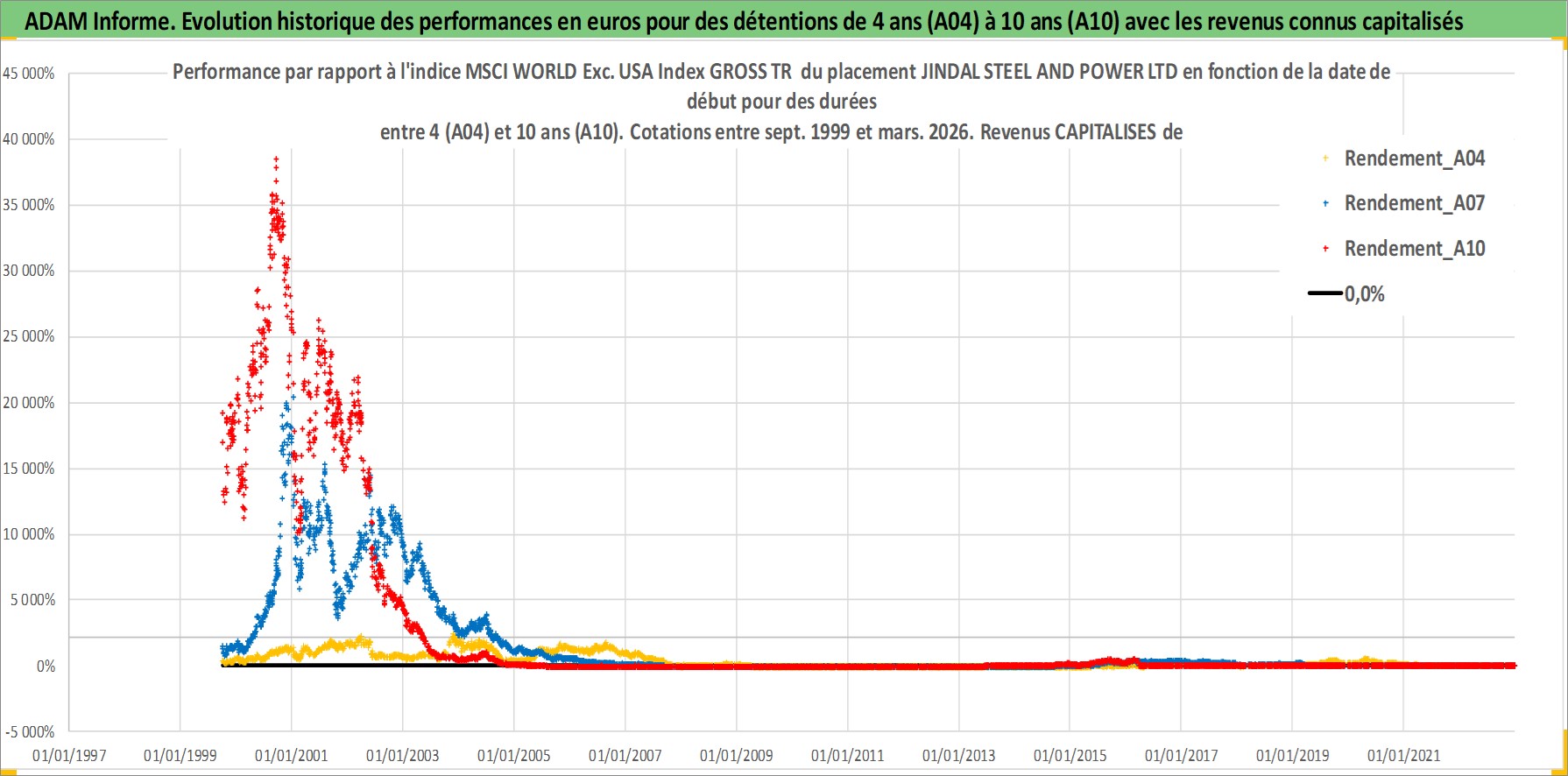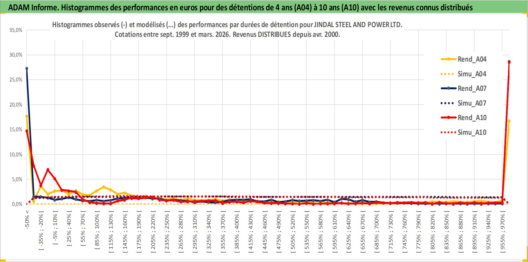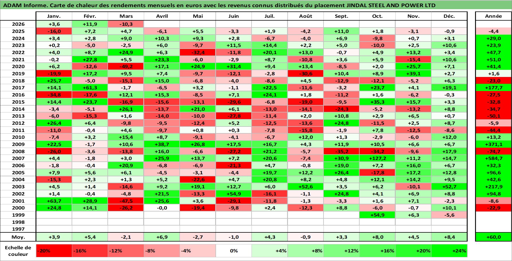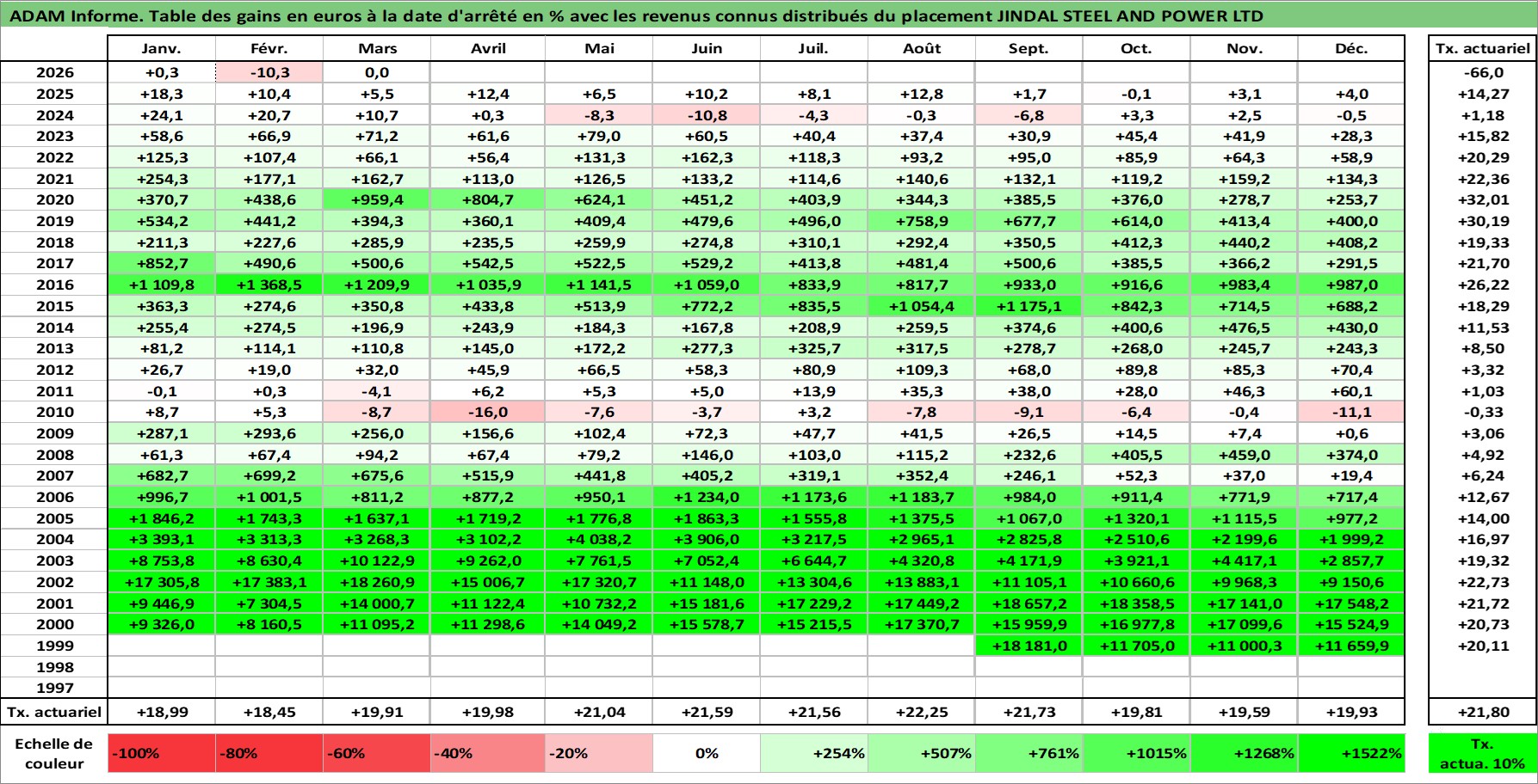 Site dédié aux investisseursPage dédiée sur site financeAnalyse des valorisations hebdomadaires de l'action JINDAL STEEL AND POWER LTD. Cet actif est cote en INR. Les valorisations sont en contrevaleur EURO et couvrent les semaines 1999W38 a 2026W13. Les revenus de cet actif financier sont pris en compte depuis la semaine 2000W17. La note ESG de cet actif n'est pas connue.