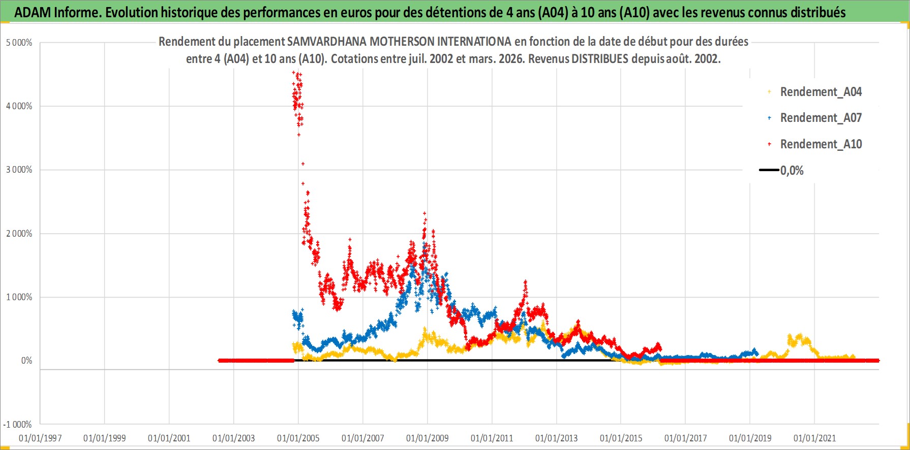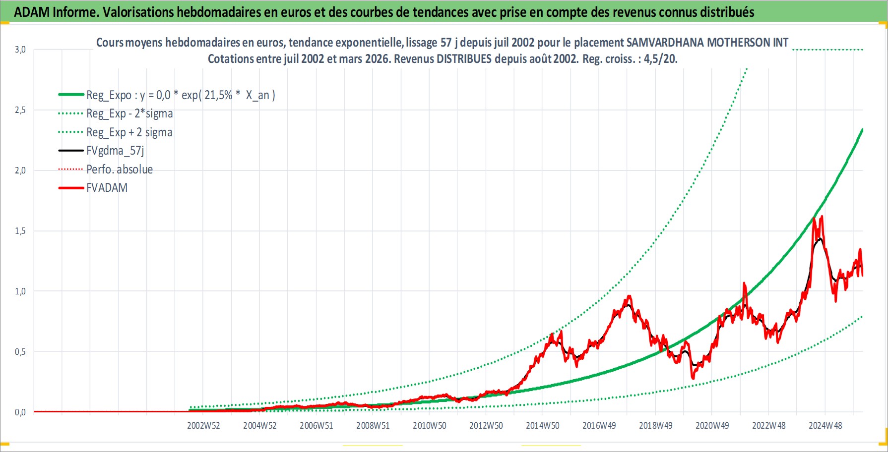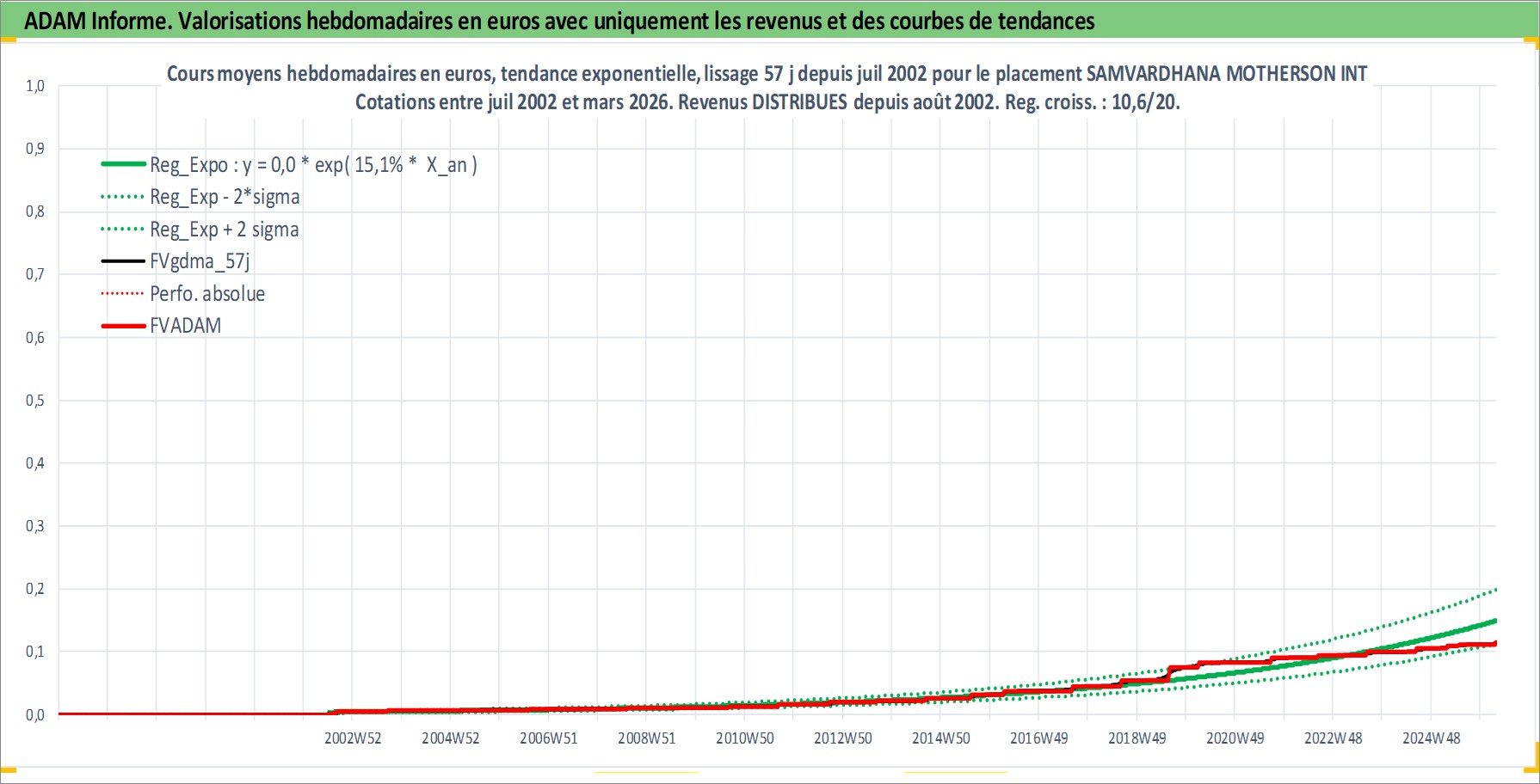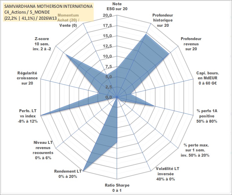 Site dédié aux investisseursPage dédiée sur site financeAnalyse des valorisations hebdomadaires de l'action SAMVARDHANA MOTHERSON INTERNATIONA. Cet actif est cote en INR. Les valorisations sont en contrevaleur EURO et couvrent les semaines 2002W27 a 2026W13. Les revenus de cet actif financier sont pris en compte depuis la semaine 2002W35. La note globale ESG de cet actif est estimee a 7.0 (apres rebasage entre 0 et 20).