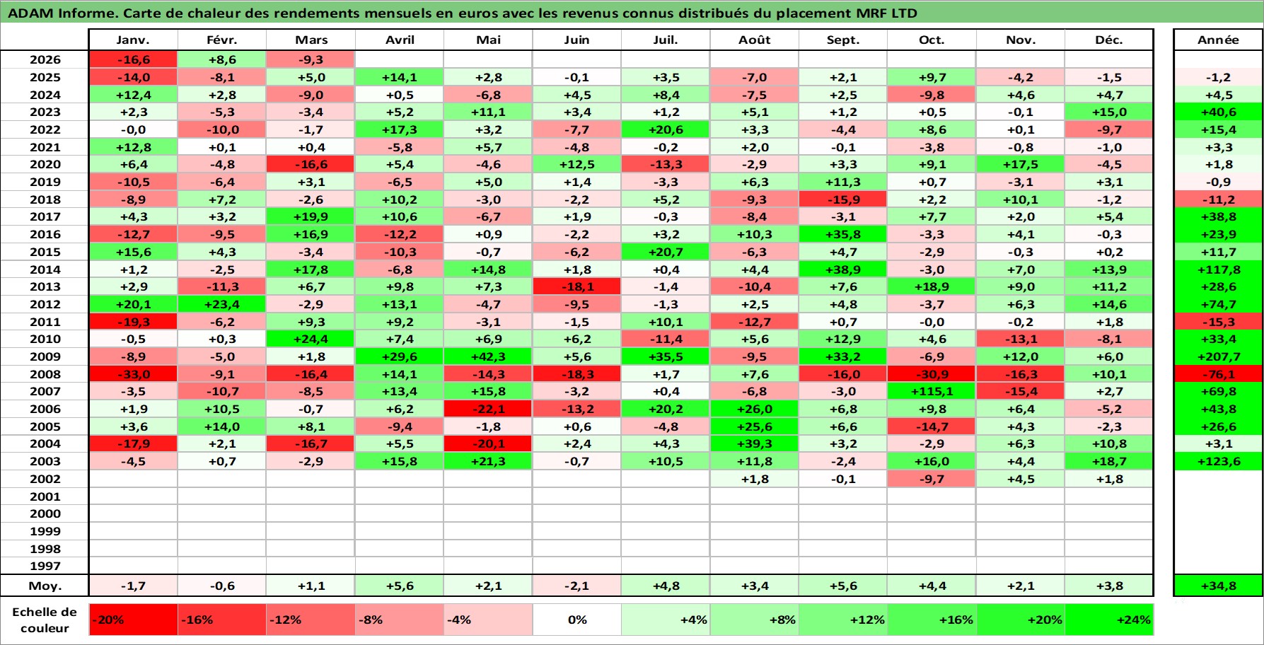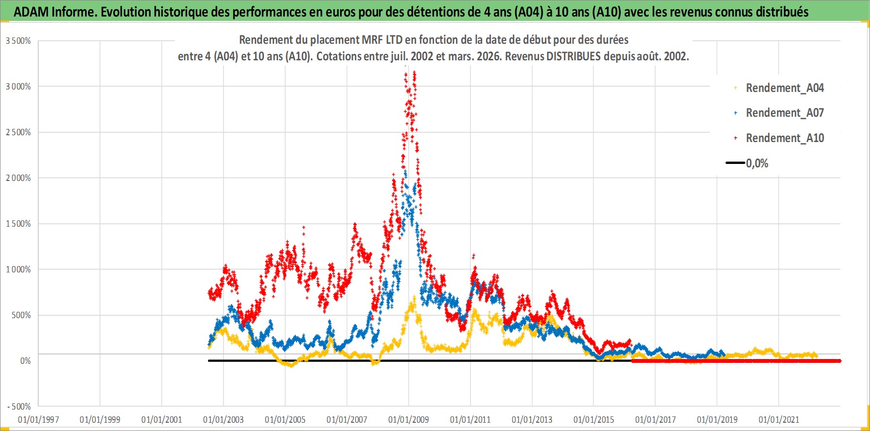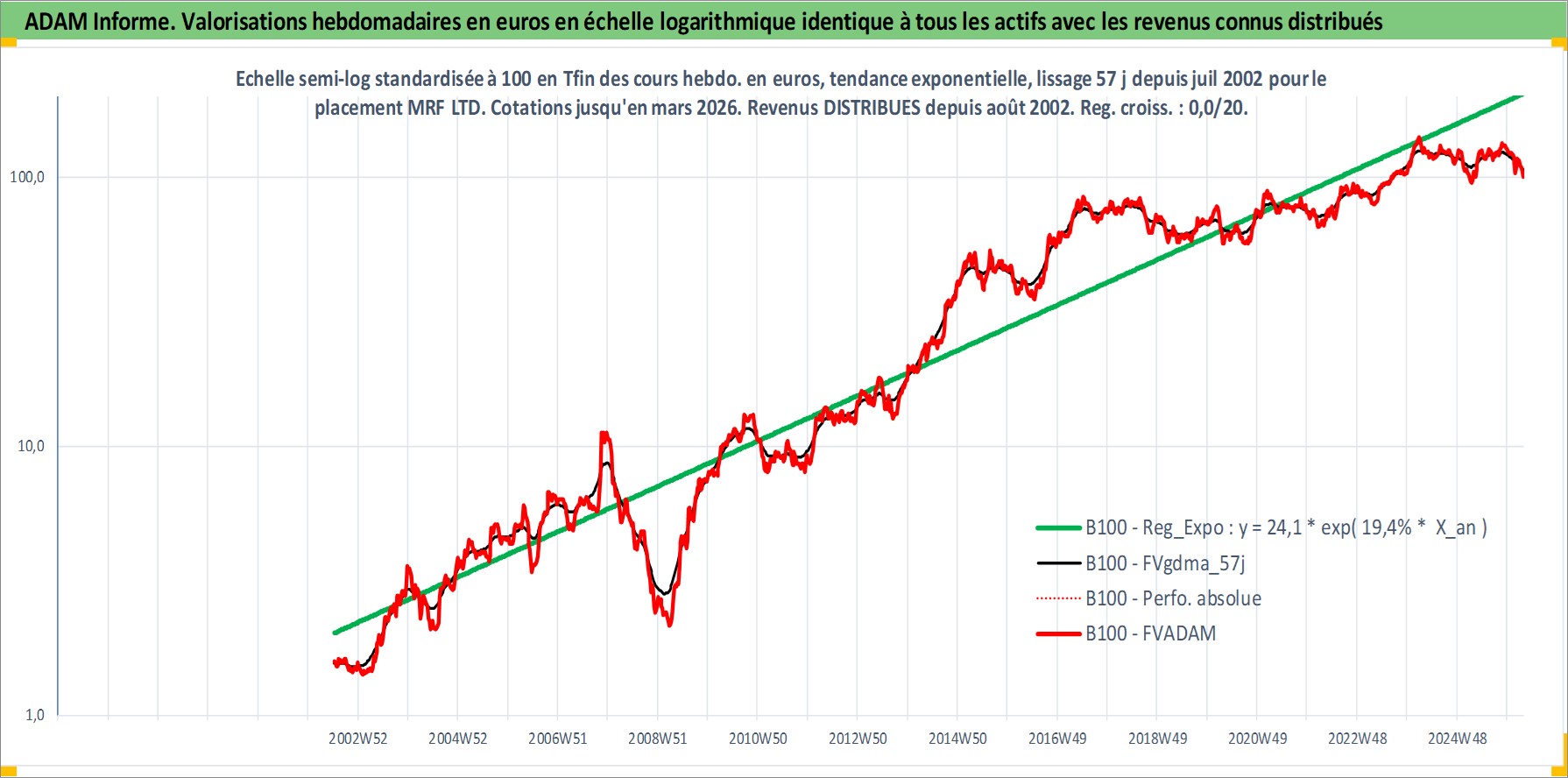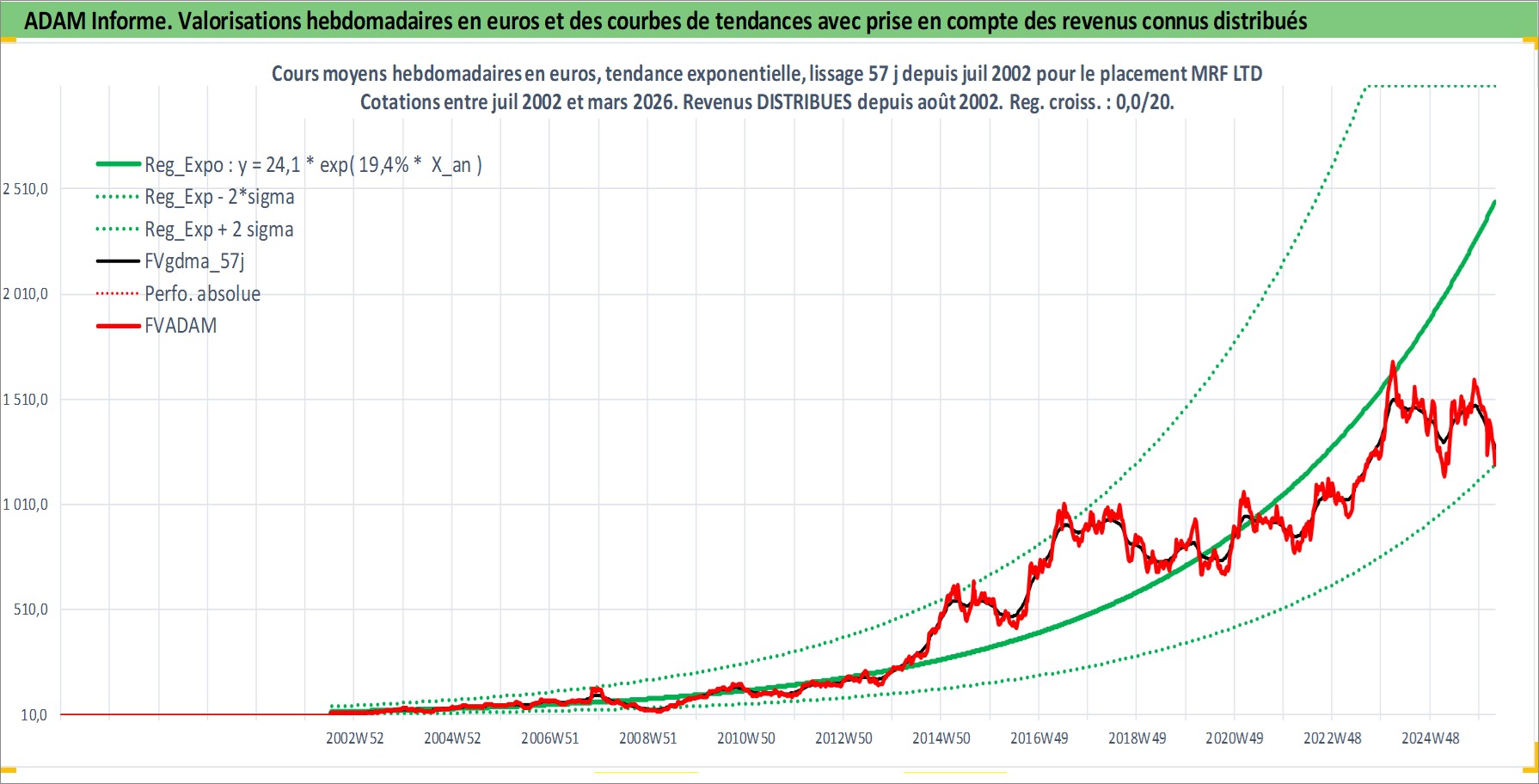 Site dédié aux investisseursPage dédiée sur site financeAnalyse des valorisations hebdomadaires de l'action MRF LTD. Cet actif est cote en INR. Les valorisations sont en contrevaleur EURO et couvrent les semaines 2002W27 a 2026W13. Les revenus de cet actif financier sont pris en compte depuis la semaine 2002W32. La note ESG de cet actif n'est pas connue.