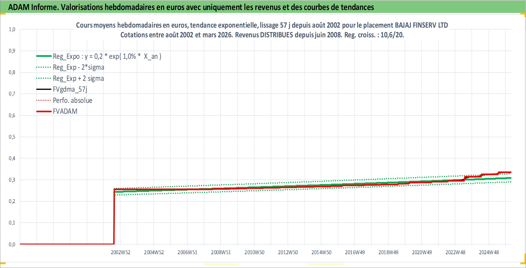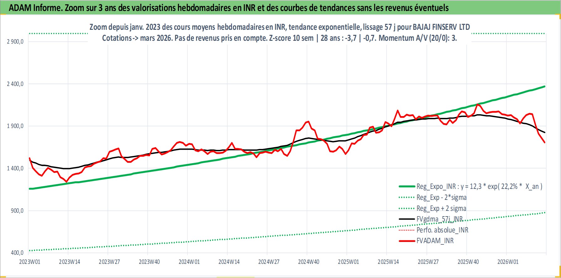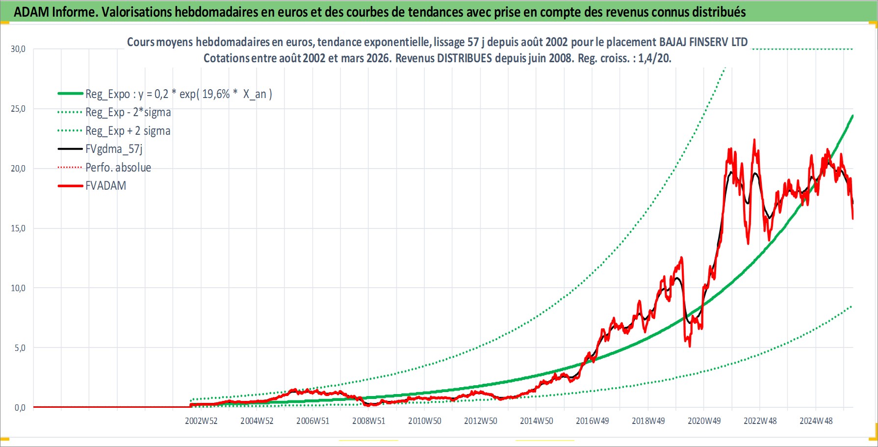 Site dédié aux investisseursPage dédiée sur site financeAnalyse des valorisations hebdomadaires de l'action BAJAJ FINSERV LTD. Cet actif est cote en INR. Les valorisations sont en contrevaleur EURO et couvrent les semaines 2002W33 a 2026W13. Les revenus de cet actif financier sont pris en compte depuis la semaine 2008W26. La note globale ESG de cet actif est estimee a 7.0 (apres rebasage entre 0 et 20).