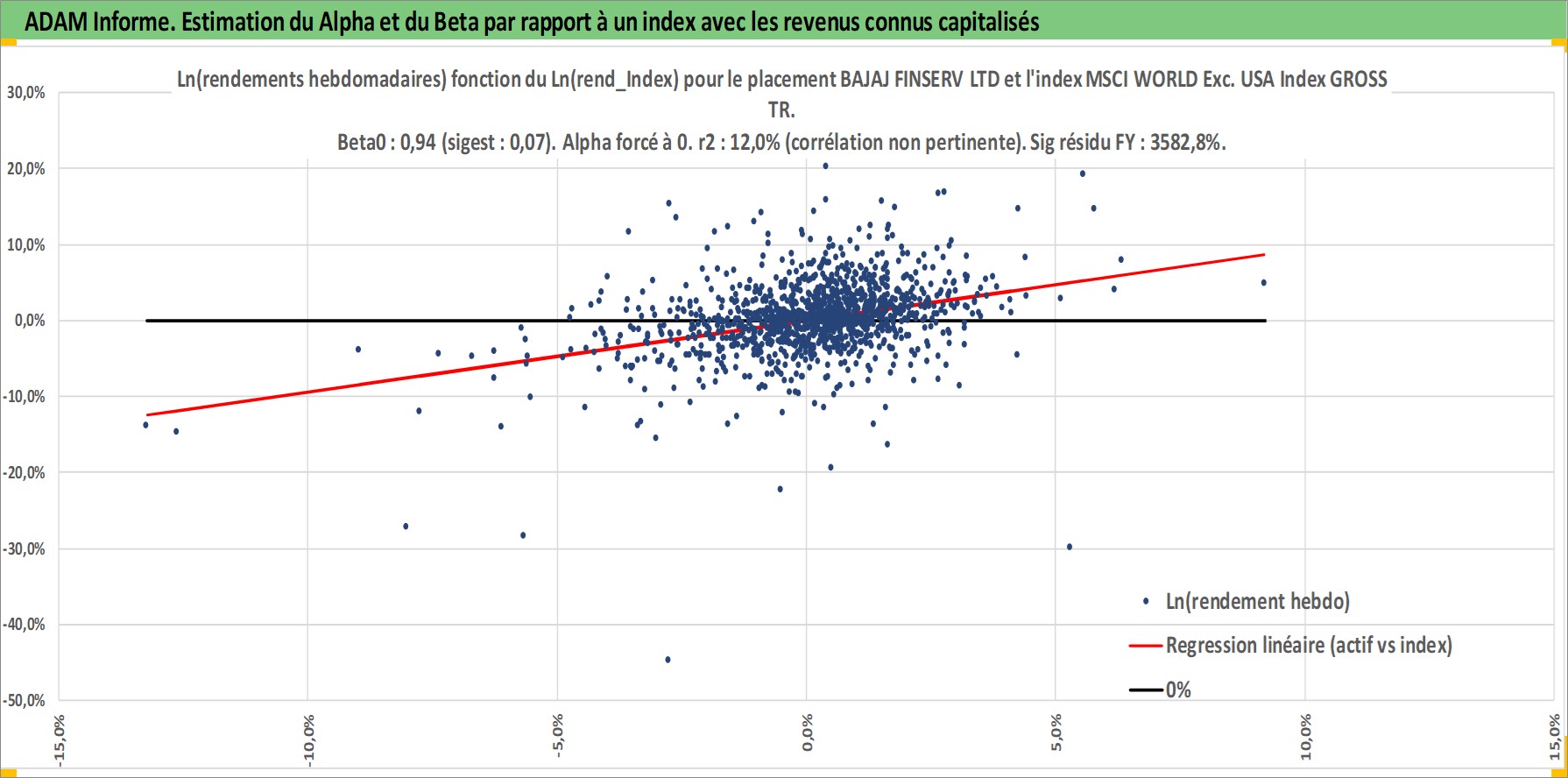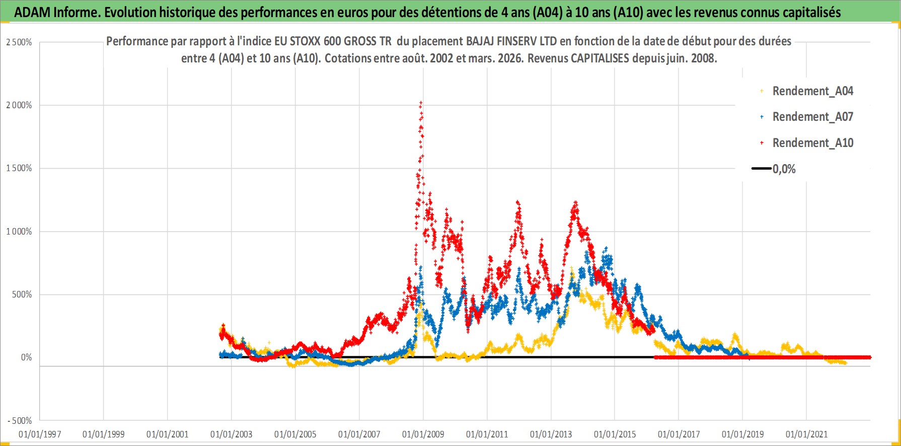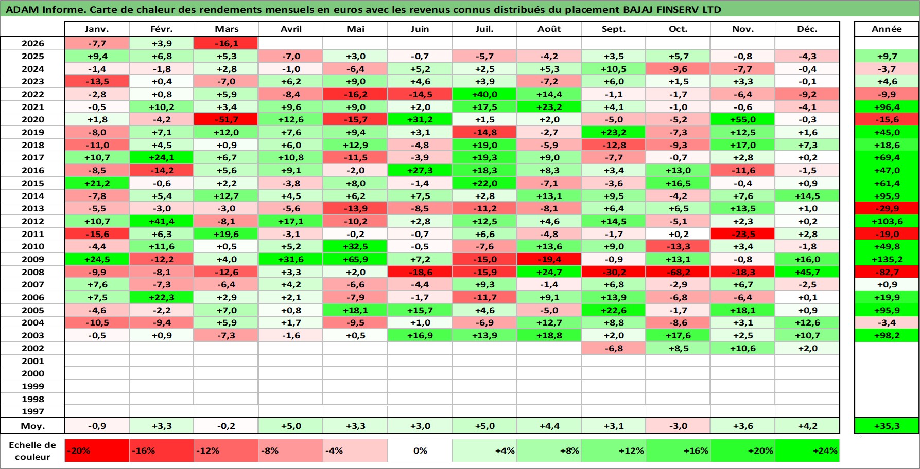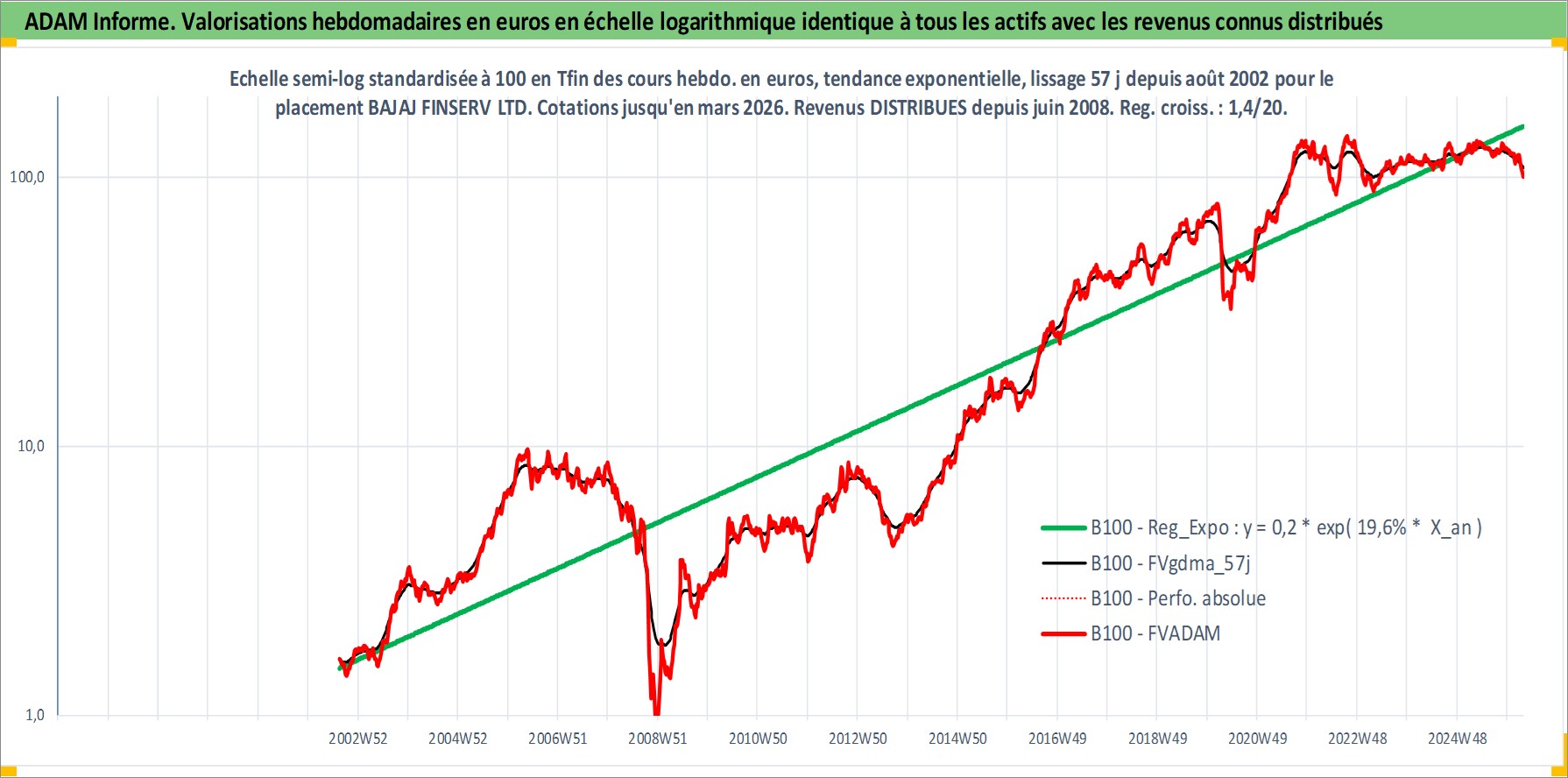 Site dédié aux investisseursPage dédiée sur site financeAnalyse des valorisations hebdomadaires de l'action BAJAJ FINSERV LTD. Cet actif est cote en INR. Les valorisations sont en contrevaleur EURO et couvrent les semaines 2002W33 a 2026W13. Les revenus de cet actif financier sont pris en compte depuis la semaine 2008W26. La note globale ESG de cet actif est estimee a 7.0 (apres rebasage entre 0 et 20).