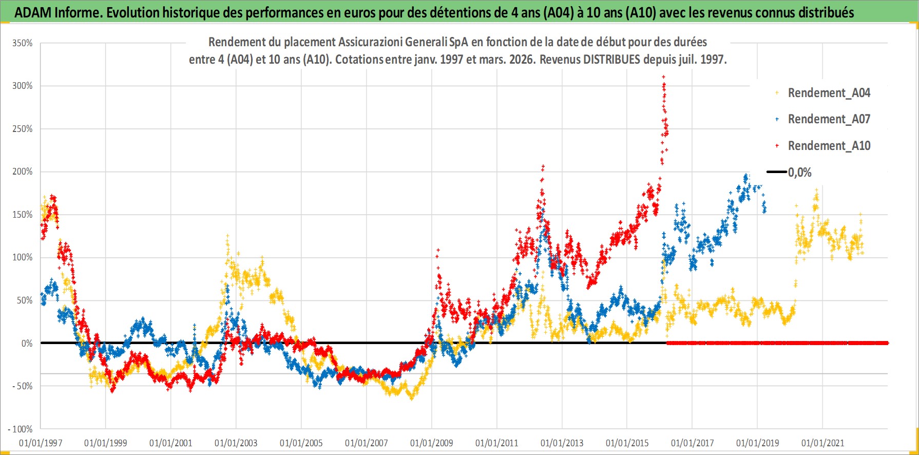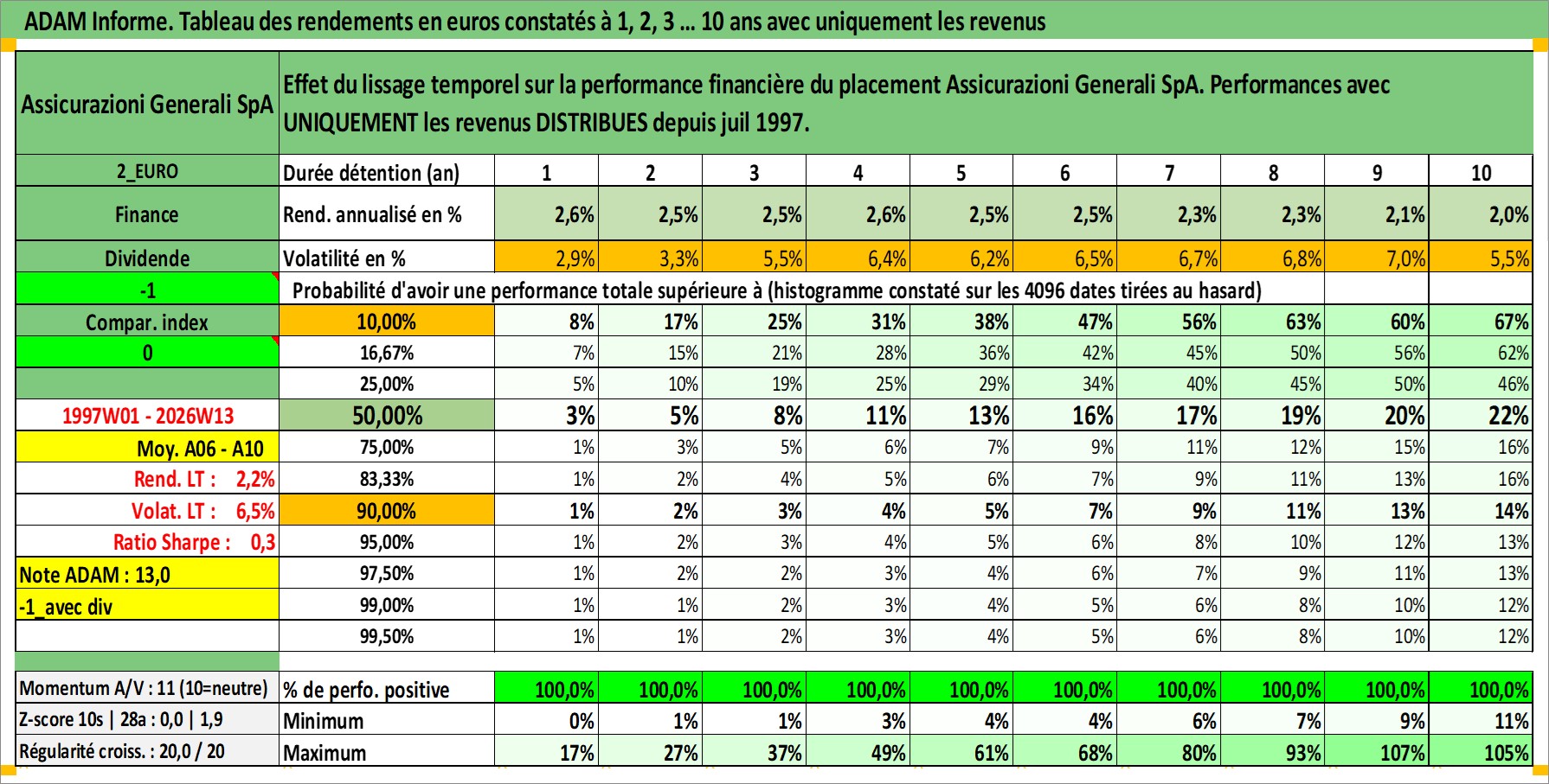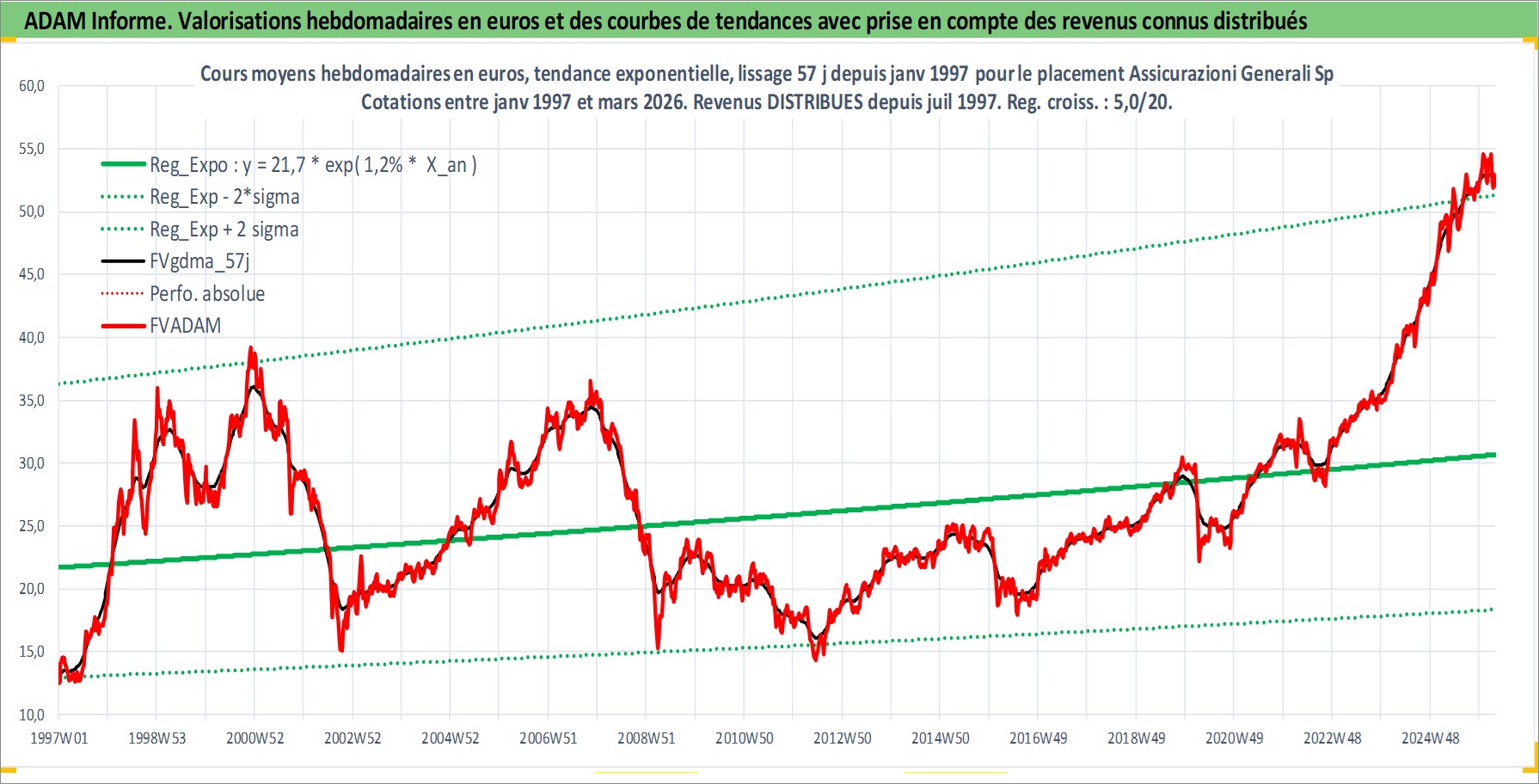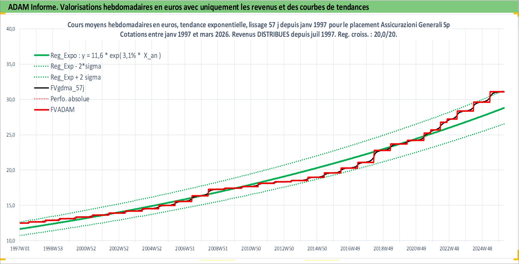 Site dédié aux investisseursPage dédiée sur site financeAnalyse des valorisations hebdomadaires de l'action Assicurazioni Generali SpA. Cet actif est cote en EUR. Les valorisations couvrent les semaines 1997W01 a 2026W13. Les revenus de cet actif financier sont pris en compte depuis la semaine 1997W30. La note globale ESG de cet actif est estimee a 11.0 (apres rebasage entre 0 et 20).