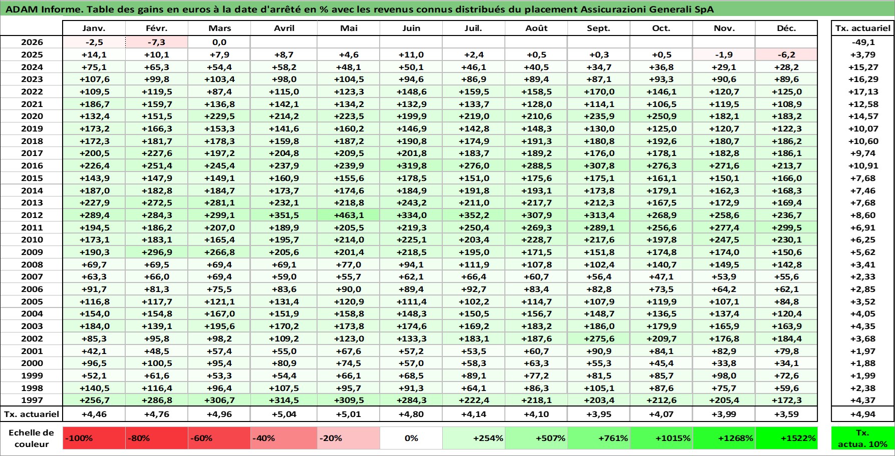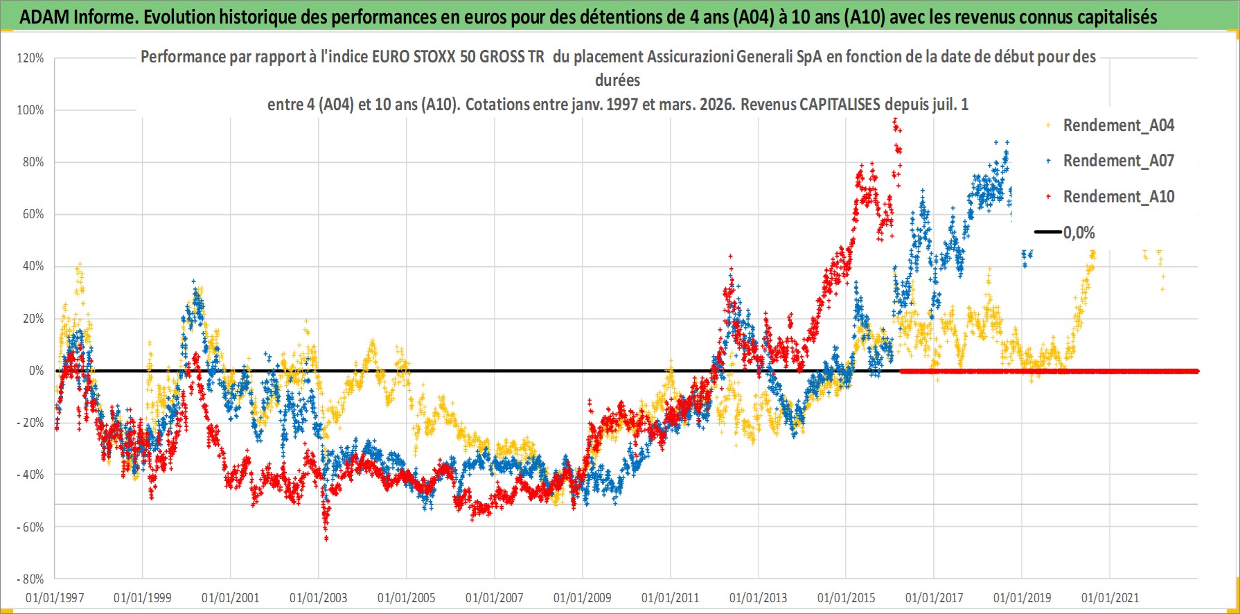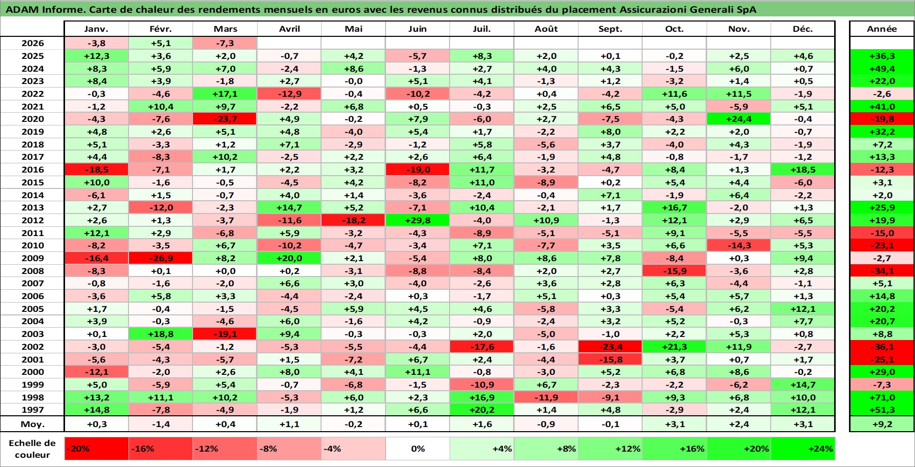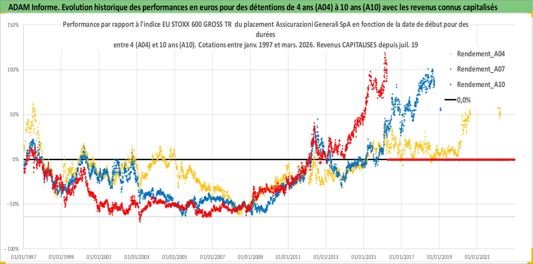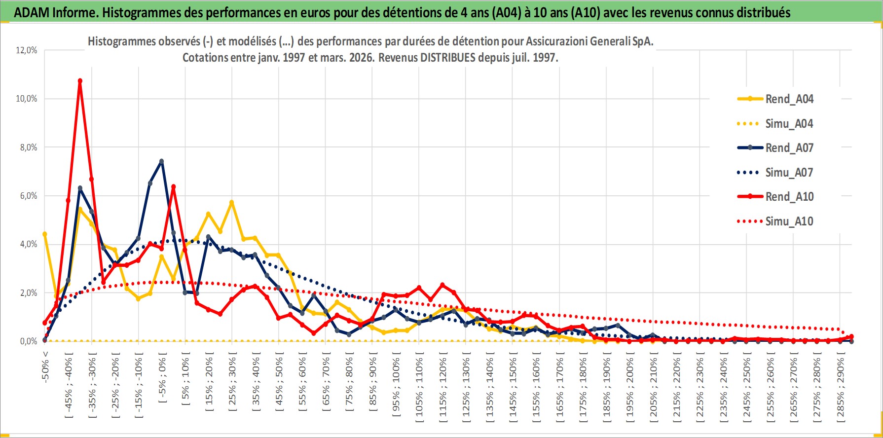 Site dédié aux investisseursPage dédiée sur site financeAnalyse des valorisations hebdomadaires de l'action Assicurazioni Generali SpA. Cet actif est cote en EUR. Les valorisations couvrent les semaines 1997W01 a 2026W13. Les revenus de cet actif financier sont pris en compte depuis la semaine 1997W30. La note globale ESG de cet actif est estimee a 11.0 (apres rebasage entre 0 et 20).