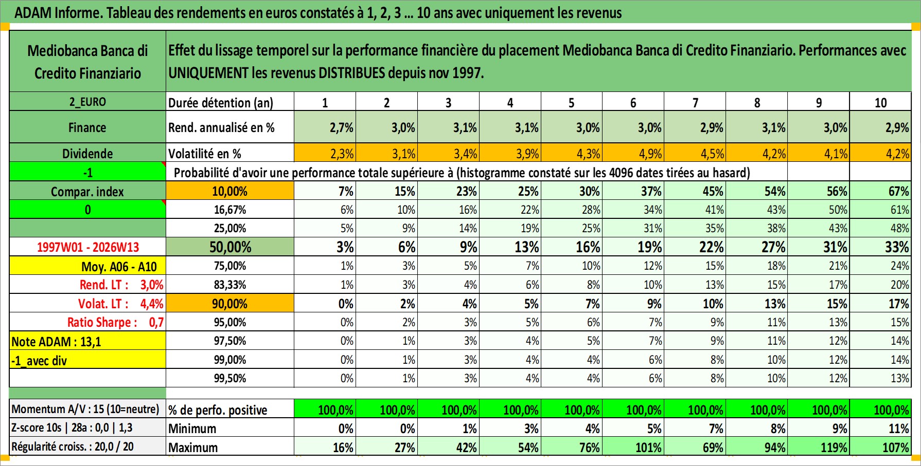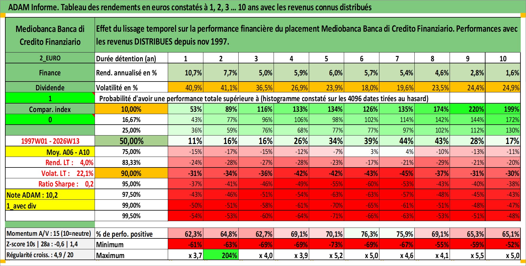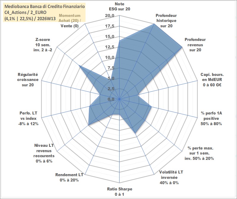 Site dédié aux investisseursPage dédiée sur site financeAnalyse des valorisations hebdomadaires de l'action Mediobanca Banca di Credito Finanziario. Cet actif est cote en EUR. Les valorisations couvrent les semaines 1997W01 a 2026W13. Les revenus de cet actif financier sont pris en compte depuis la semaine 1997W48. La note globale ESG de cet actif est estimee a 14.0 (apres rebasage entre 0 et 20).