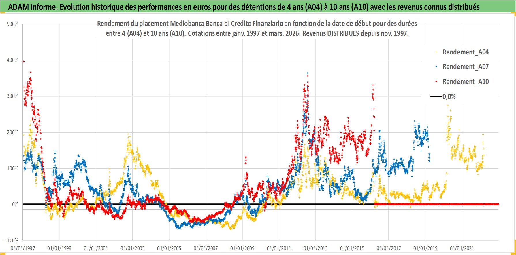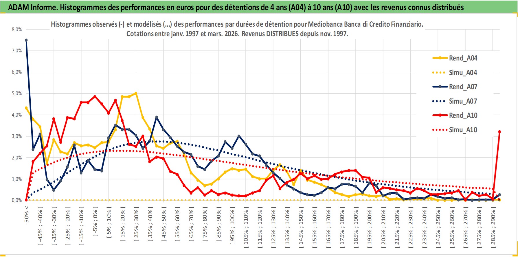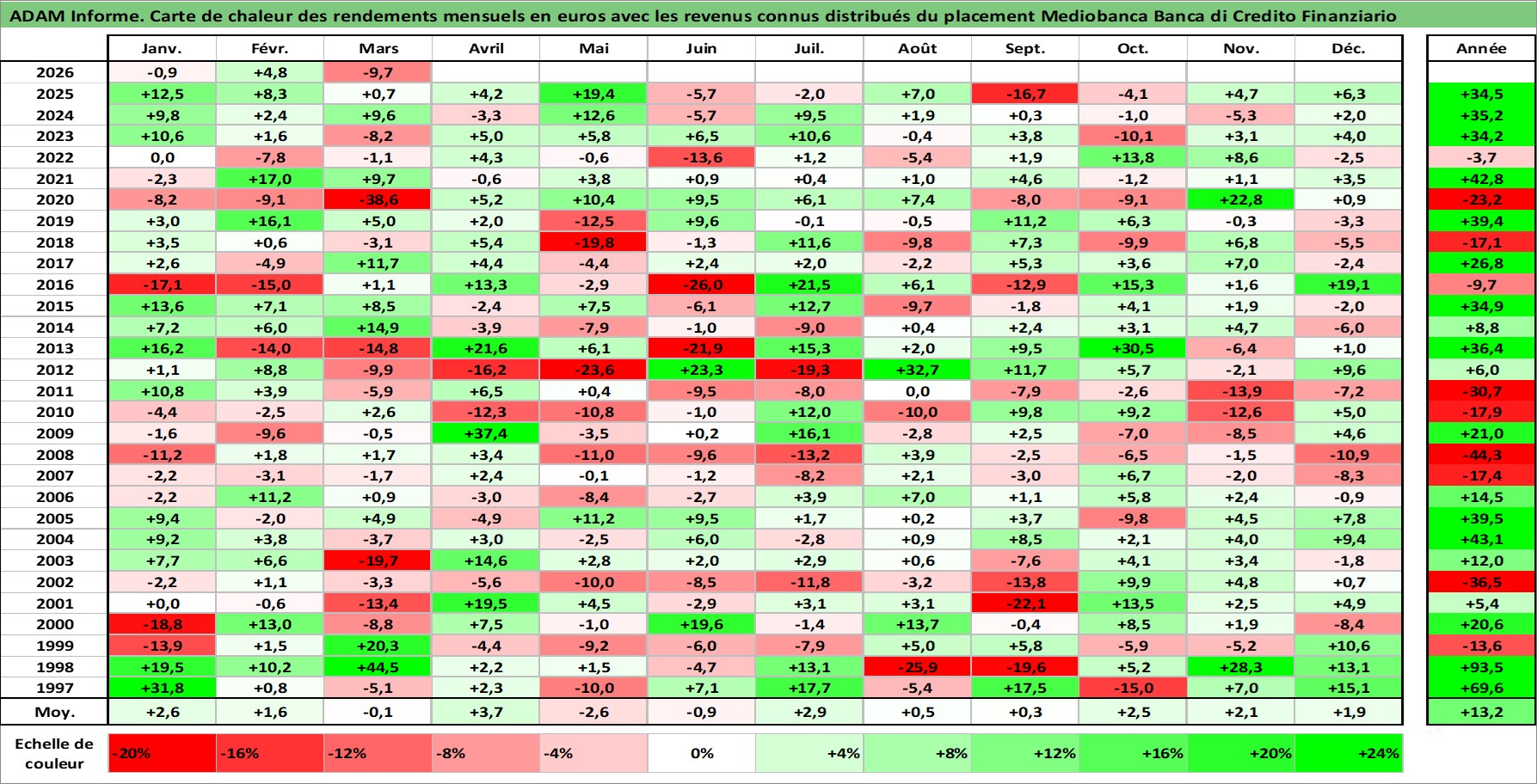 Site dédié aux investisseursPage dédiée sur site financeAnalyse des valorisations hebdomadaires de l'action Mediobanca Banca di Credito Finanziario. Cet actif est cote en EUR. Les valorisations couvrent les semaines 1997W01 a 2026W13. Les revenus de cet actif financier sont pris en compte depuis la semaine 1997W48. La note globale ESG de cet actif est estimee a 14.0 (apres rebasage entre 0 et 20).
