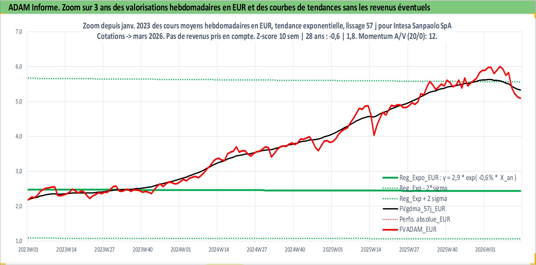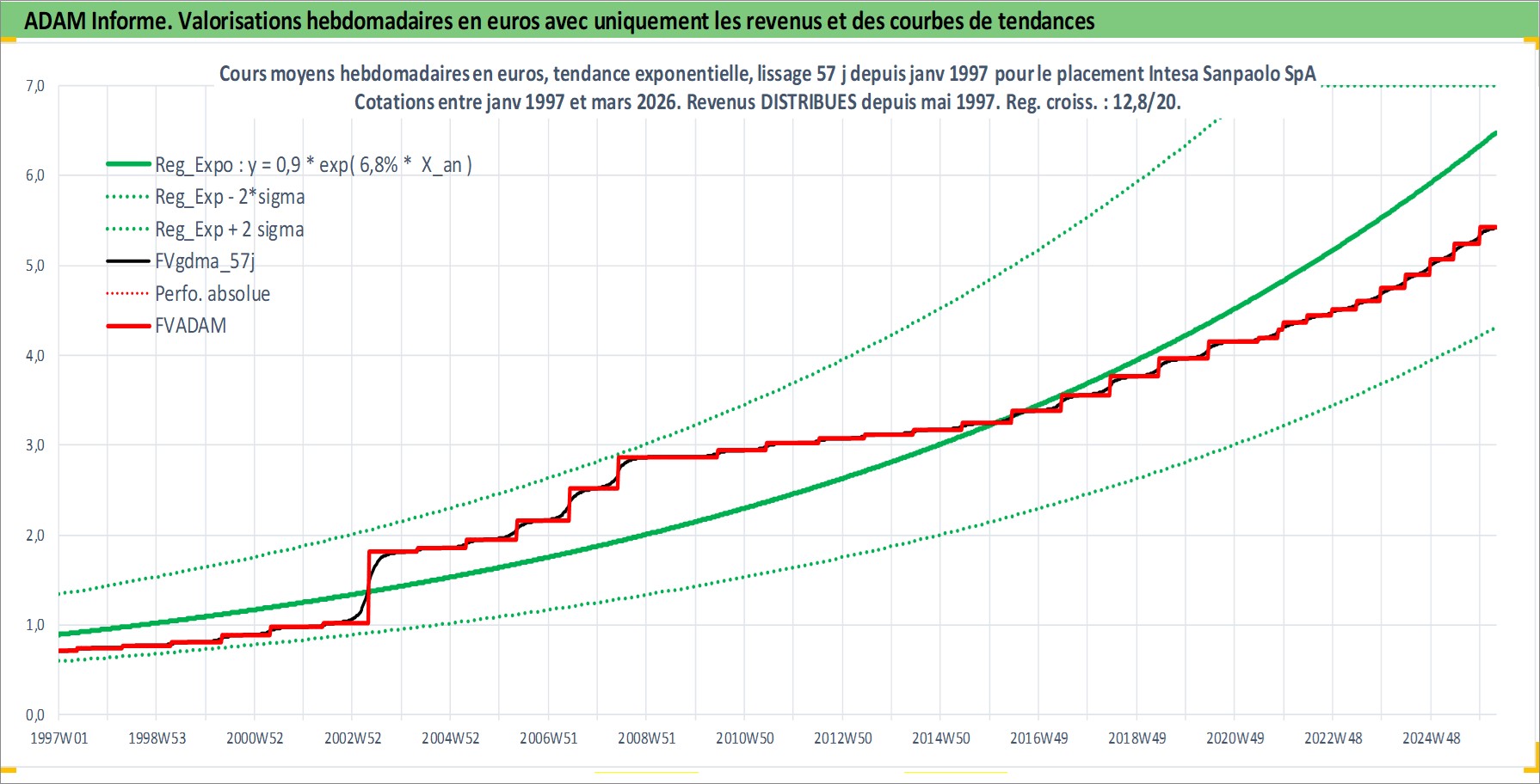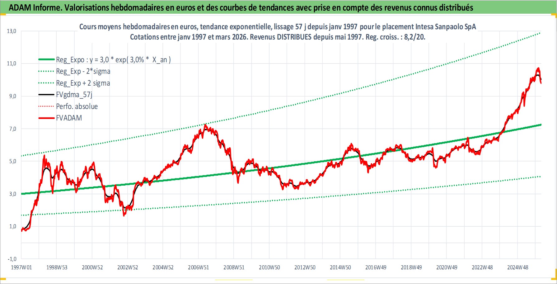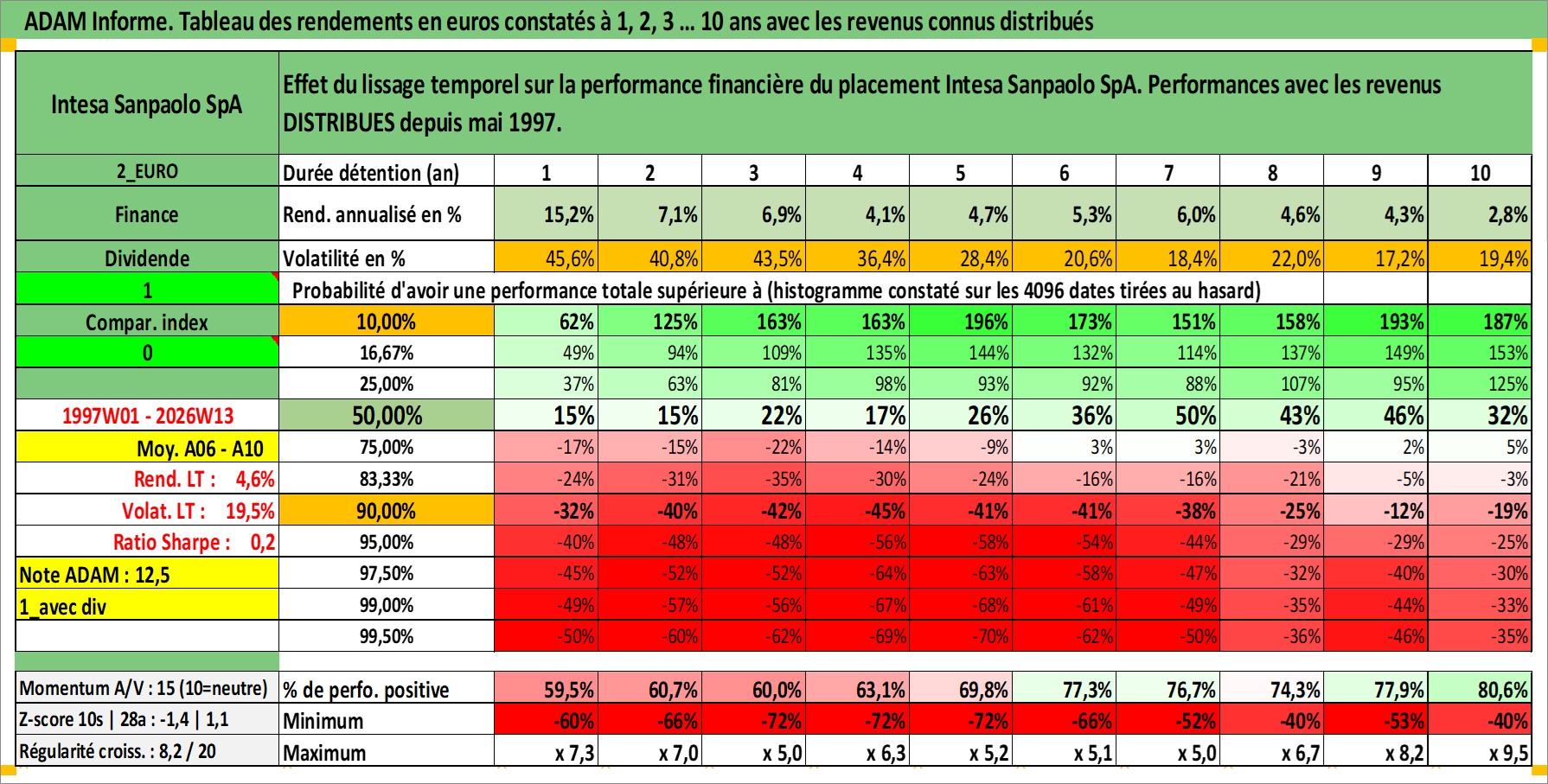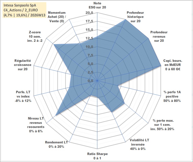 Site dédié aux investisseursPage dédiée sur site financeAnalyse des valorisations hebdomadaires de l'action Intesa Sanpaolo SpA. Cet actif est cote en EUR. Les valorisations couvrent les semaines 1997W01 a 2026W13. Les revenus de cet actif financier sont pris en compte depuis la semaine 1997W21. La note globale ESG de cet actif est estimee a 13.0 (apres rebasage entre 0 et 20).