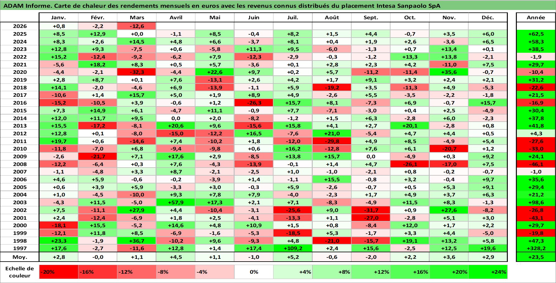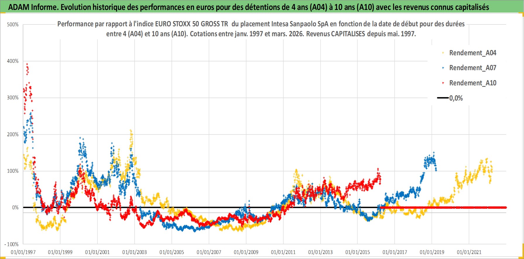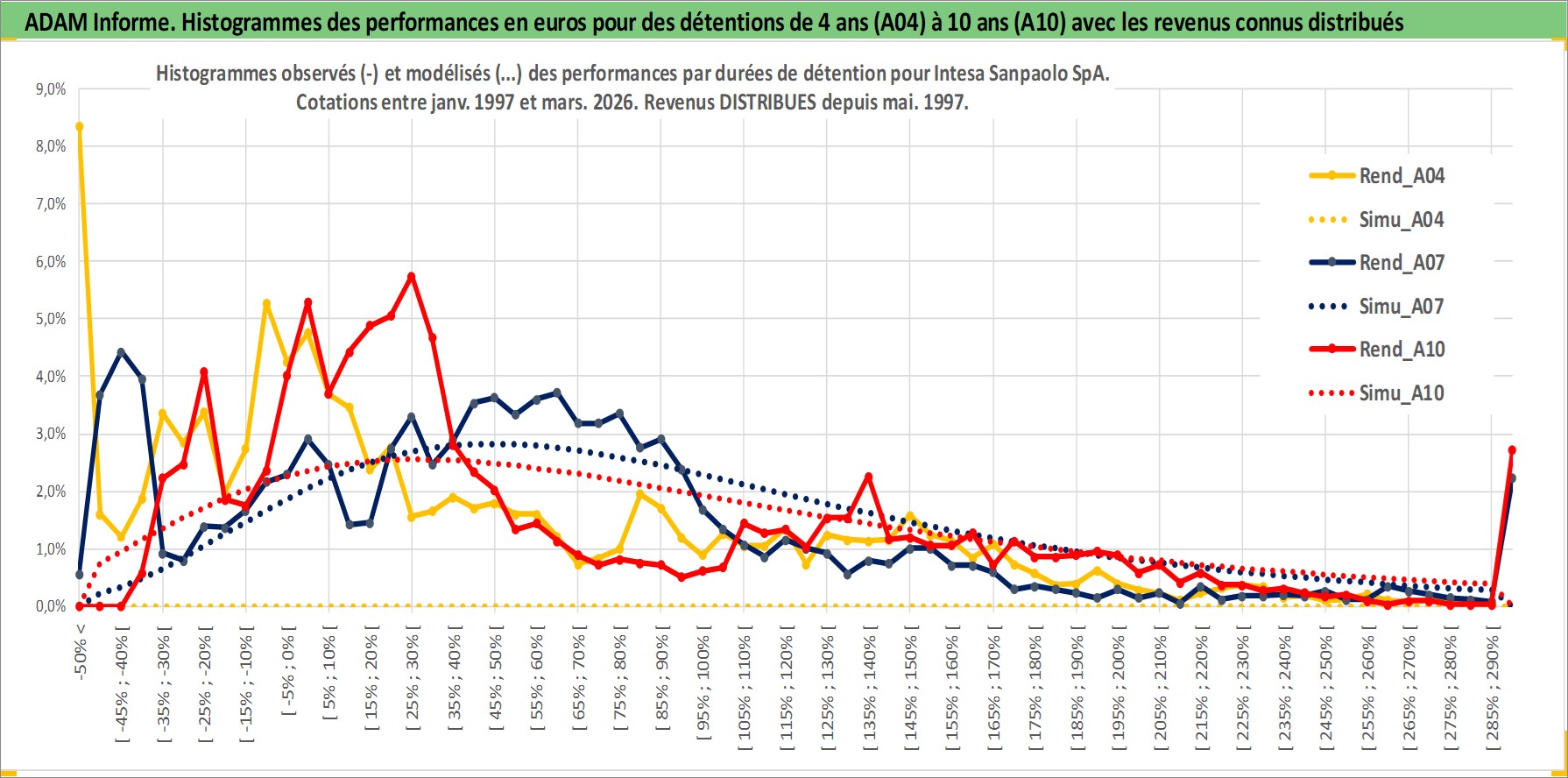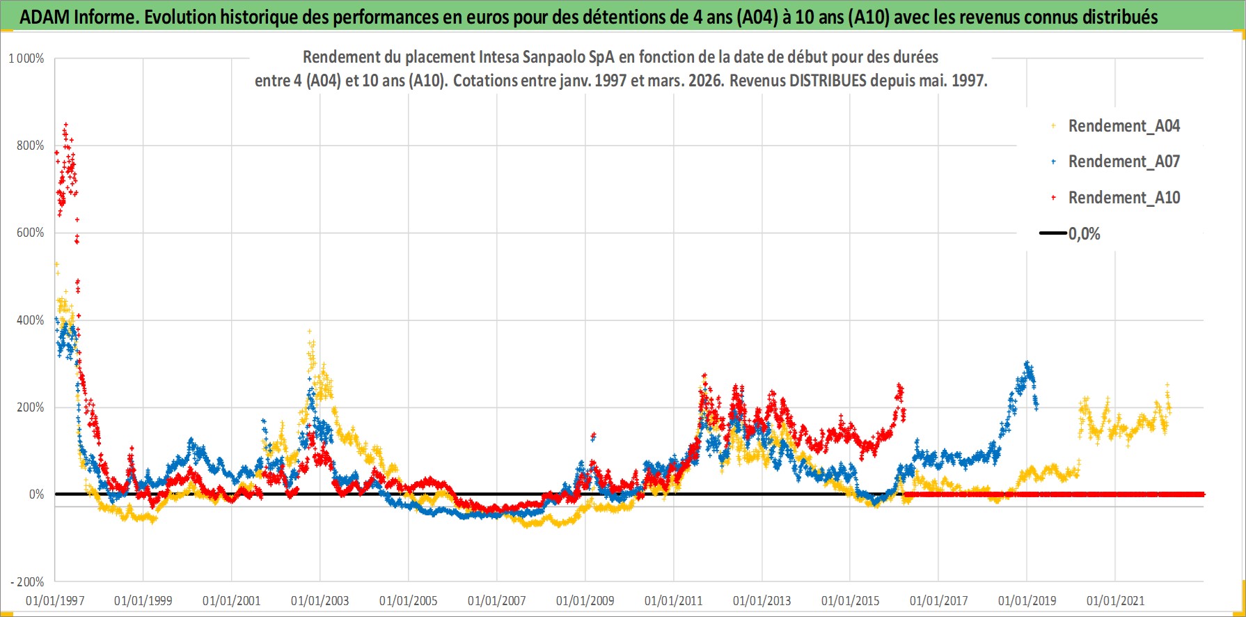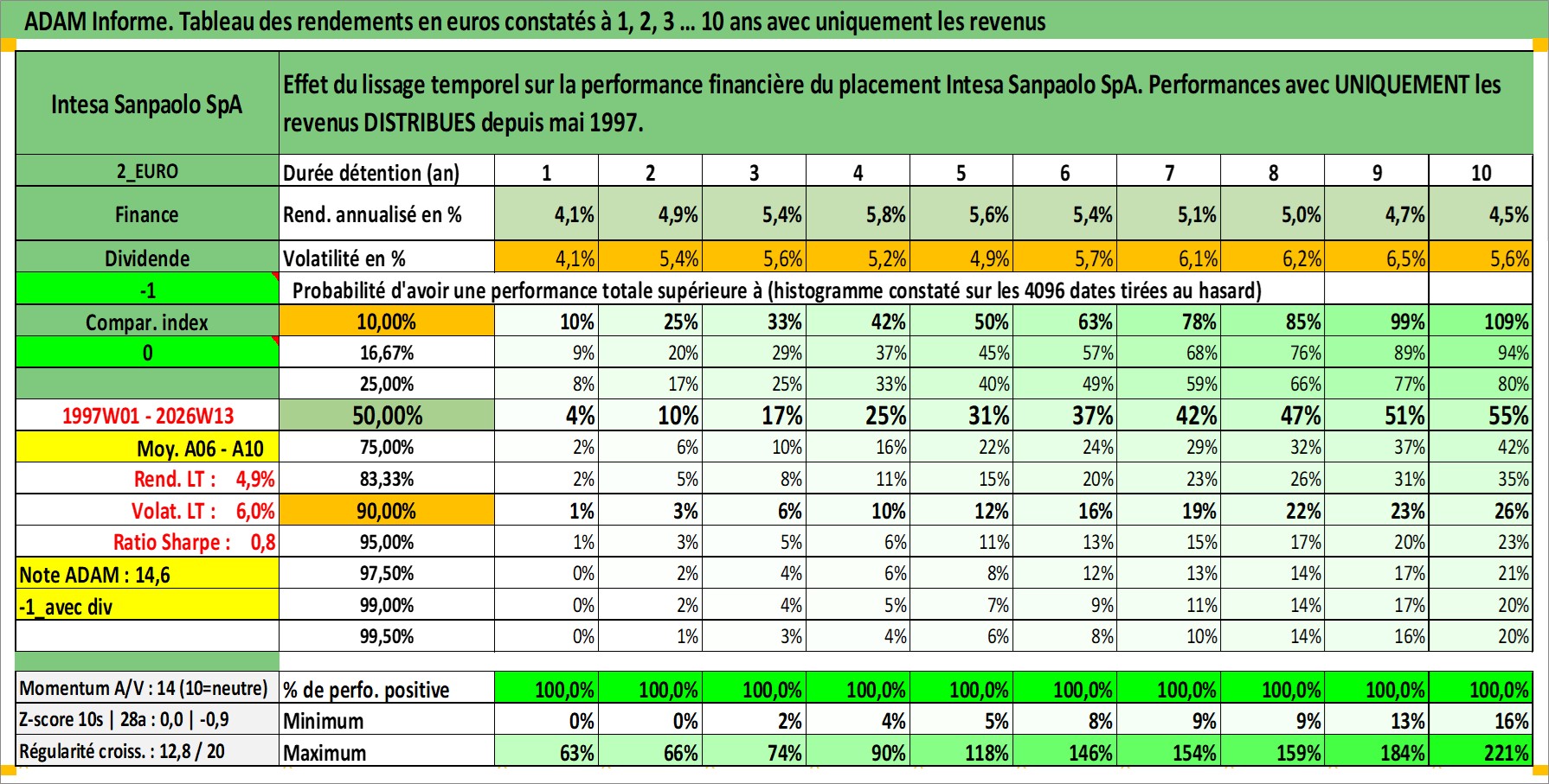 Site dédié aux investisseursPage dédiée sur site financeAnalyse des valorisations hebdomadaires de l'action Intesa Sanpaolo SpA. Cet actif est cote en EUR. Les valorisations couvrent les semaines 1997W01 a 2026W13. Les revenus de cet actif financier sont pris en compte depuis la semaine 1997W21. La note globale ESG de cet actif est estimee a 13.0 (apres rebasage entre 0 et 20).
