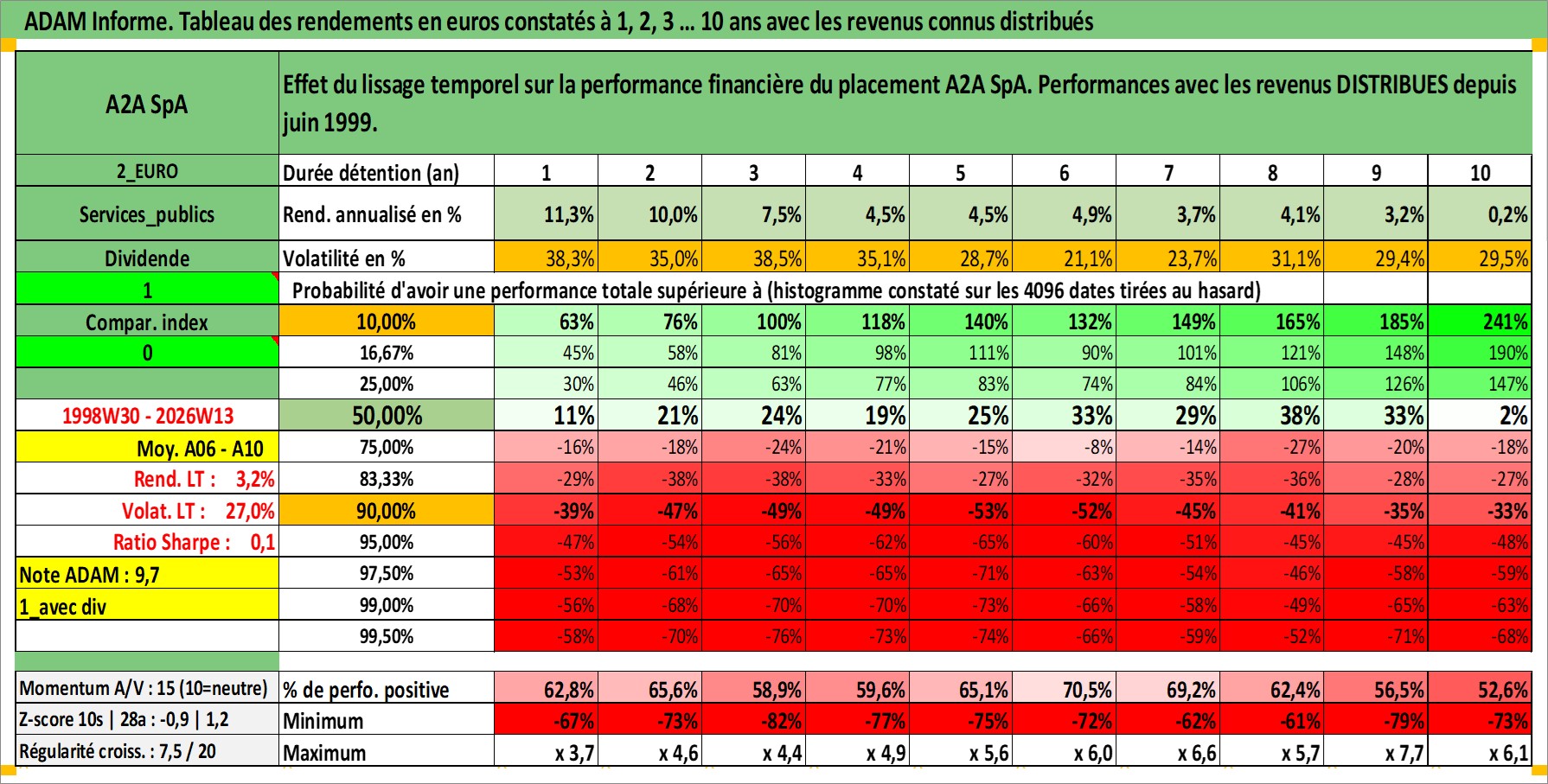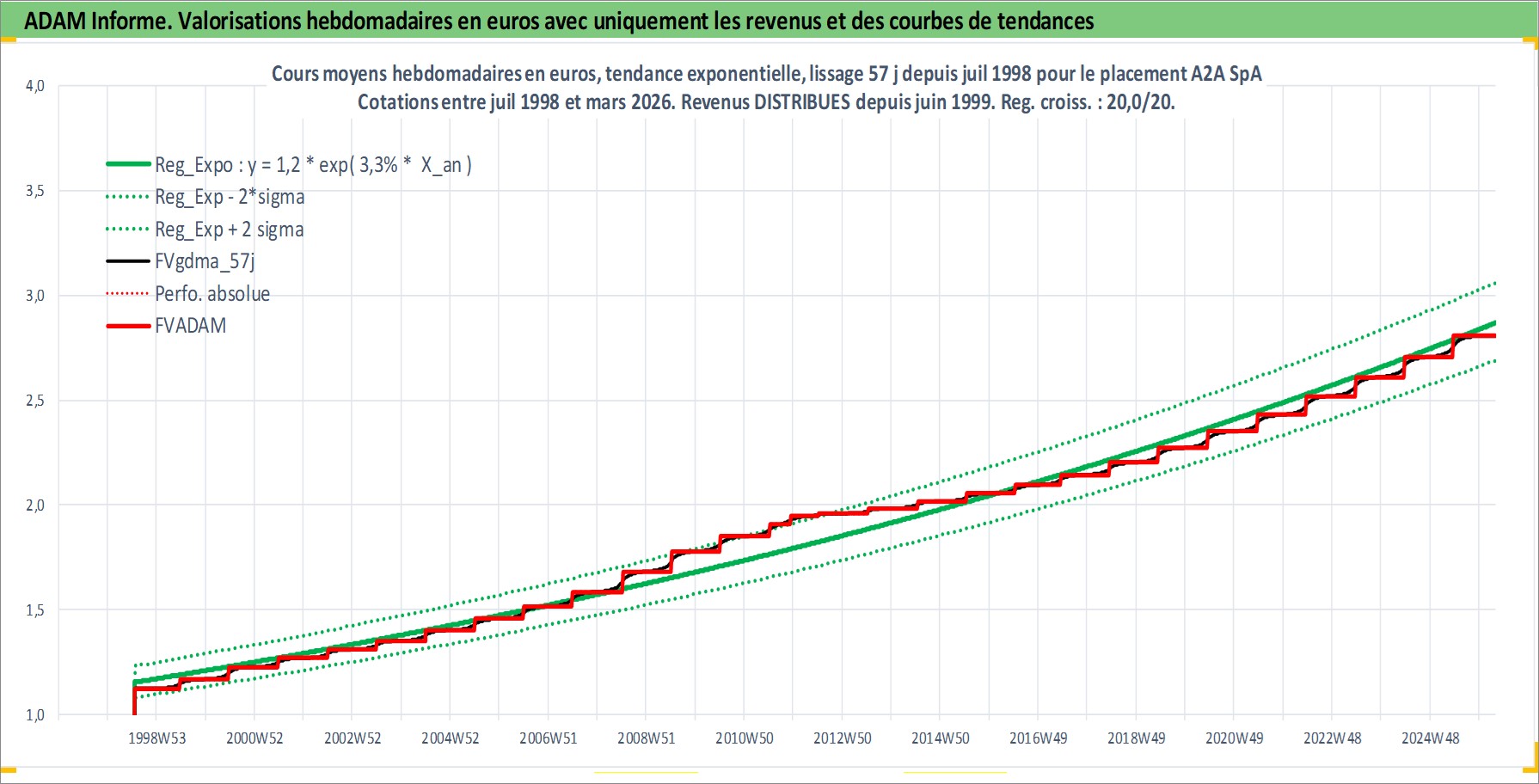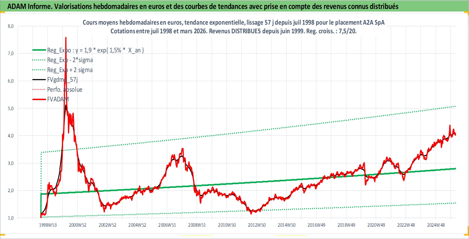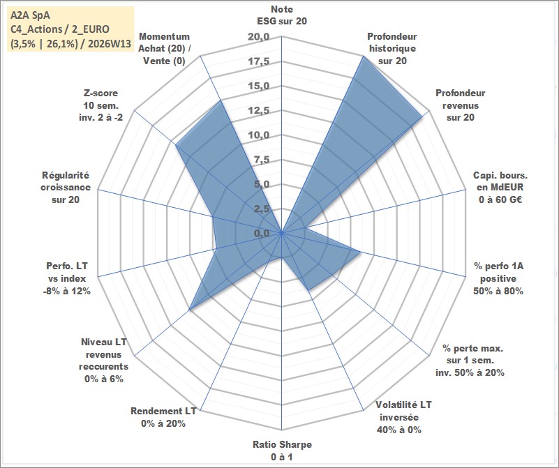 Site dédié aux investisseursPage dédiée sur site financeAnalyse des valorisations hebdomadaires de l'action A2A SpA. Cet actif est cote en EUR. Les valorisations couvrent les semaines 1998W30 a 2026W13. Les revenus de cet actif financier sont pris en compte depuis la semaine 1999W25. La note ESG de cet actif n'est pas connue.