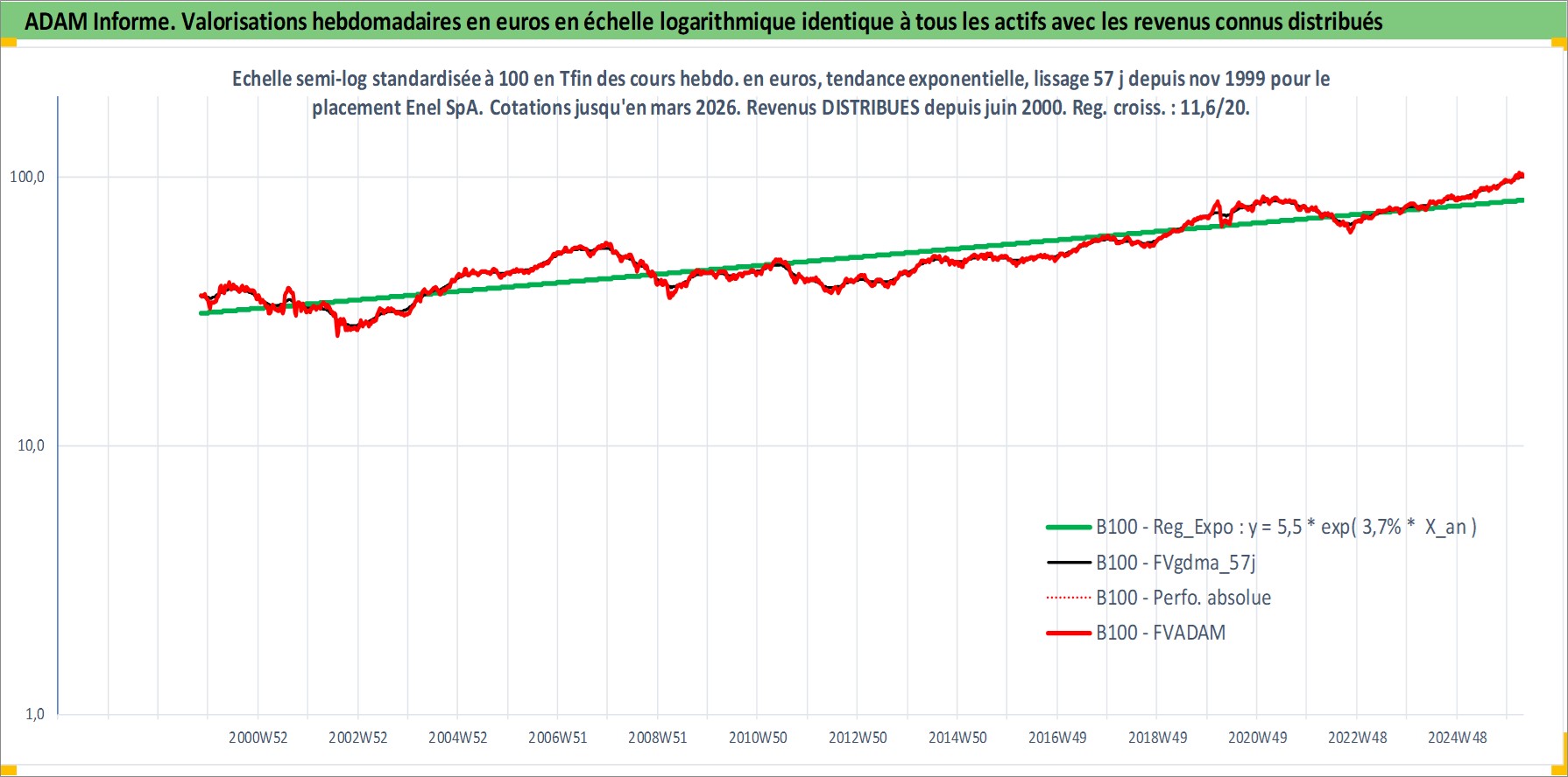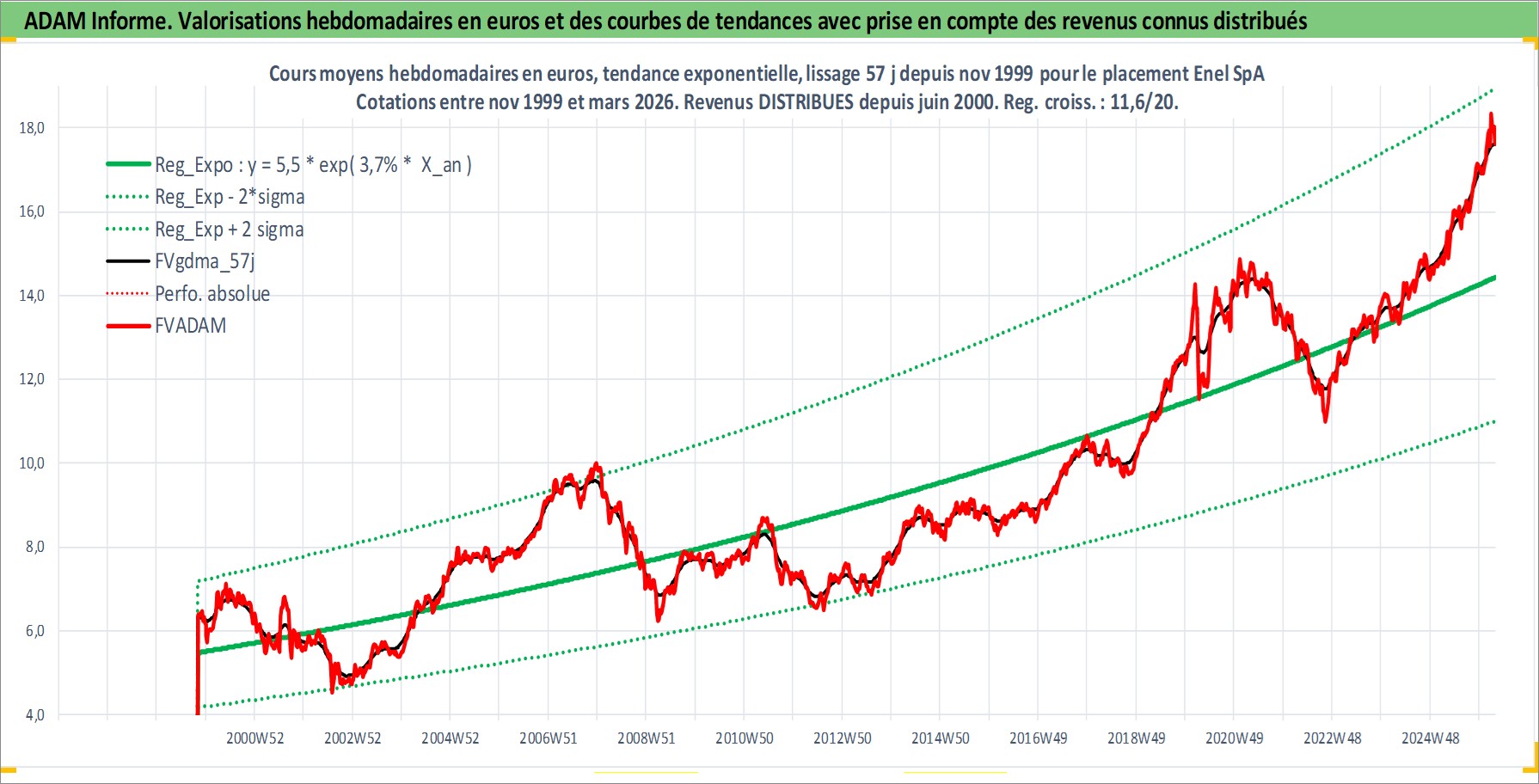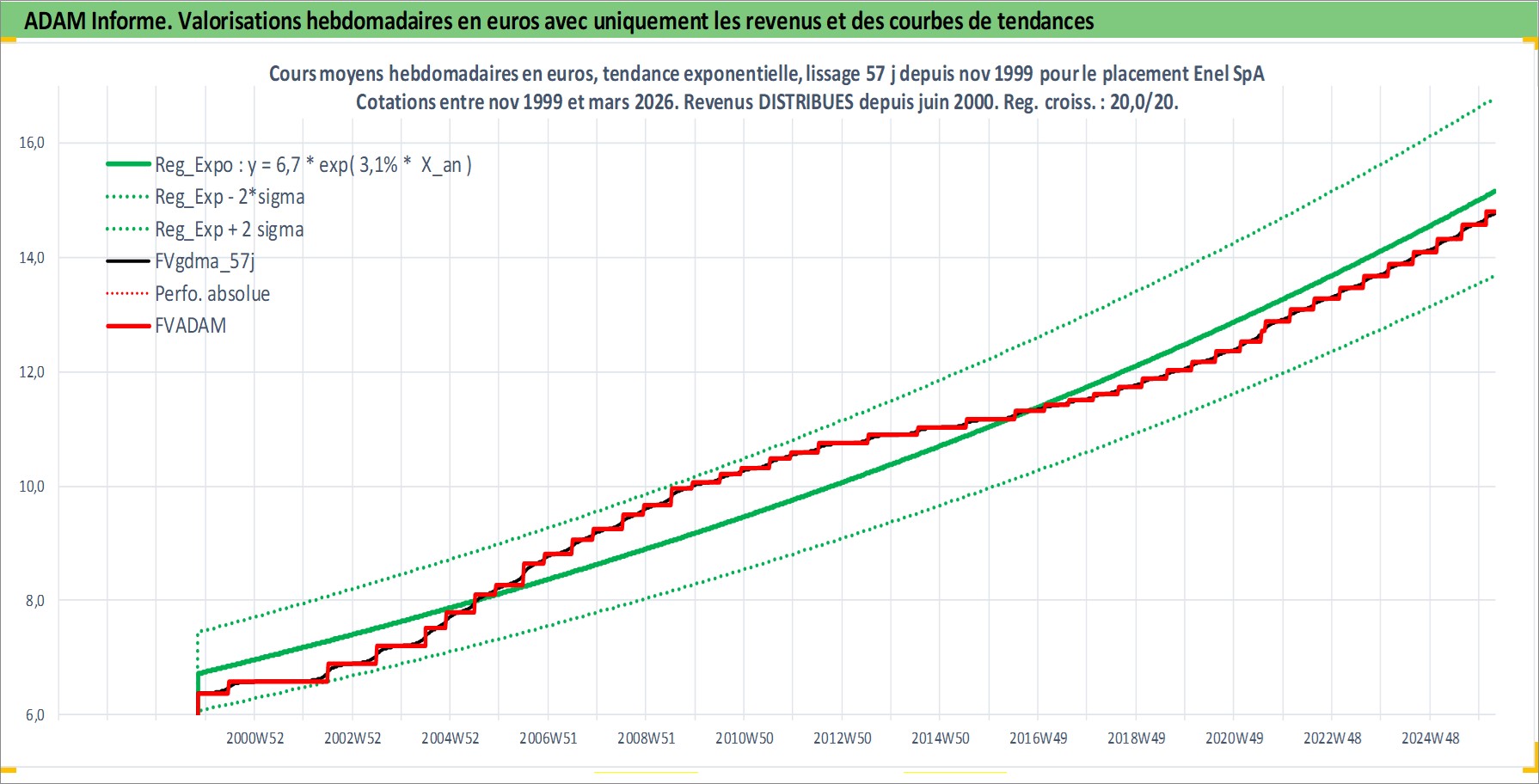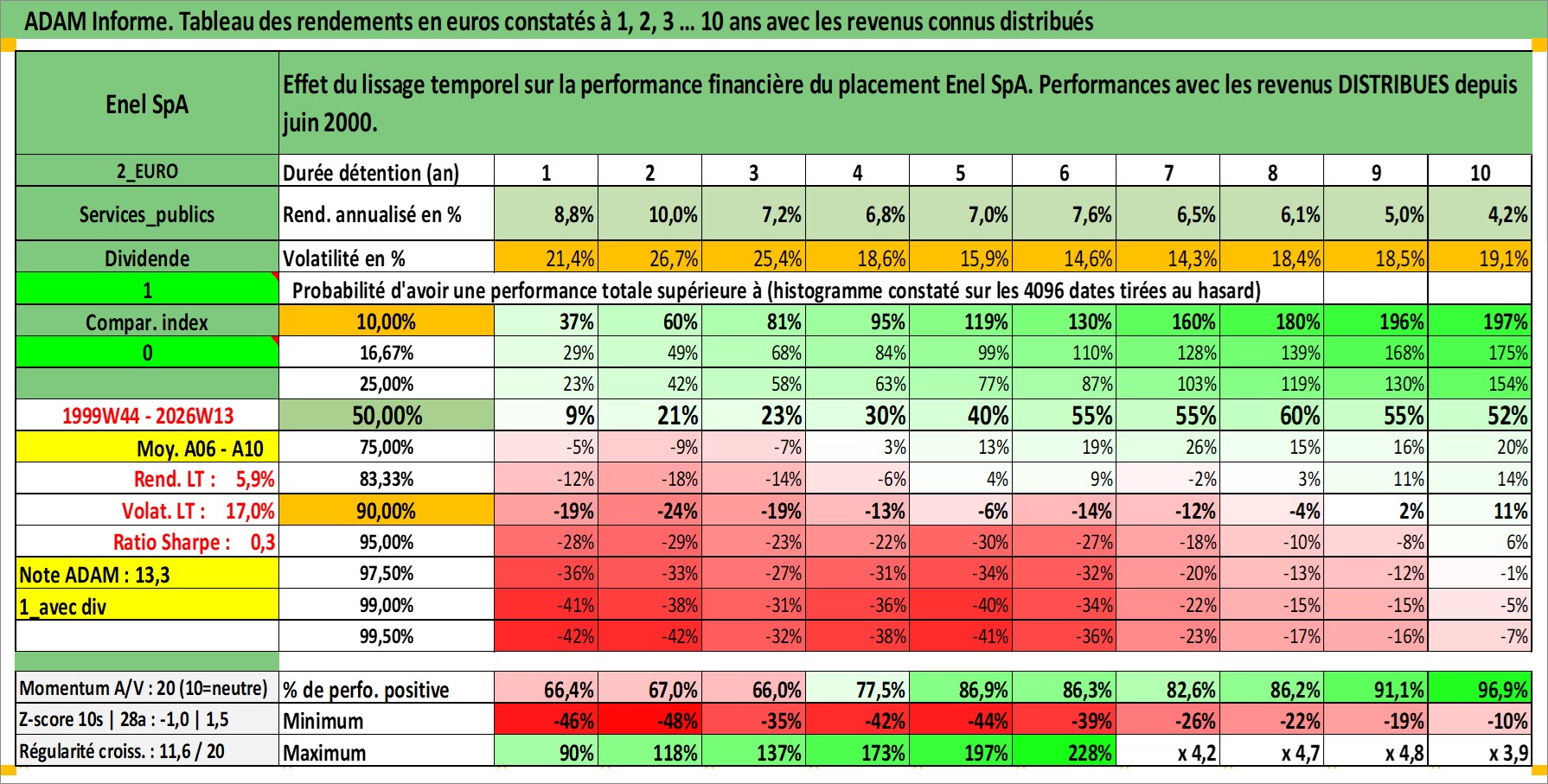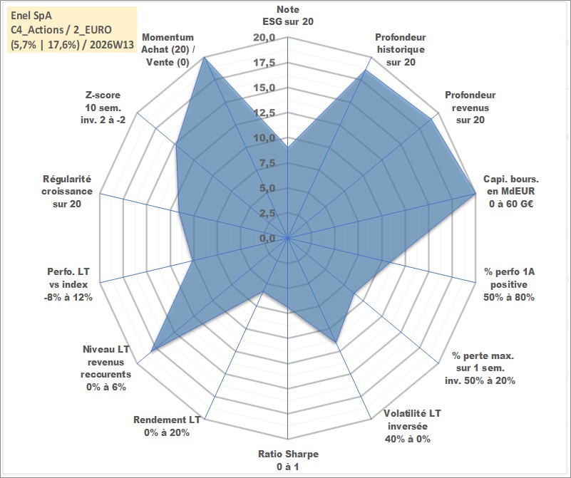 Site dédié aux investisseursPage dédiée sur site financeAnalyse des valorisations hebdomadaires de l'action Enel SpA. Cet actif est cote en EUR. Les valorisations couvrent les semaines 1999W44 a 2026W13. Les revenus de cet actif financier sont pris en compte depuis la semaine 2000W25. La note globale ESG de cet actif est estimee a 9.0 (apres rebasage entre 0 et 20).