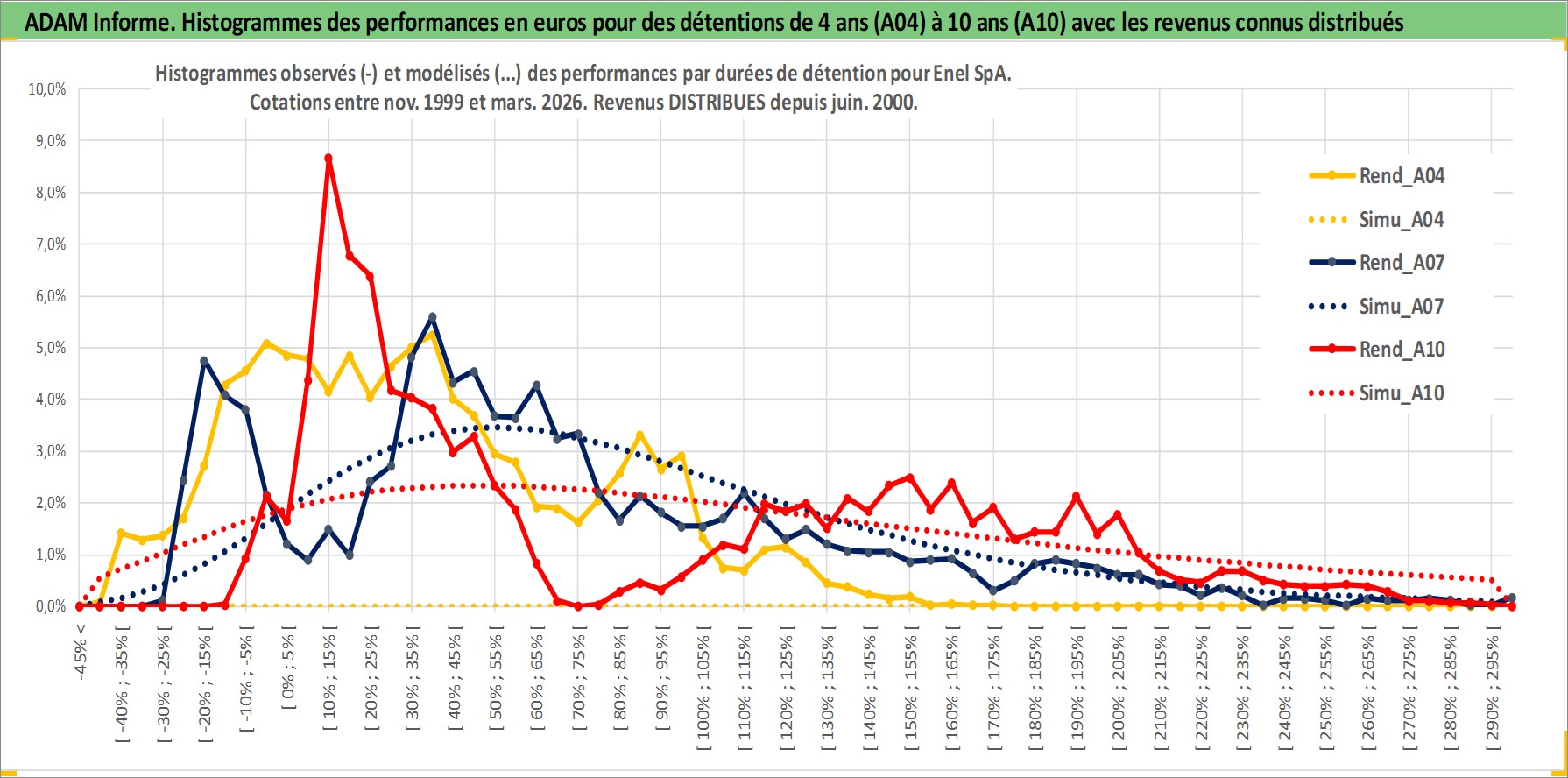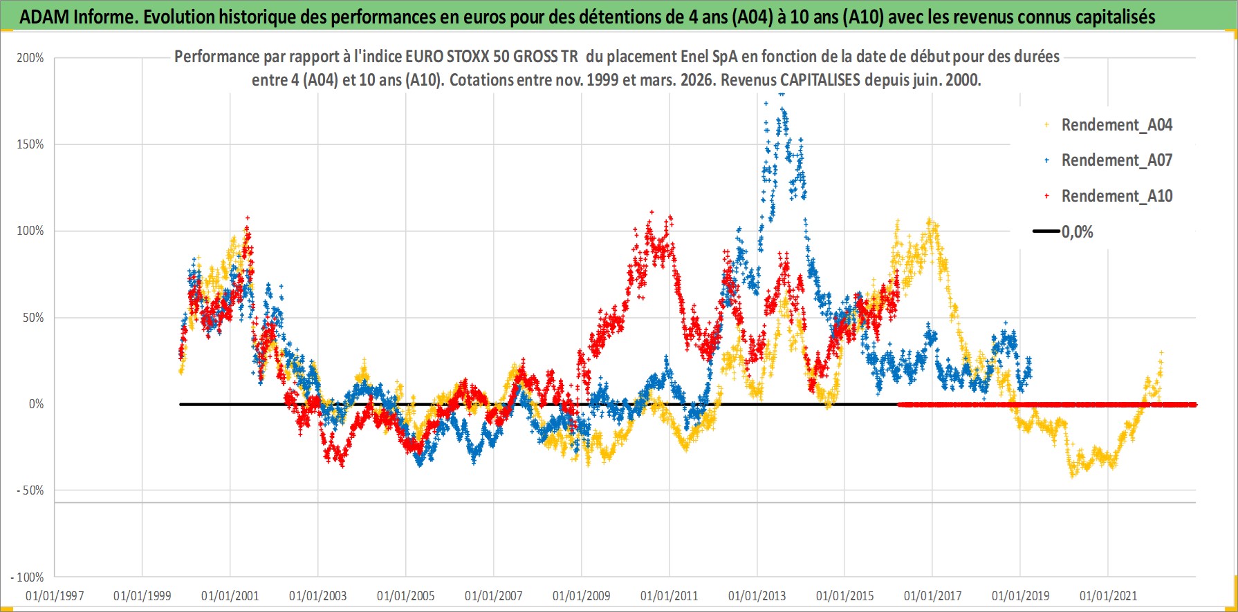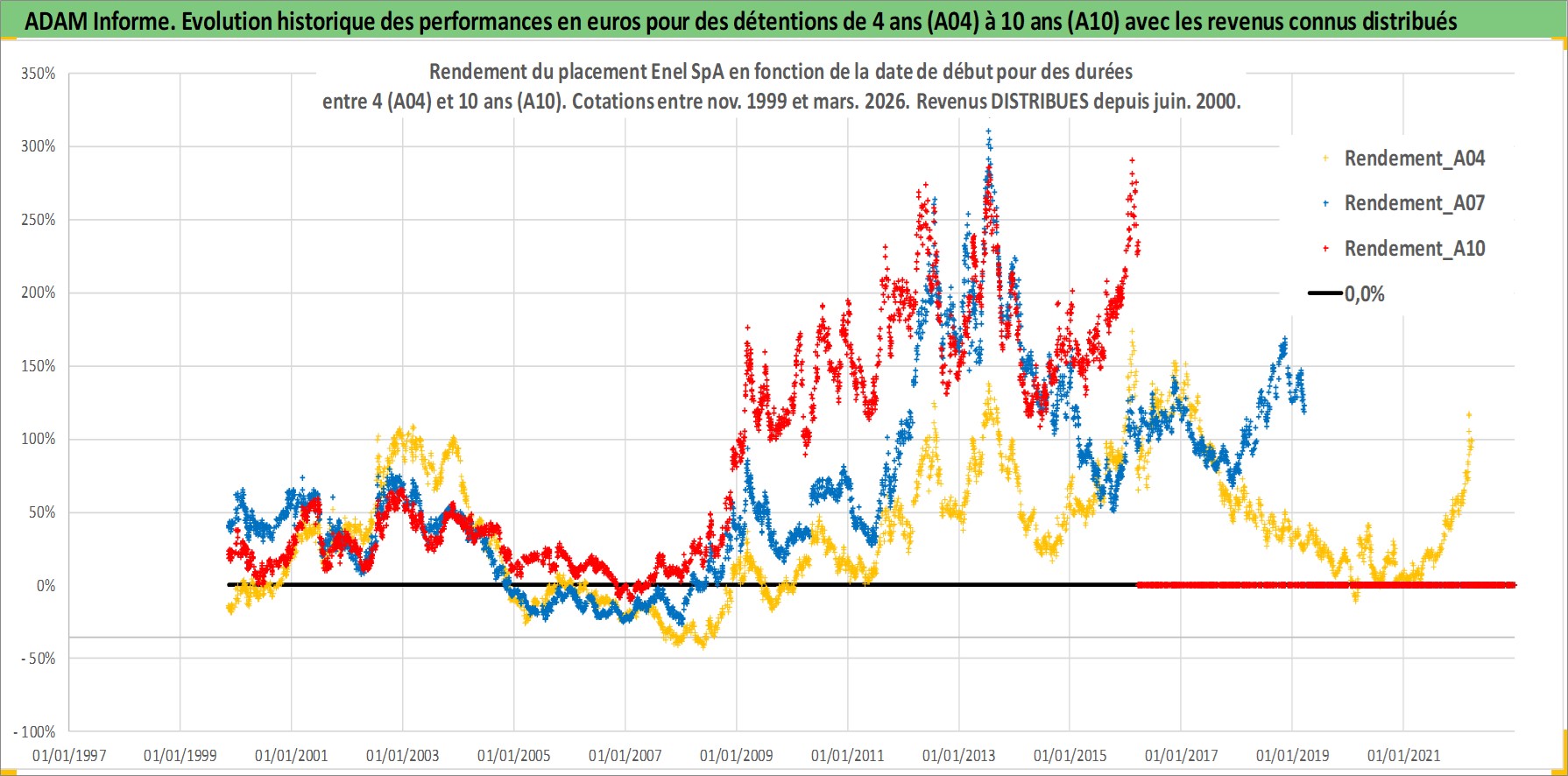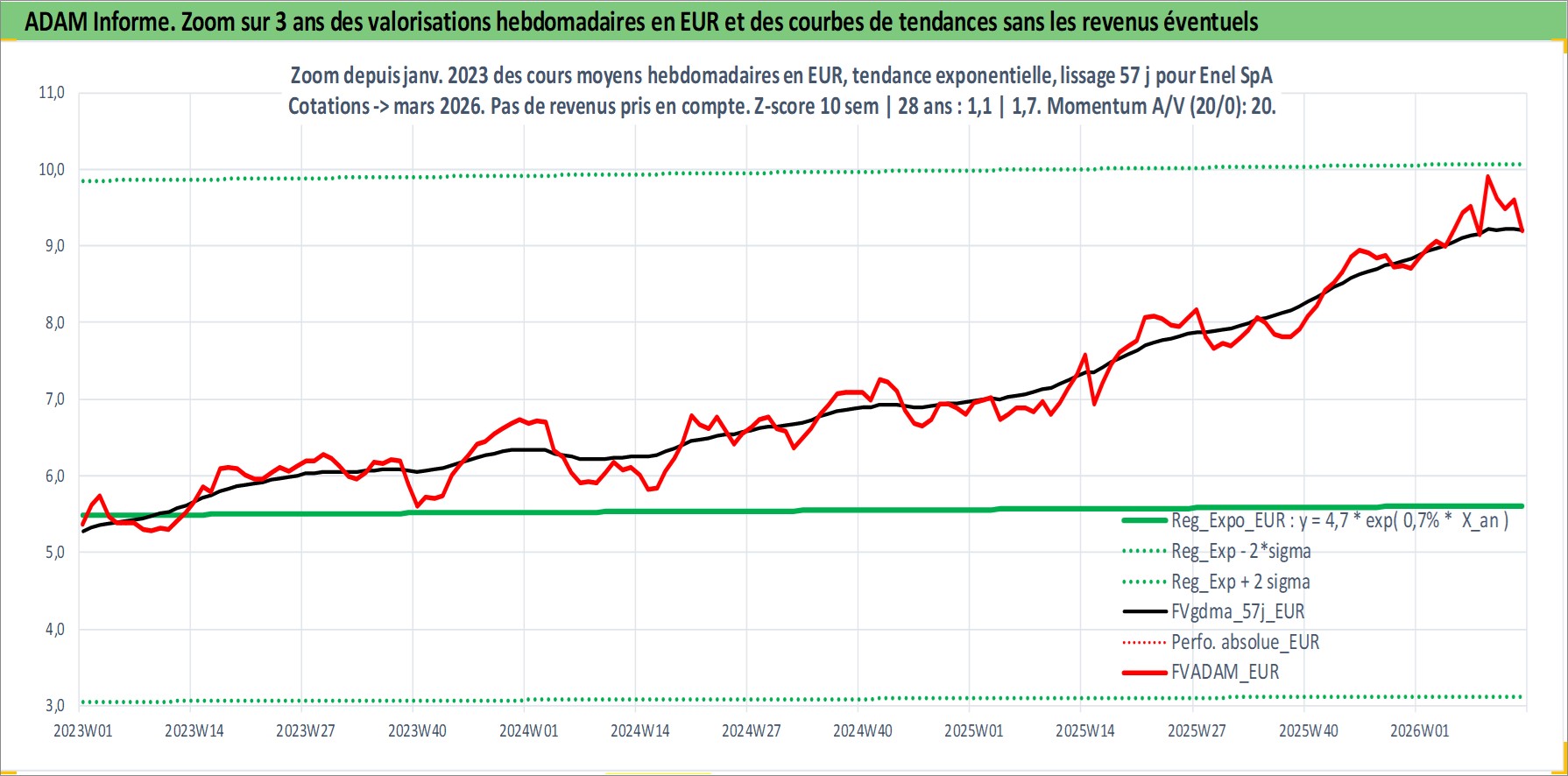 Site dédié aux investisseursPage dédiée sur site financeAnalyse des valorisations hebdomadaires de l'action Enel SpA. Cet actif est cote en EUR. Les valorisations couvrent les semaines 1999W44 a 2026W13. Les revenus de cet actif financier sont pris en compte depuis la semaine 2000W25. La note globale ESG de cet actif est estimee a 9.0 (apres rebasage entre 0 et 20).