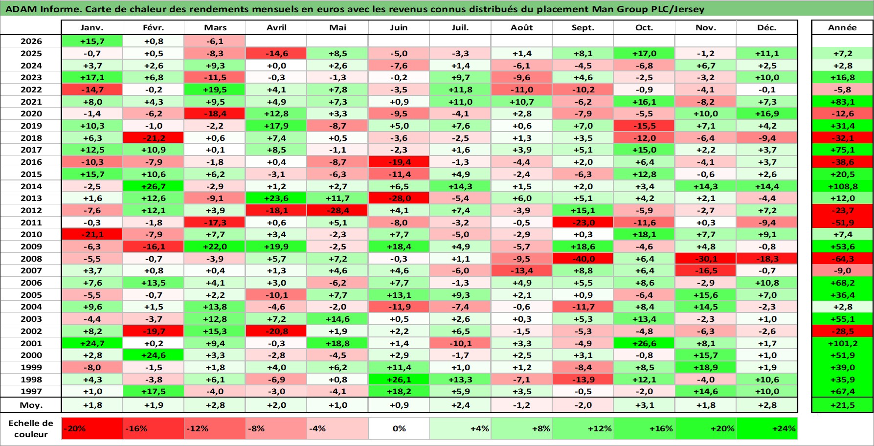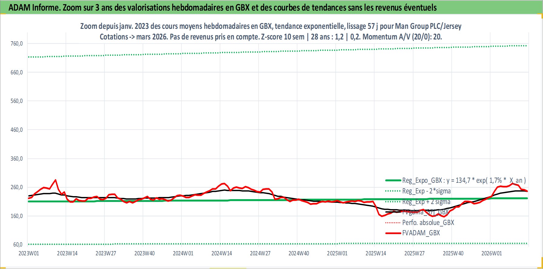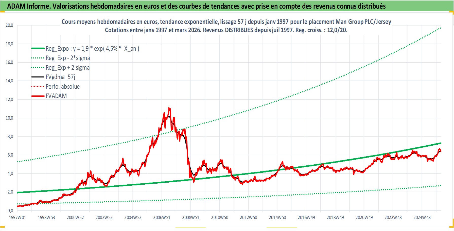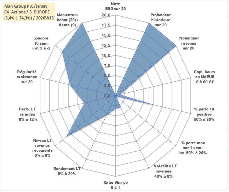 Site dédié aux investisseursPage dédiée sur site financeAnalyse des valorisations hebdomadaires de l'action Man Group PLC/Jersey. Cet actif est cote en GBX. Les valorisations sont en contrevaleur EURO et couvrent les semaines 1997W01 a 2026W13. Les revenus de cet actif financier sont pris en compte depuis la semaine 1997W29. La note ESG de cet actif n'est pas connue.