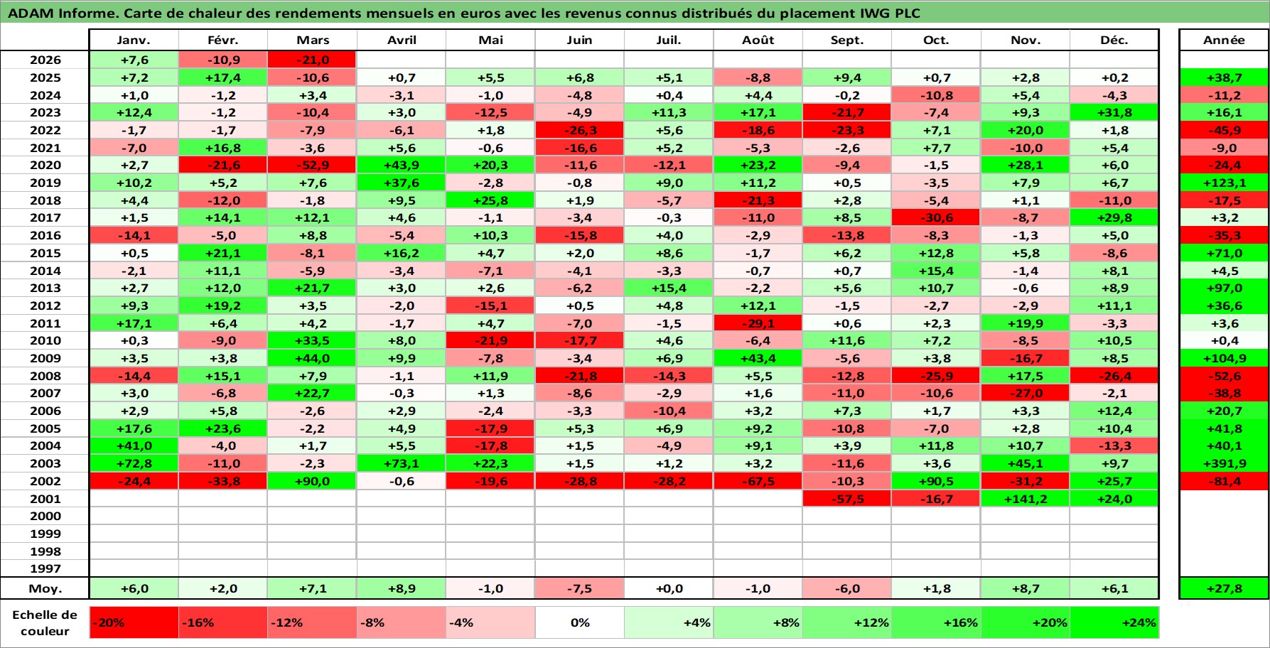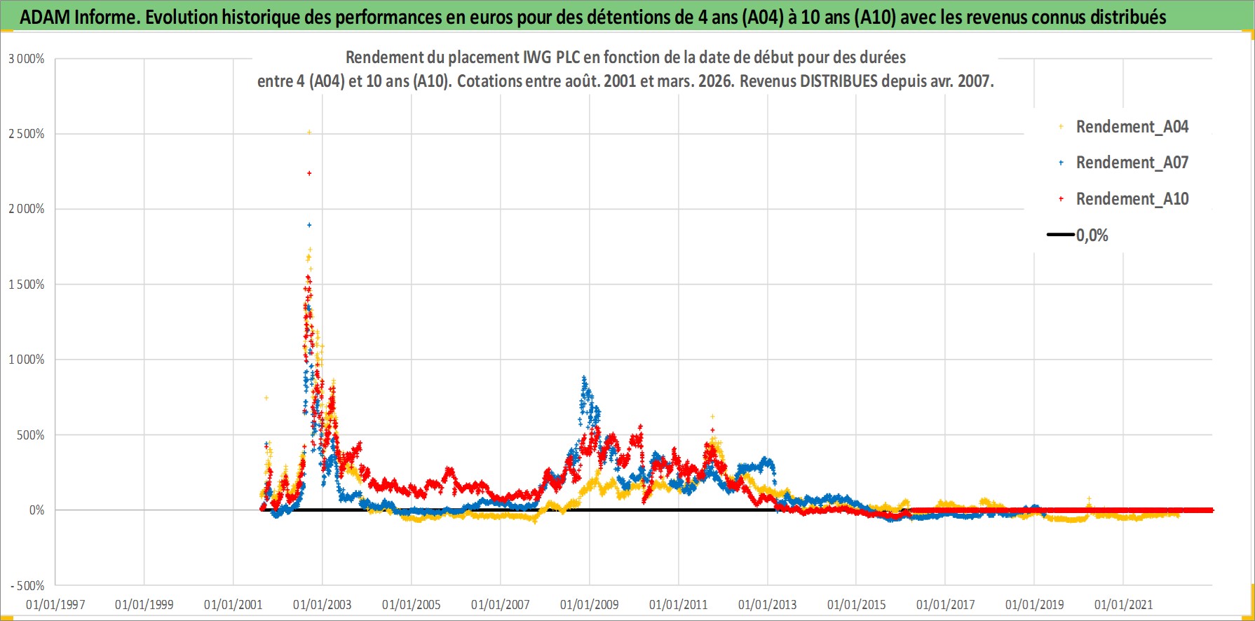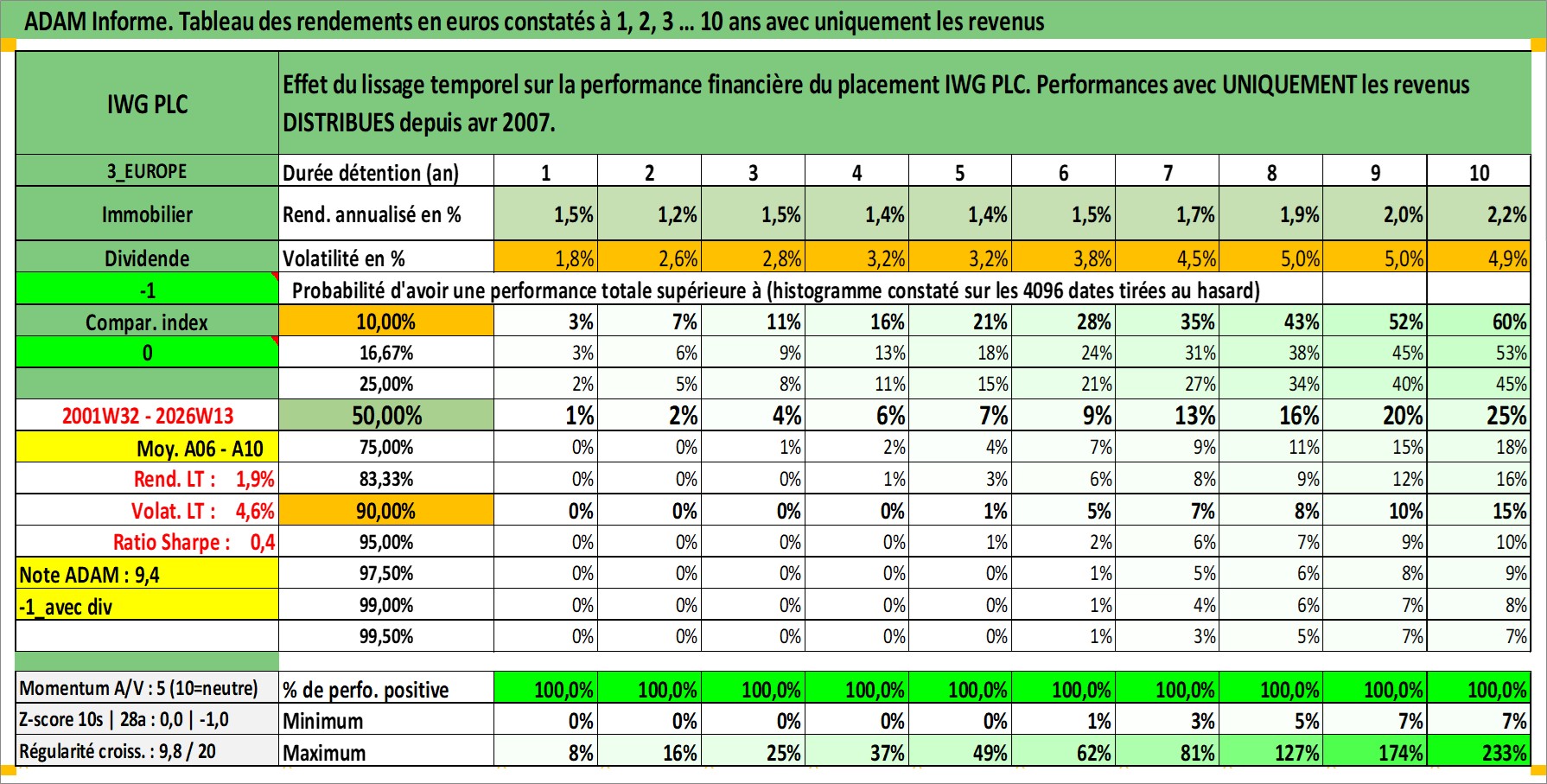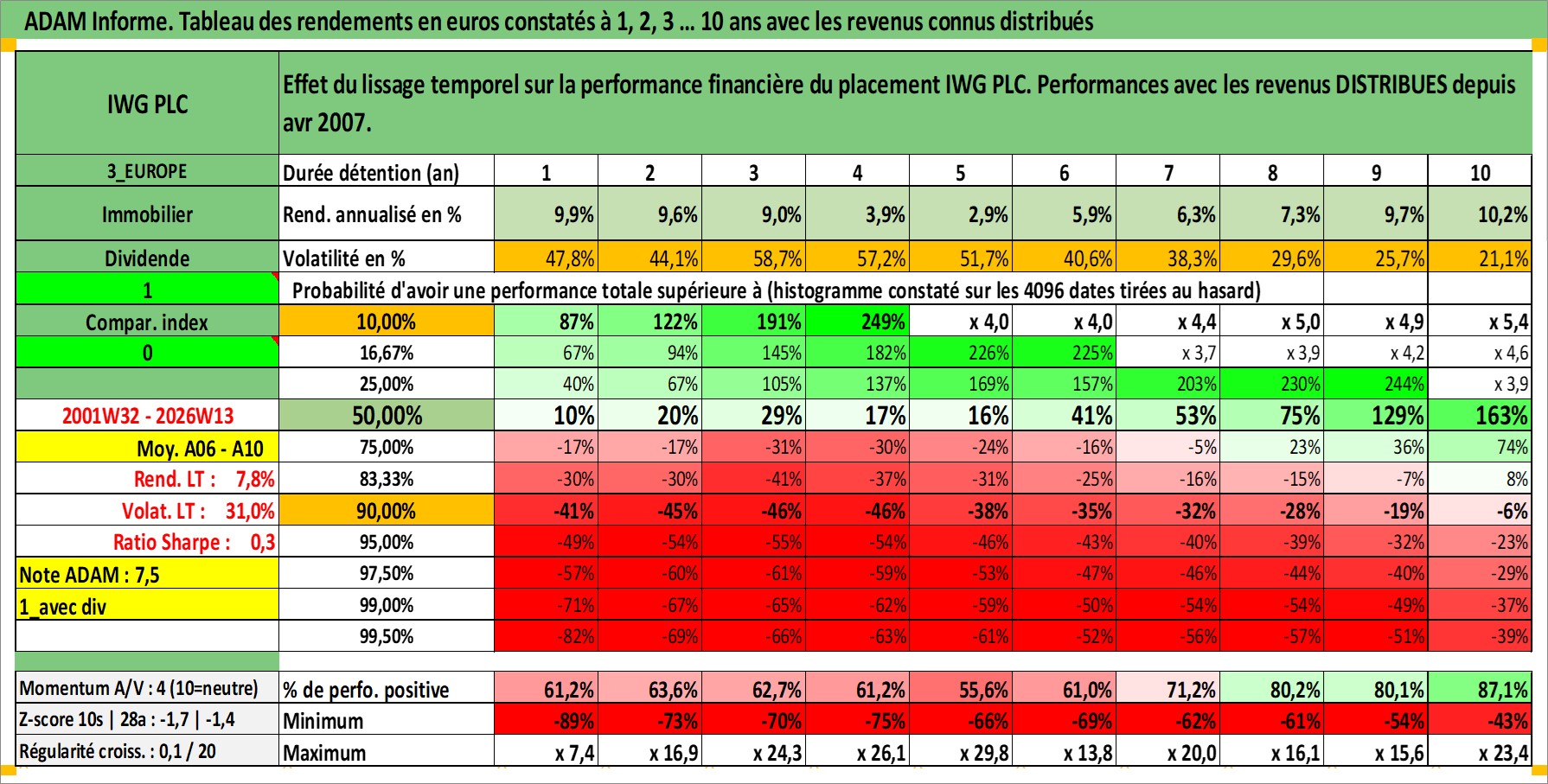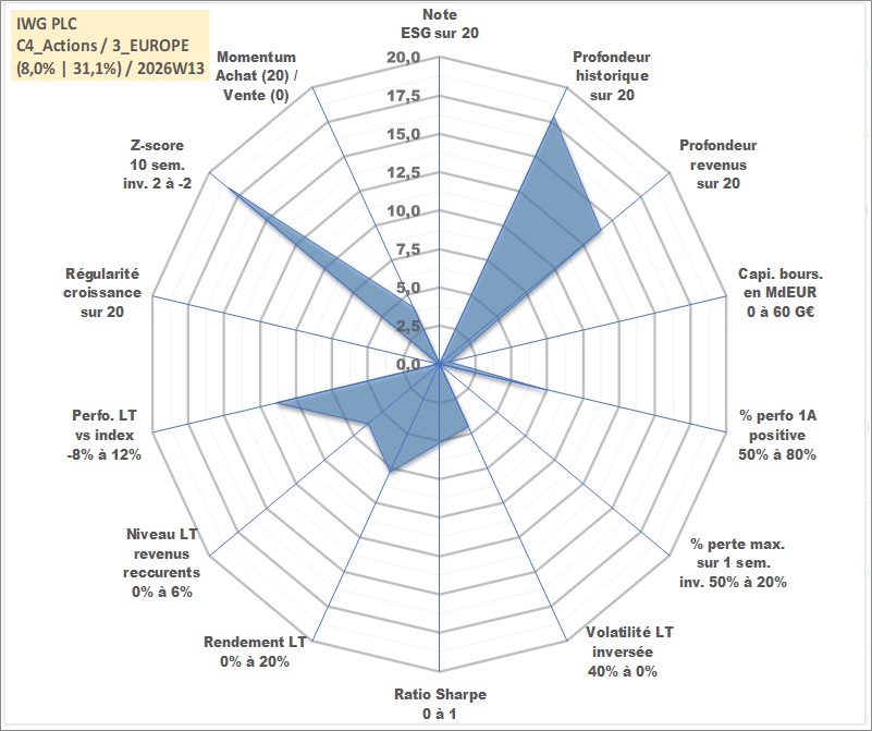 Site dédié aux investisseursPage dédiée sur site financeAnalyse des valorisations hebdomadaires de l'action IWG PLC. Cet actif est cote en GBX. Les valorisations sont en contrevaleur EURO et couvrent les semaines 2001W32 a 2026W13. Les revenus de cet actif financier sont pris en compte depuis la semaine 2007W17. La note ESG de cet actif n'est pas connue.