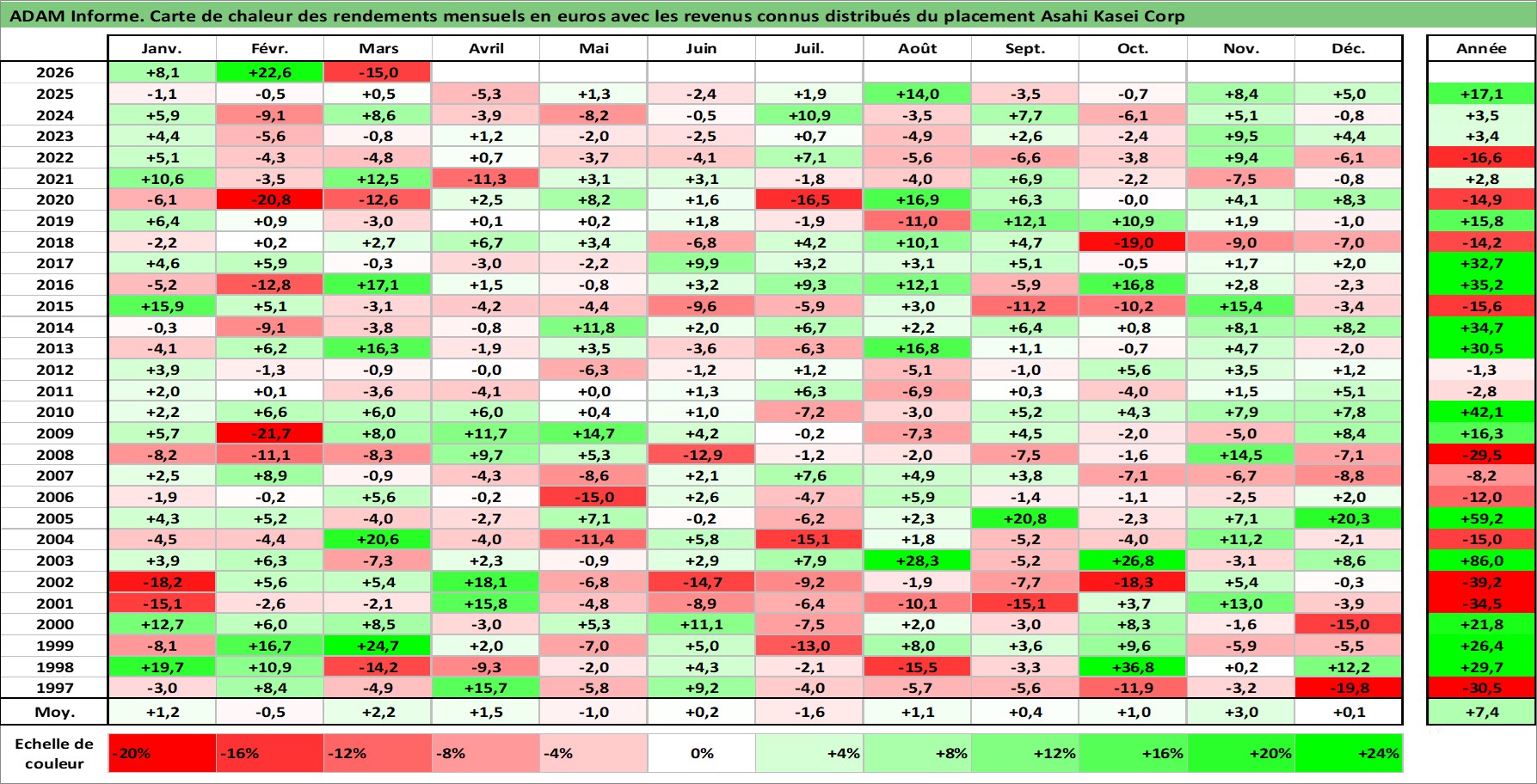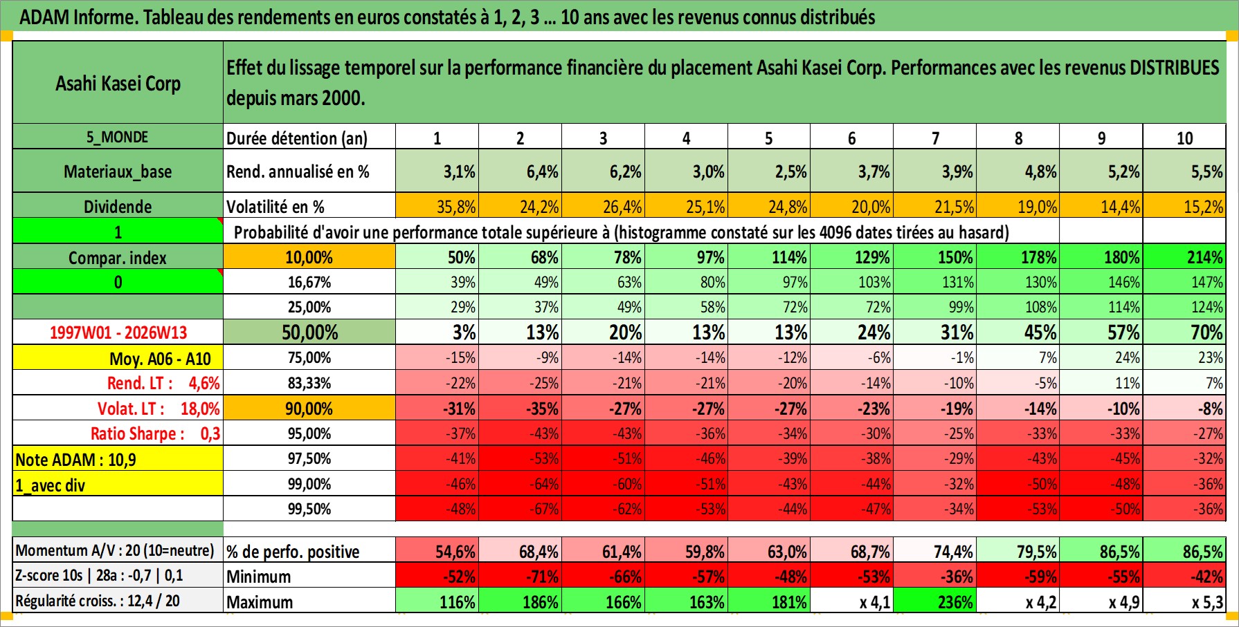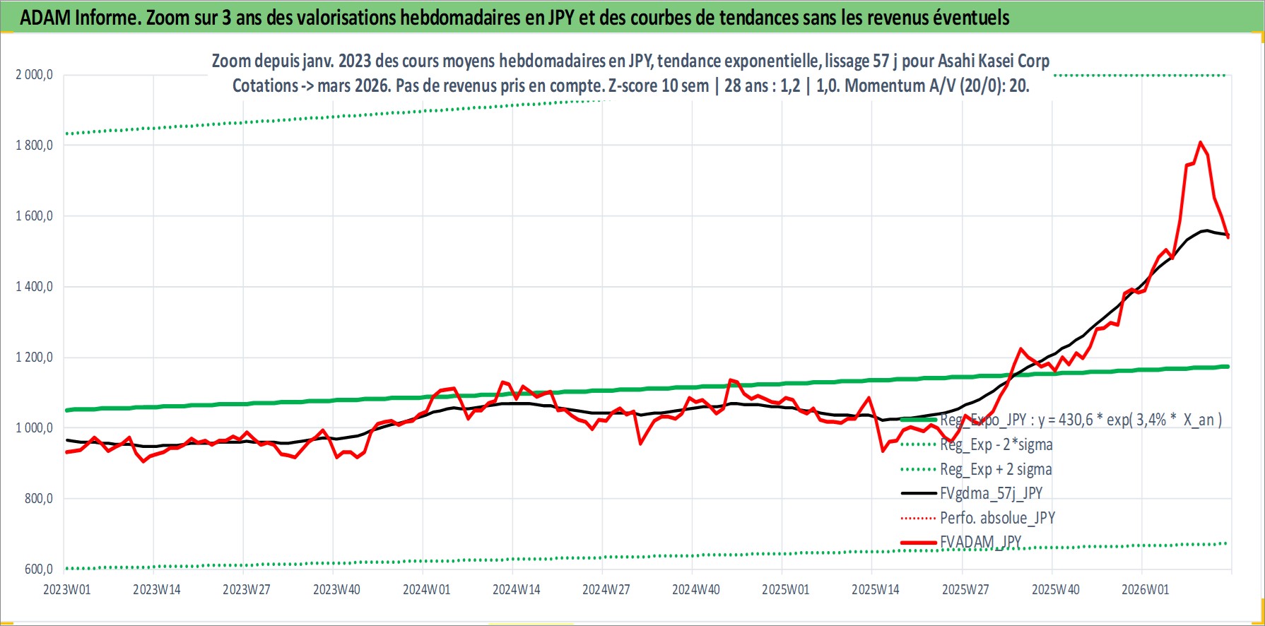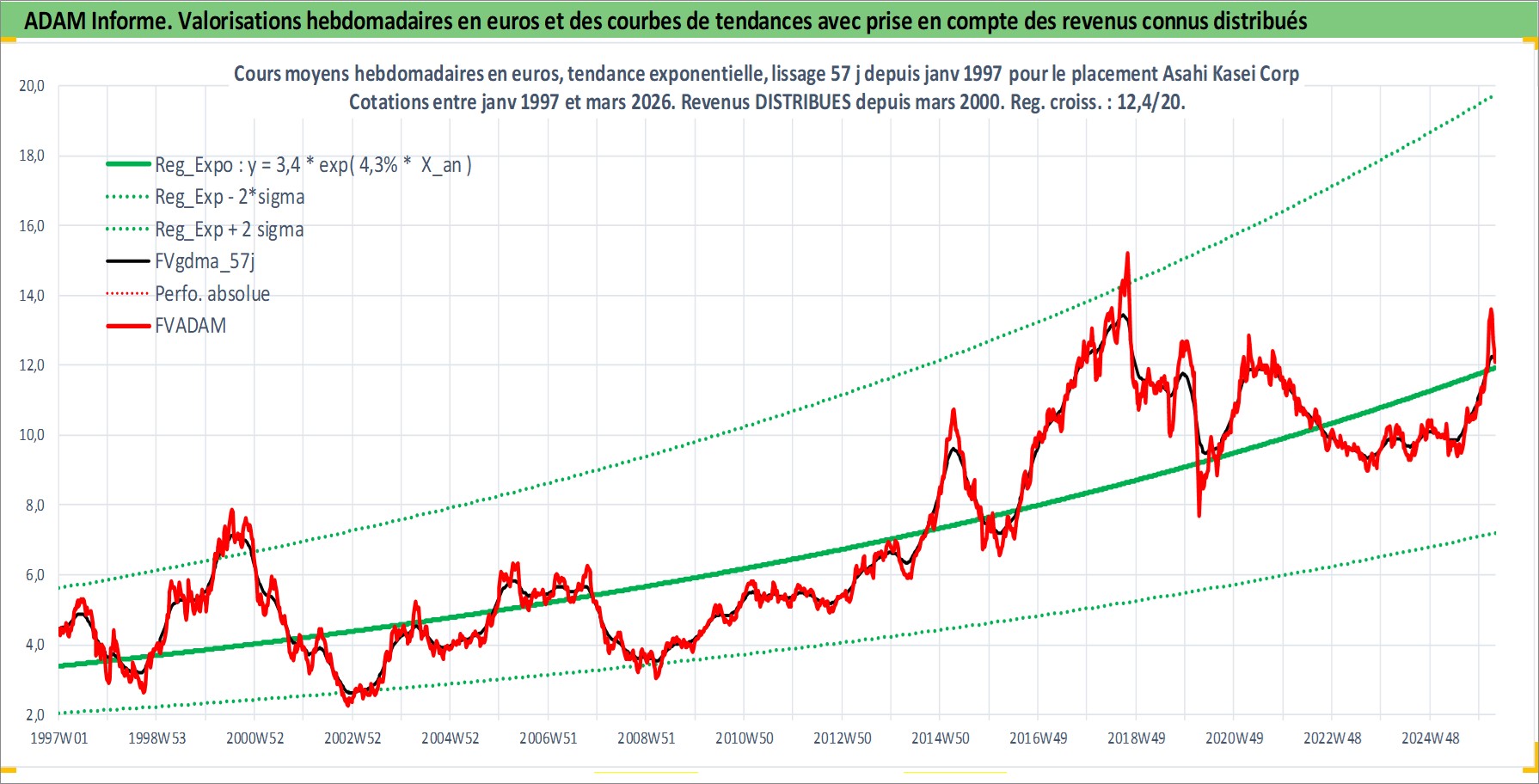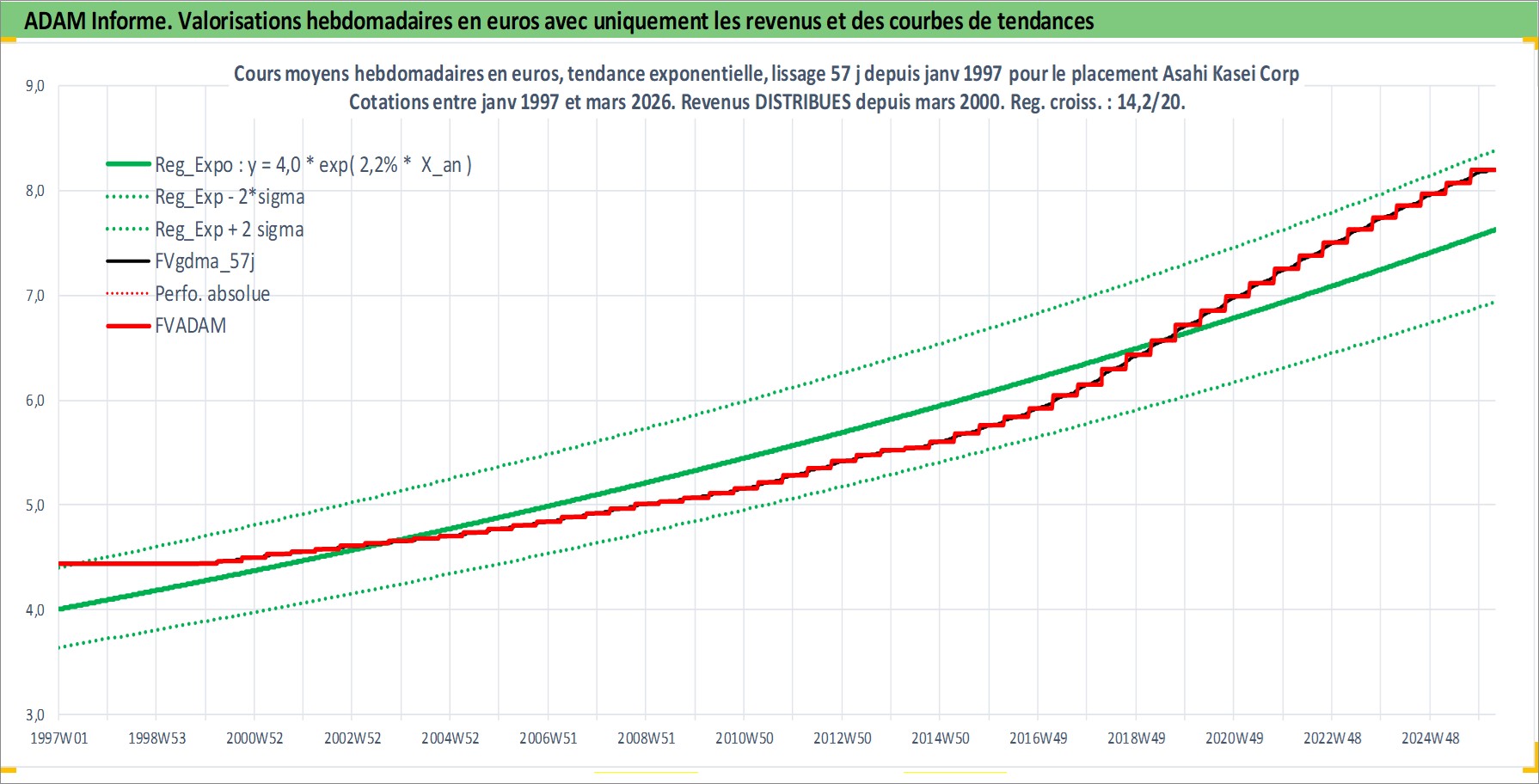 Site dédié aux investisseursPage dédiée sur site financeAnalyse des valorisations hebdomadaires de l'action Asahi Kasei Corp. Cet actif est cote en JPY. Les valorisations sont en contrevaleur EURO et couvrent les semaines 1997W01 a 2026W13. Les revenus de cet actif financier sont pris en compte depuis la semaine 2000W13. La note globale ESG de cet actif est estimee a 7.0 (apres rebasage entre 0 et 20).