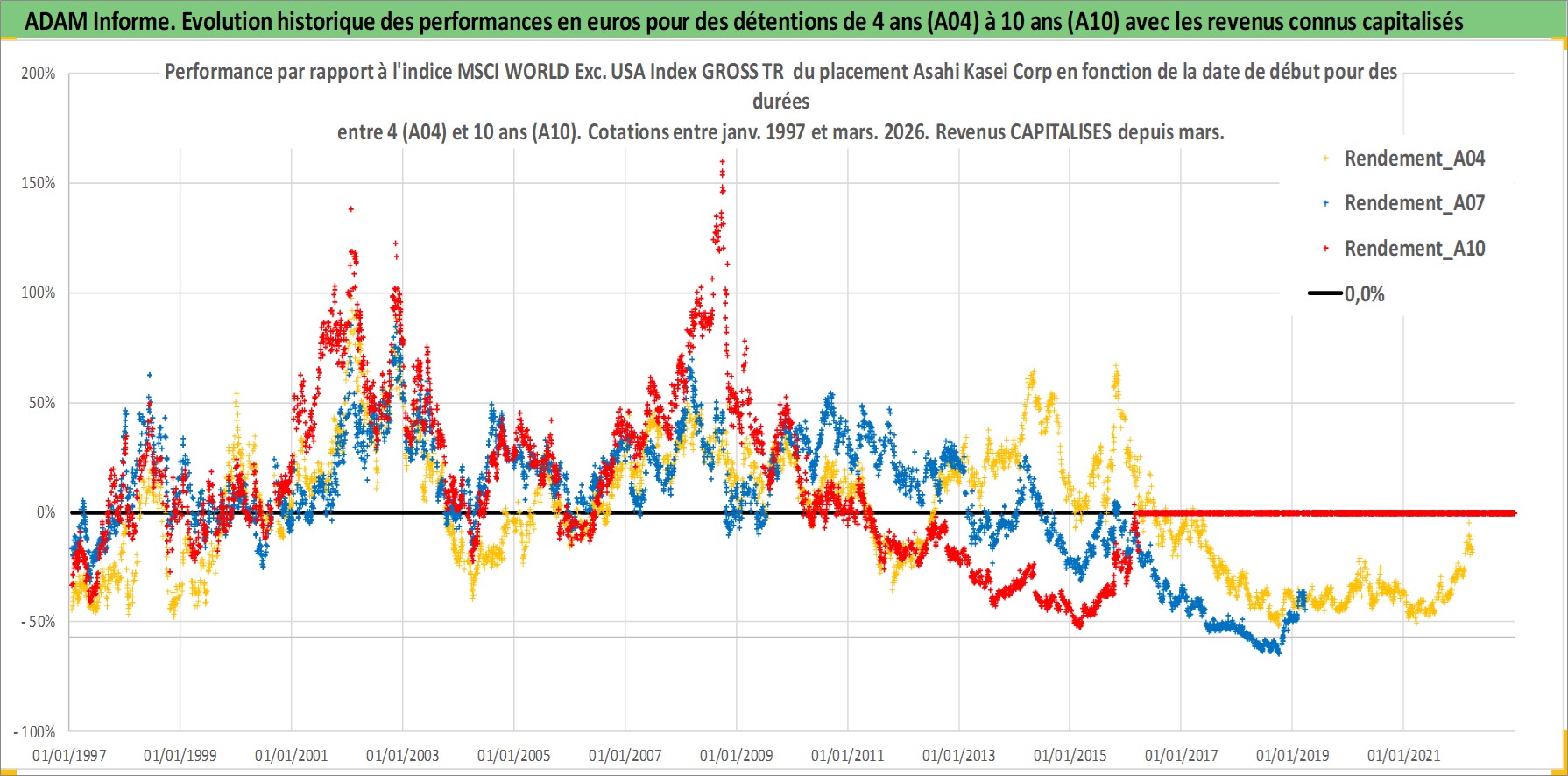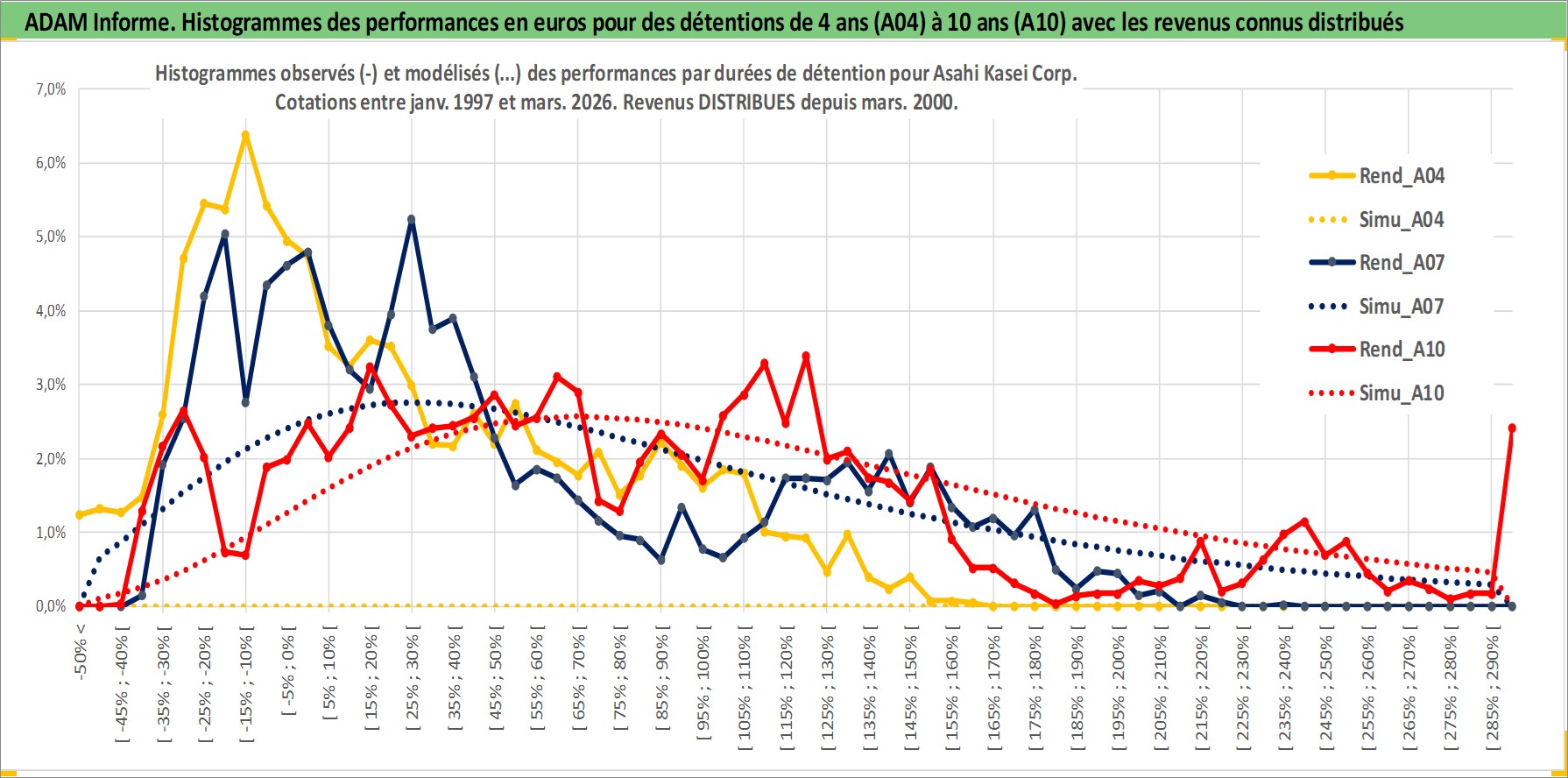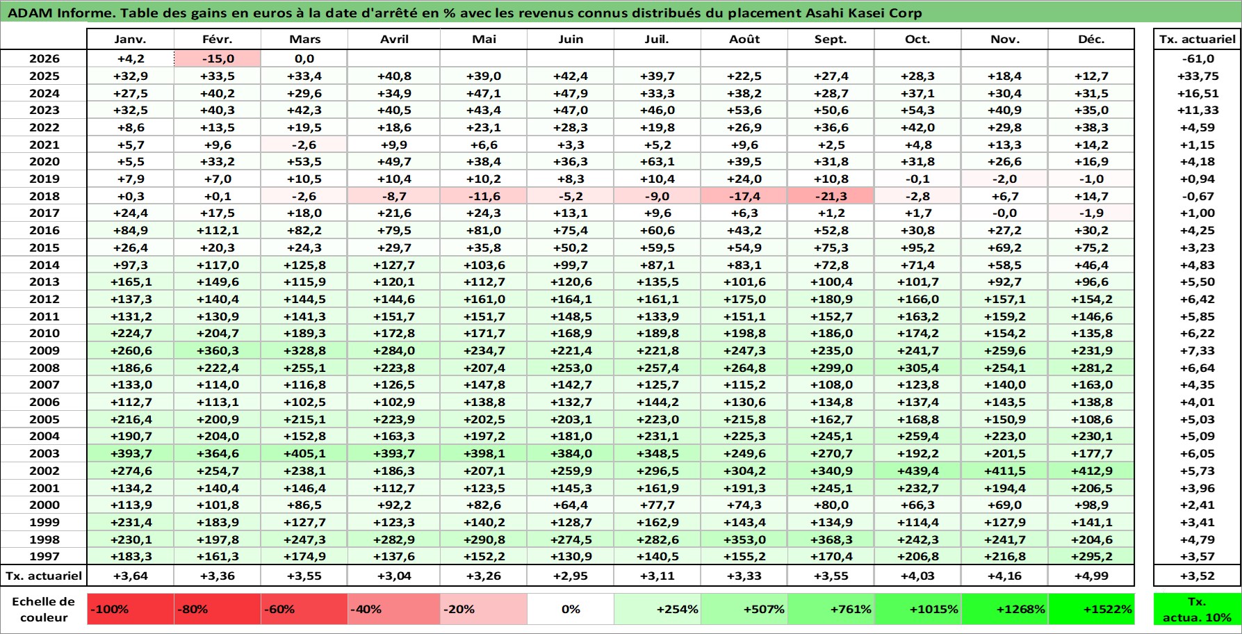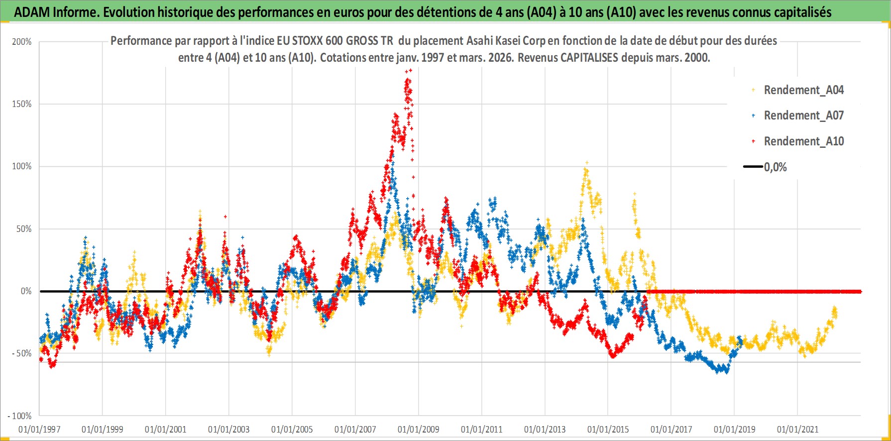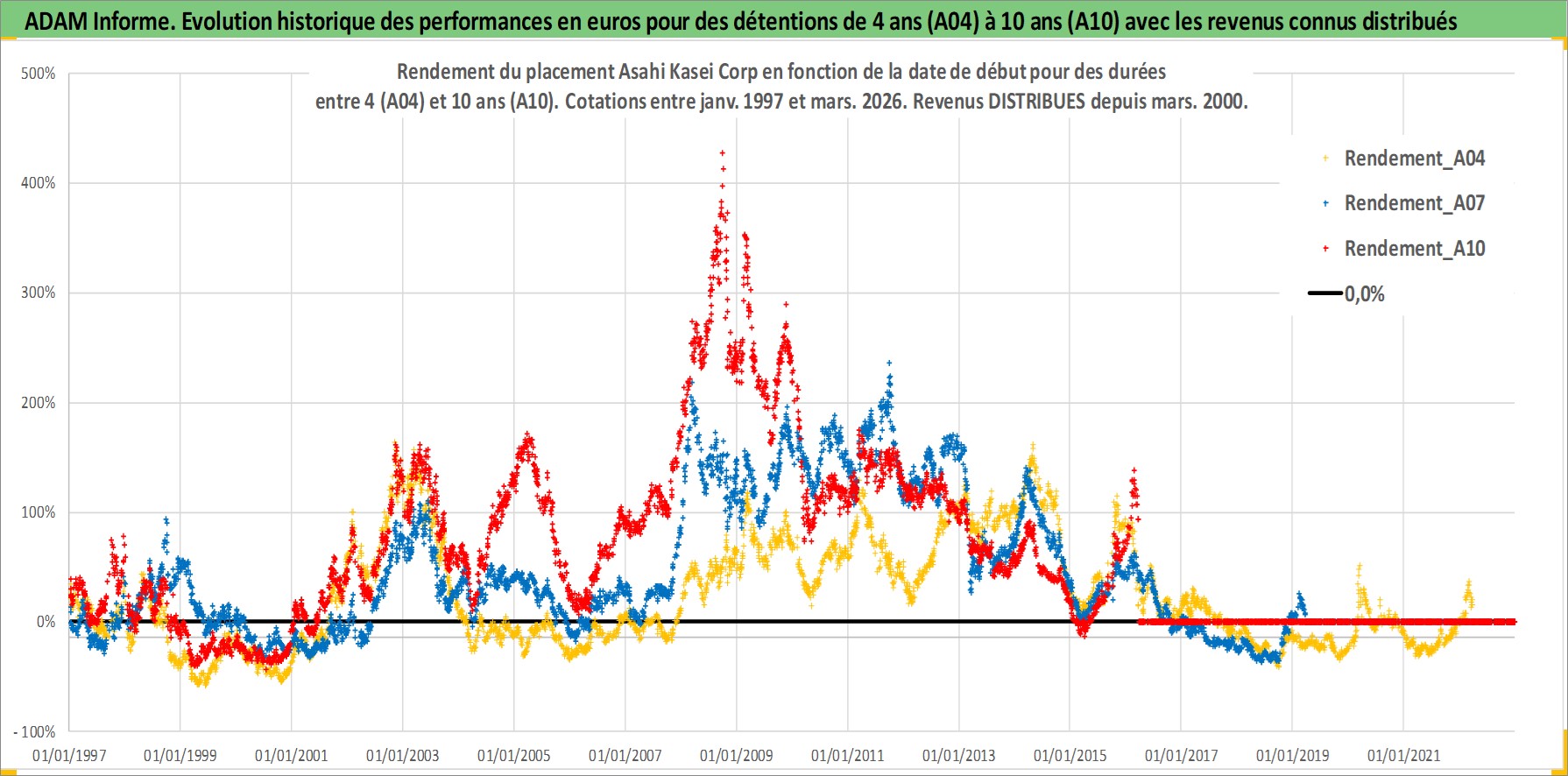 Site dédié aux investisseursPage dédiée sur site financeAnalyse des valorisations hebdomadaires de l'action Asahi Kasei Corp. Cet actif est cote en JPY. Les valorisations sont en contrevaleur EURO et couvrent les semaines 1997W01 a 2026W13. Les revenus de cet actif financier sont pris en compte depuis la semaine 2000W13. La note globale ESG de cet actif est estimee a 7.0 (apres rebasage entre 0 et 20).