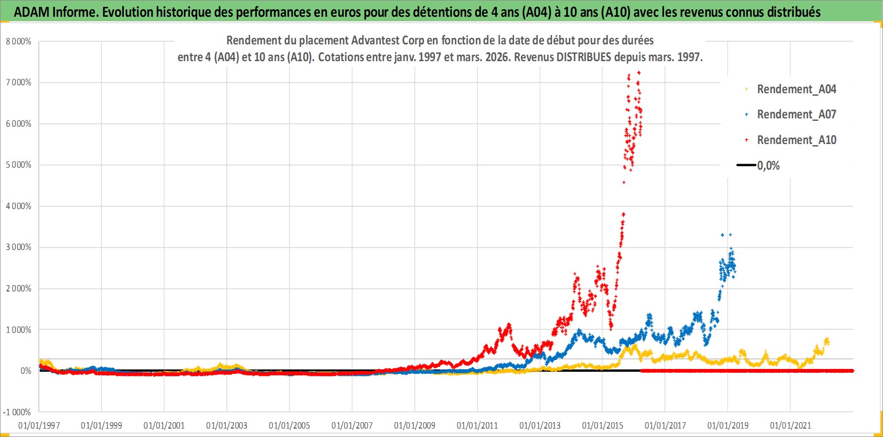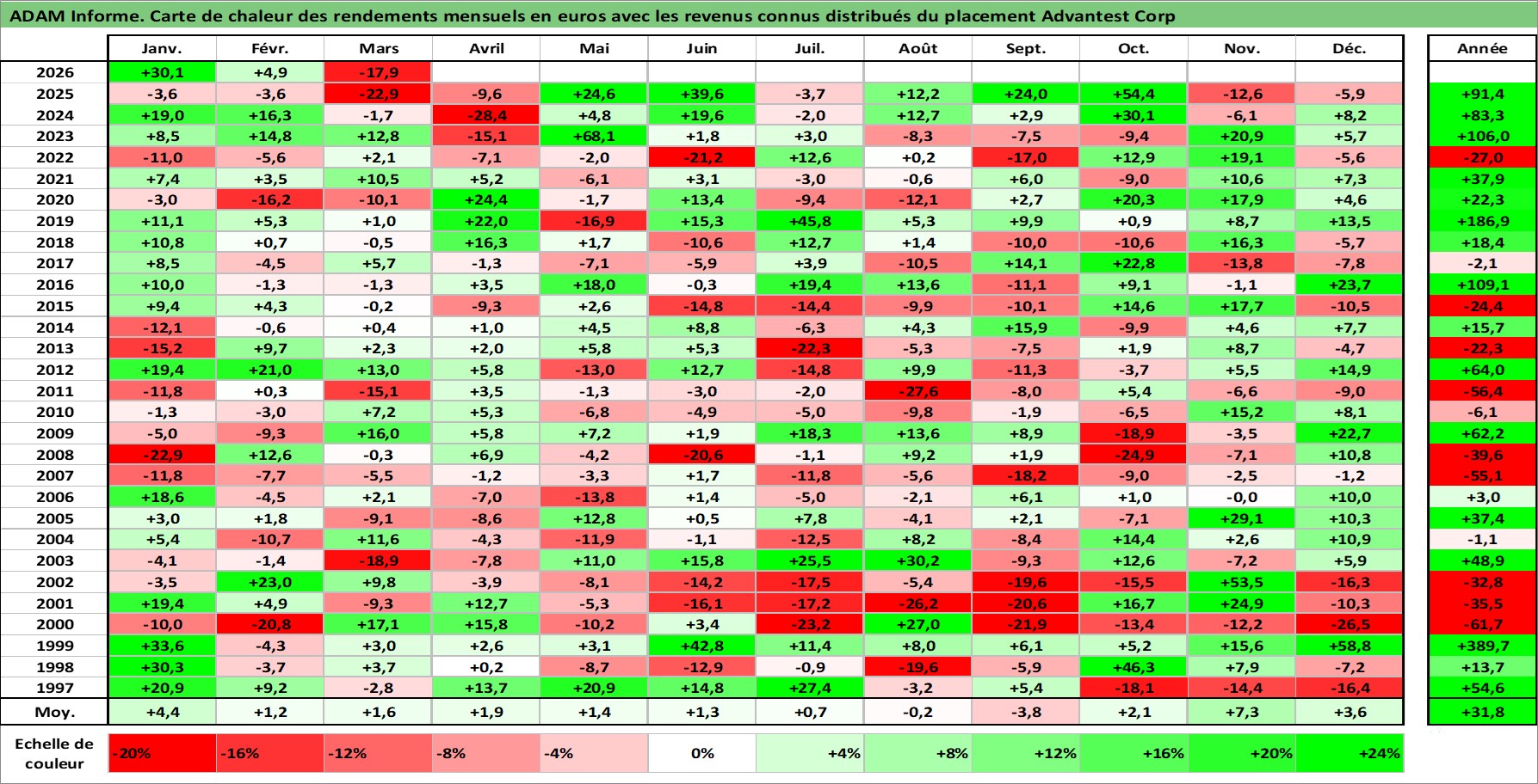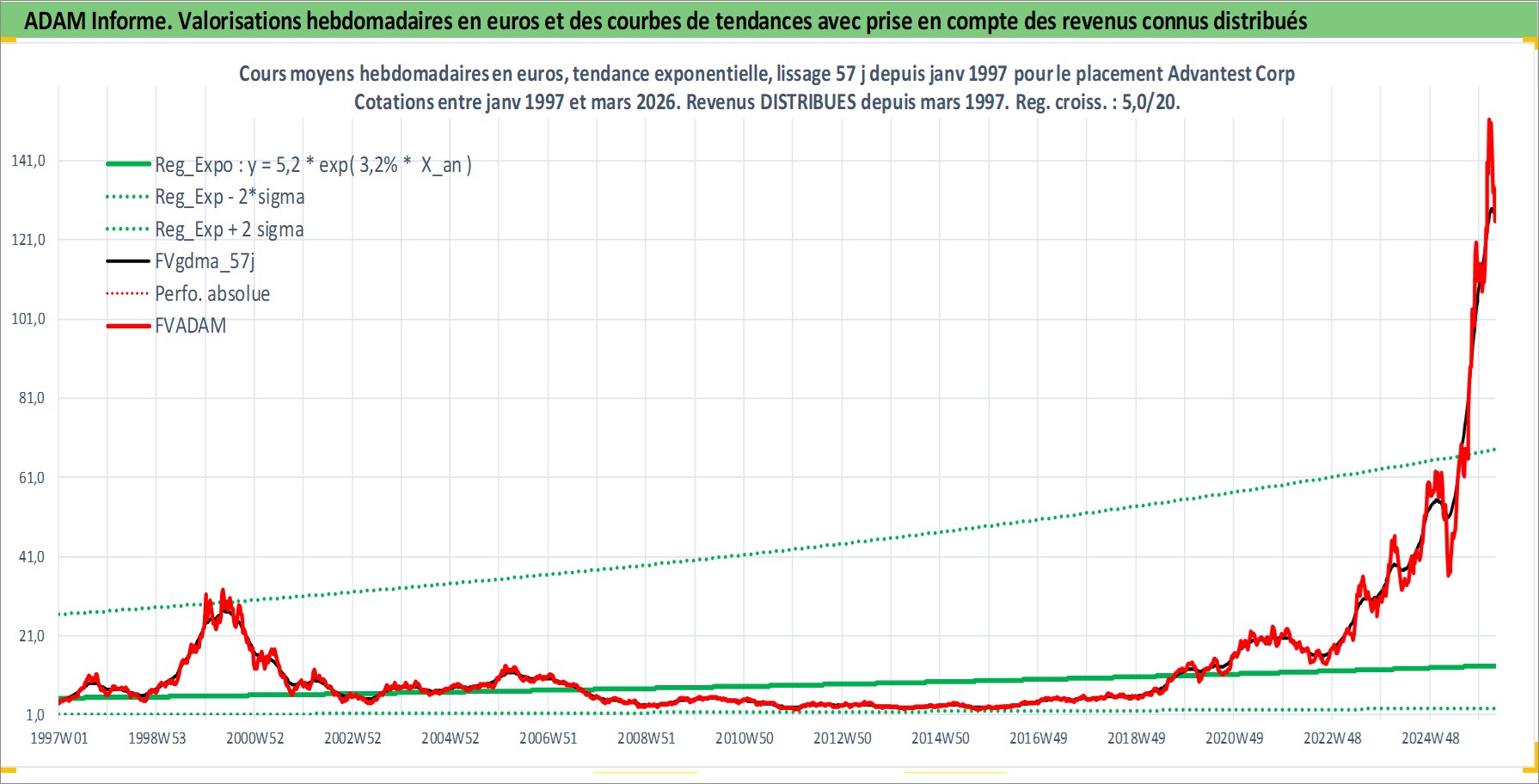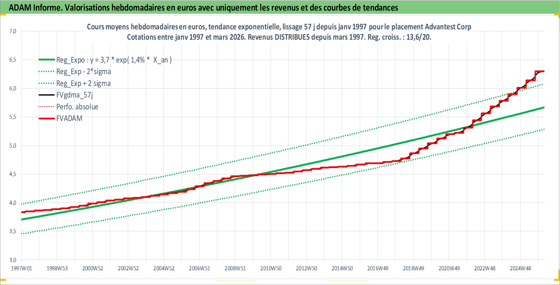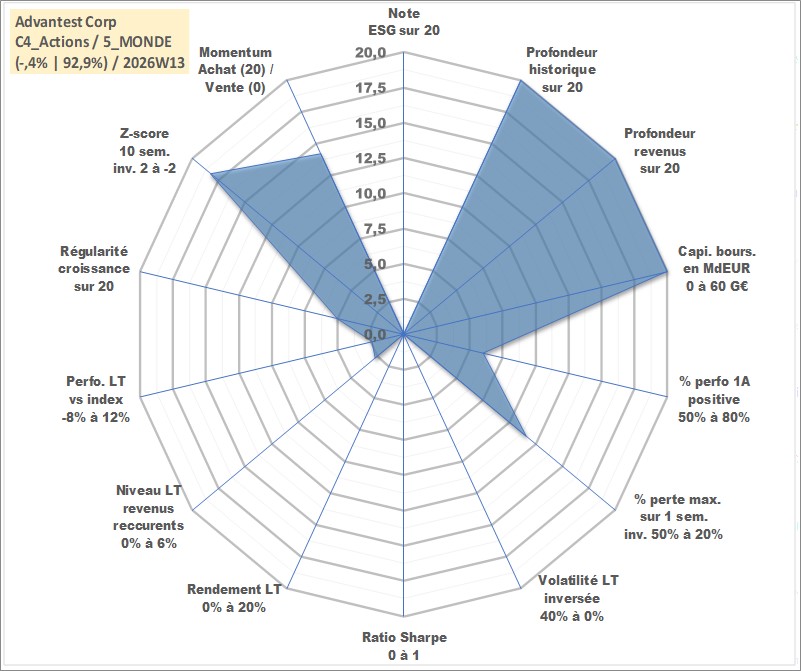 Site dédié aux investisseursPage dédiée sur site financeAnalyse des valorisations hebdomadaires de l'action Advantest Corp. Cet actif est cote en JPY. Les valorisations sont en contrevaleur EURO et couvrent les semaines 1997W01 a 2026W13. Les revenus de cet actif financier sont pris en compte depuis la semaine 1997W13. La note ESG de cet actif n'est pas connue.