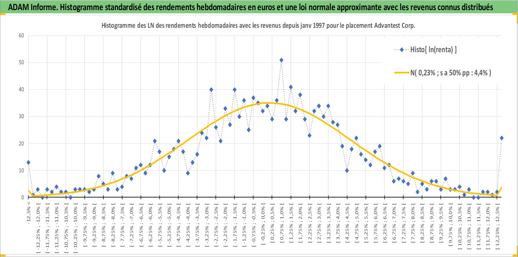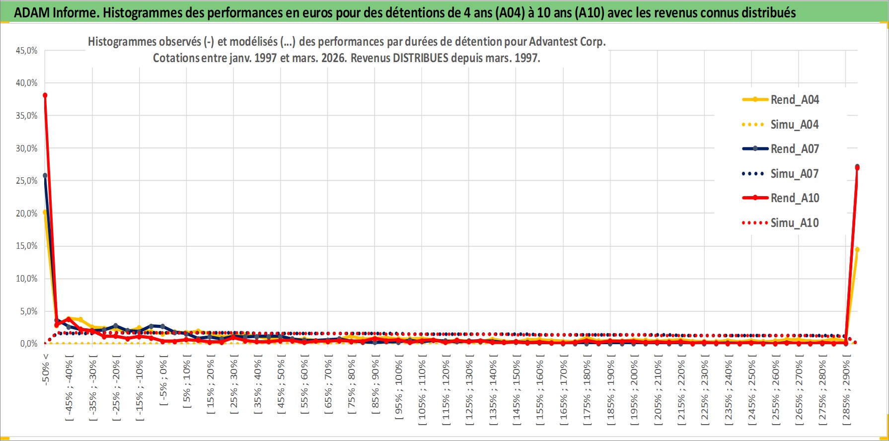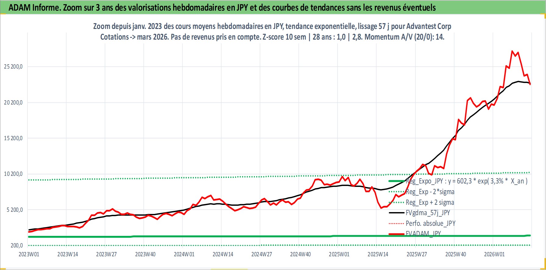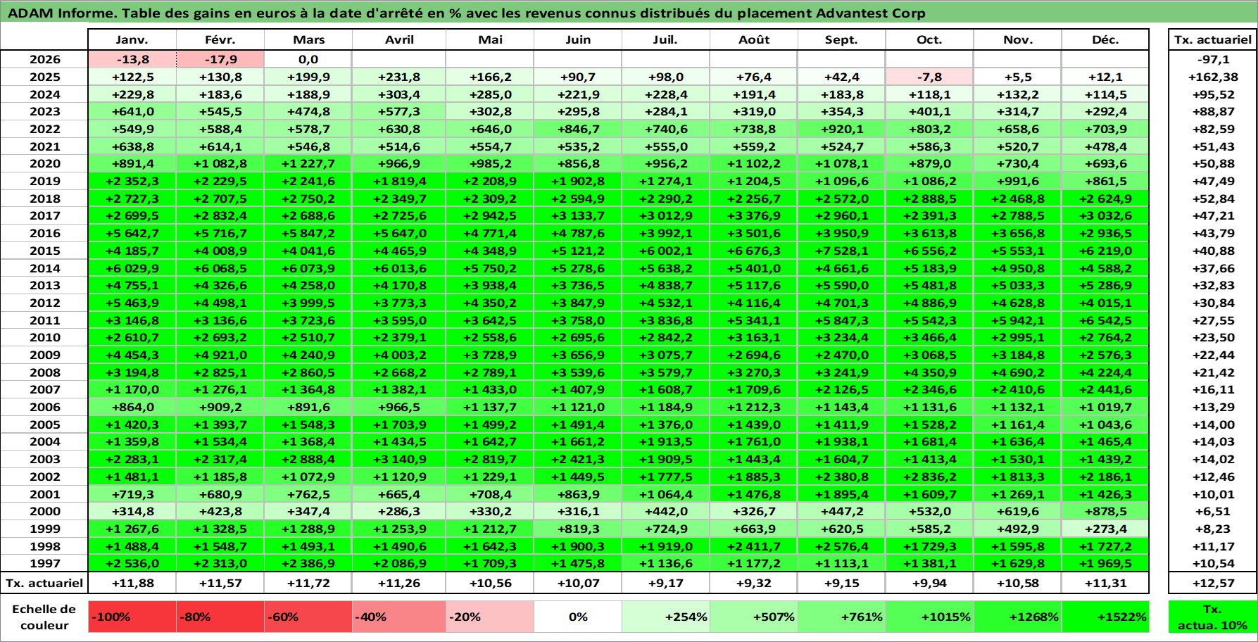Site dédié aux investisseursPage dédiée sur site financeAnalyse des valorisations hebdomadaires de l'action Advantest Corp. Cet actif est cote en JPY. Les valorisations sont en contrevaleur EURO et couvrent les semaines 1997W01 a 2026W13. Les revenus de cet actif financier sont pris en compte depuis la semaine 1997W13. La note ESG de cet actif n'est pas connue.