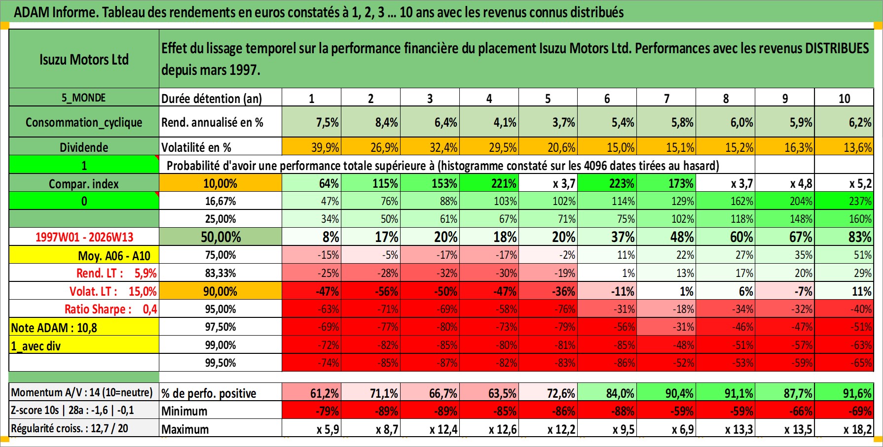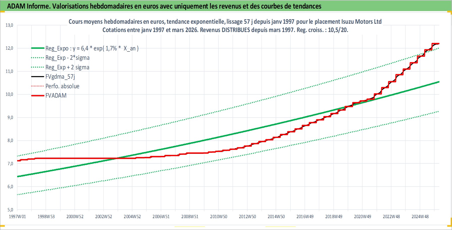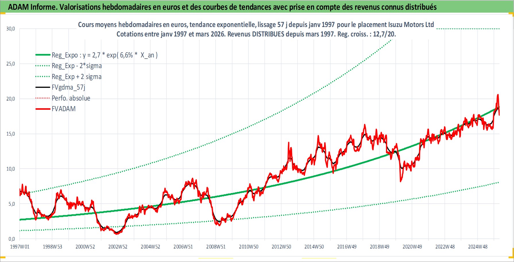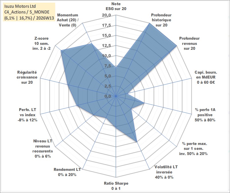 Site dédié aux investisseursPage dédiée sur site financeAnalyse des valorisations hebdomadaires de l'action Isuzu Motors Ltd. Cet actif est cote en JPY. Les valorisations sont en contrevaleur EURO et couvrent les semaines 1997W01 a 2026W13. Les revenus de cet actif financier sont pris en compte depuis la semaine 1997W13. La note globale ESG de cet actif est estimee a 7.0 (apres rebasage entre 0 et 20).