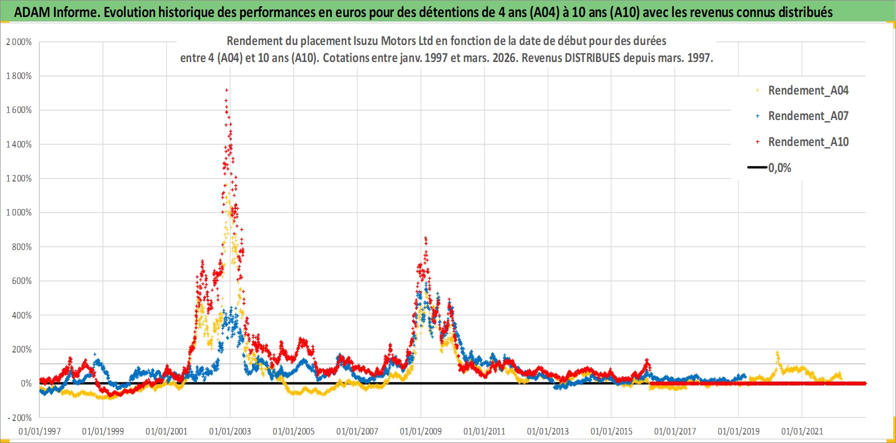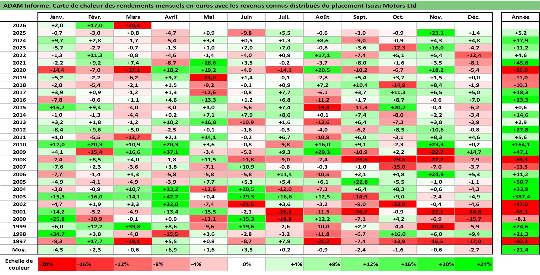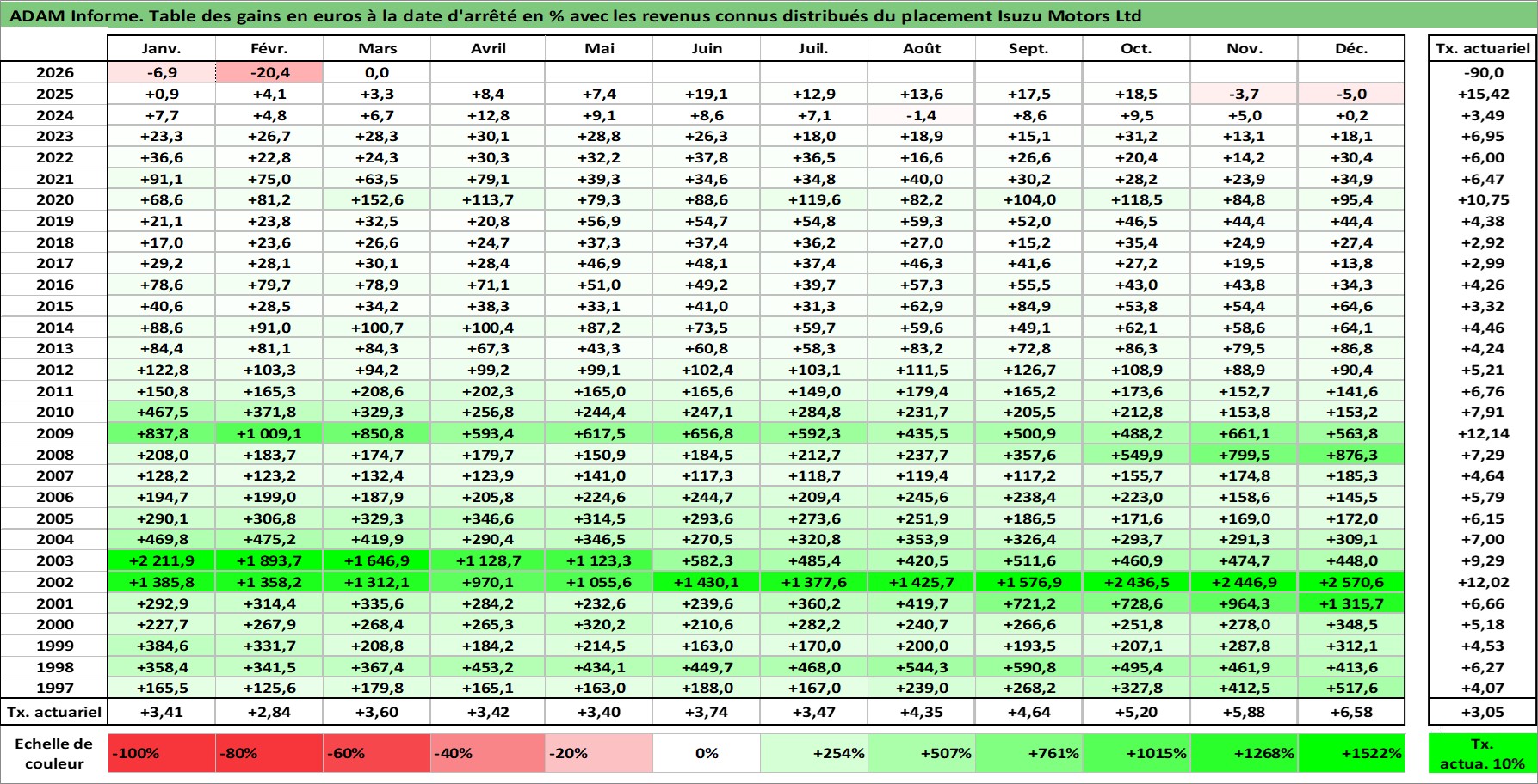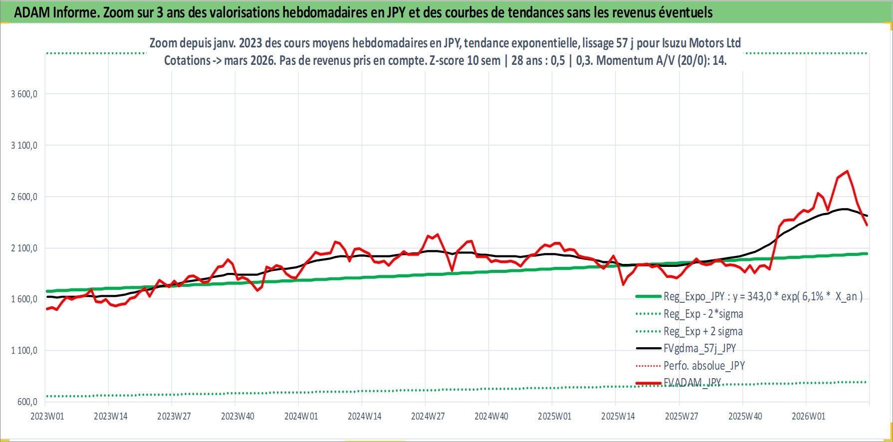 Site dédié aux investisseursPage dédiée sur site financeAnalyse des valorisations hebdomadaires de l'action Isuzu Motors Ltd. Cet actif est cote en JPY. Les valorisations sont en contrevaleur EURO et couvrent les semaines 1997W01 a 2026W13. Les revenus de cet actif financier sont pris en compte depuis la semaine 1997W13. La note globale ESG de cet actif est estimee a 7.0 (apres rebasage entre 0 et 20).