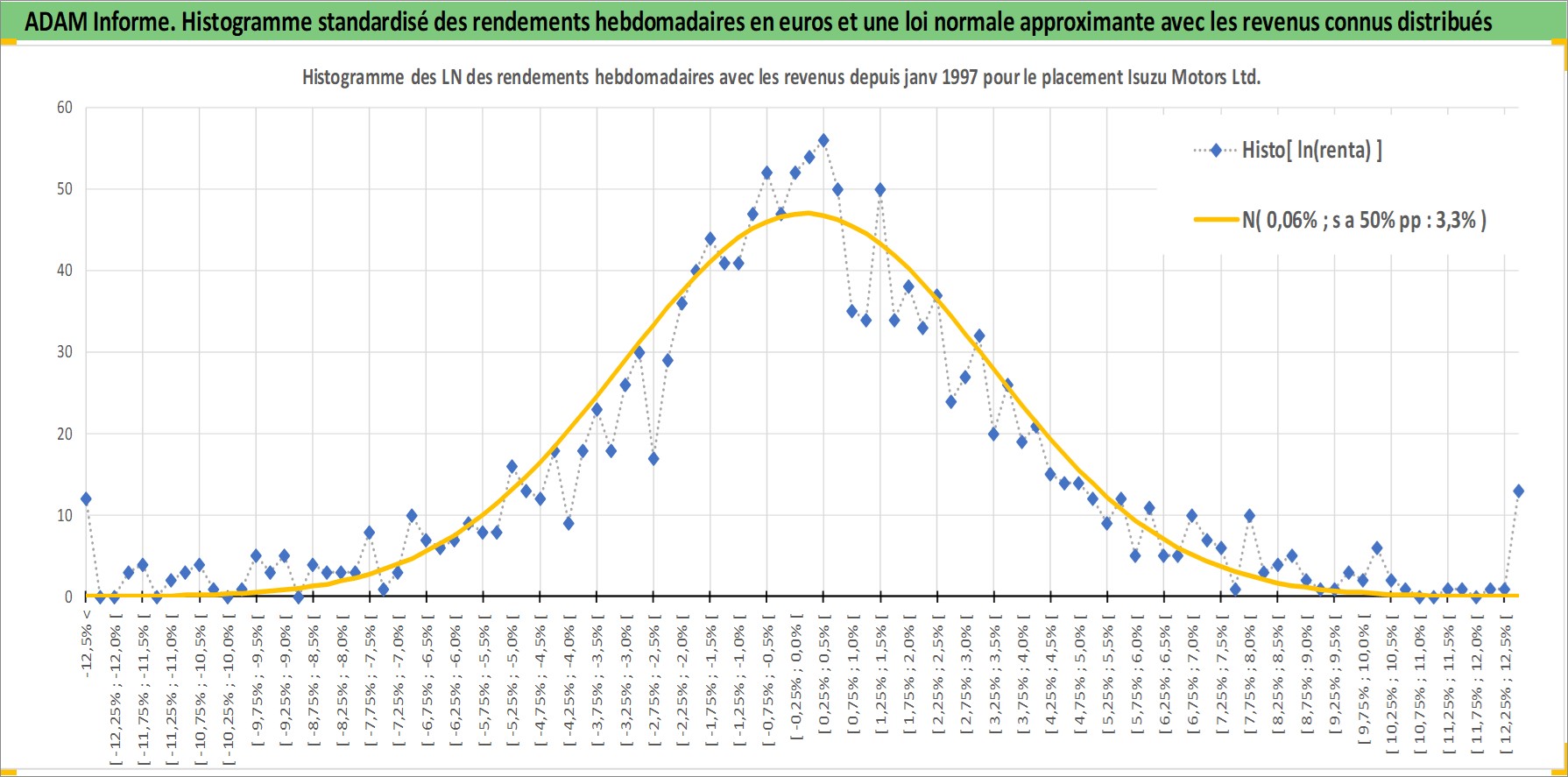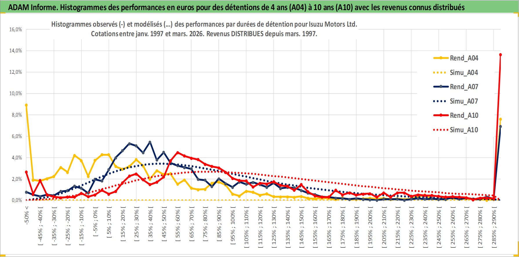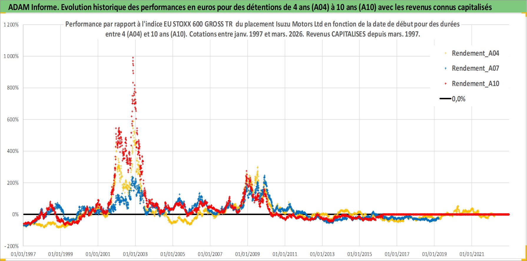 Site dédié aux investisseursPage dédiée sur site financeAnalyse des valorisations hebdomadaires de l'action Isuzu Motors Ltd. Cet actif est cote en JPY. Les valorisations sont en contrevaleur EURO et couvrent les semaines 1997W01 a 2026W13. Les revenus de cet actif financier sont pris en compte depuis la semaine 1997W13. La note globale ESG de cet actif est estimee a 7.0 (apres rebasage entre 0 et 20).