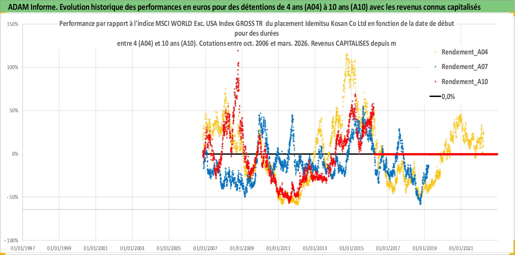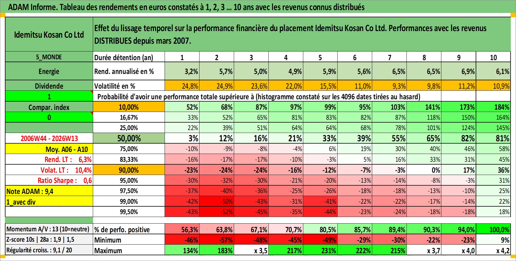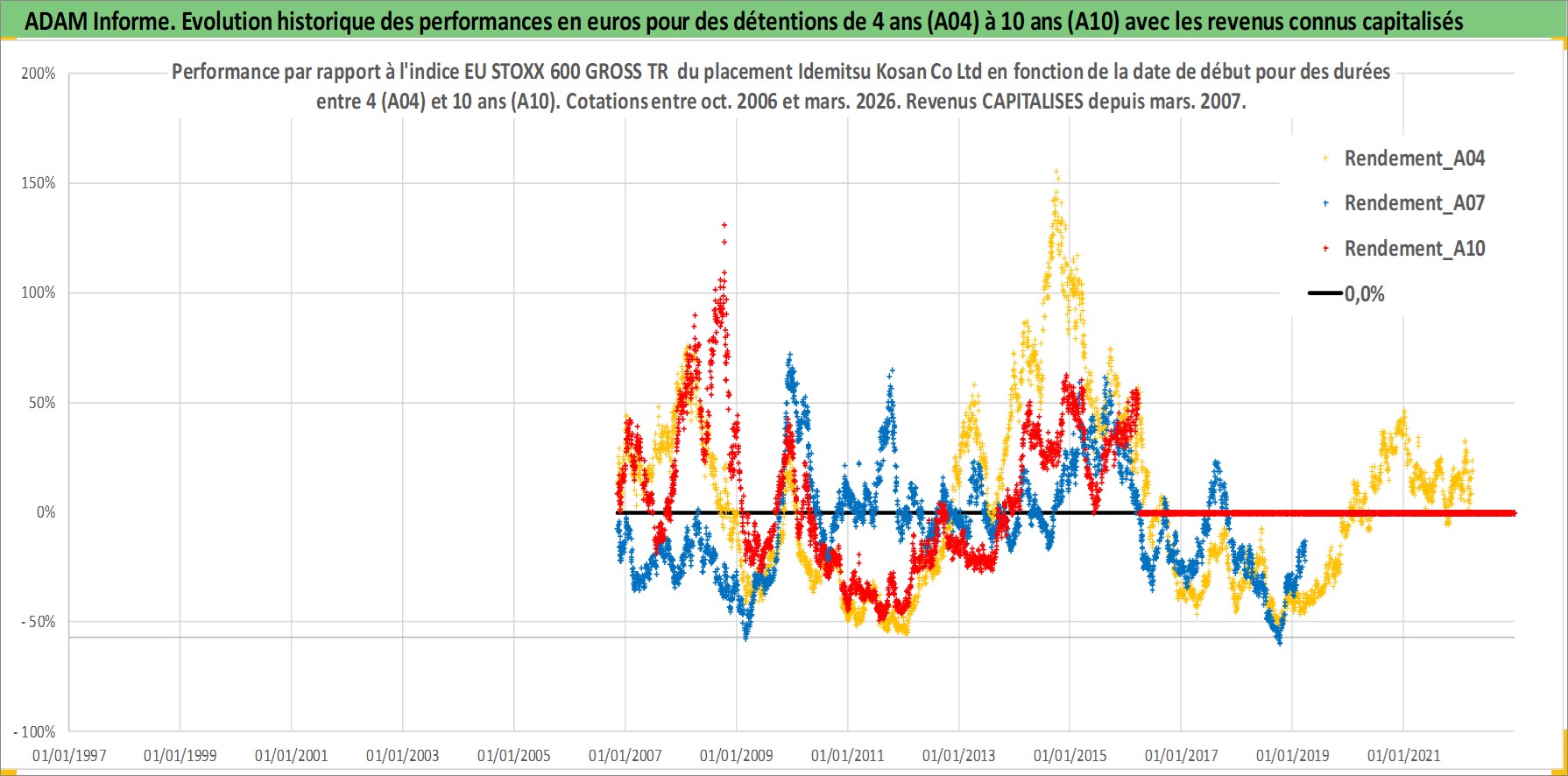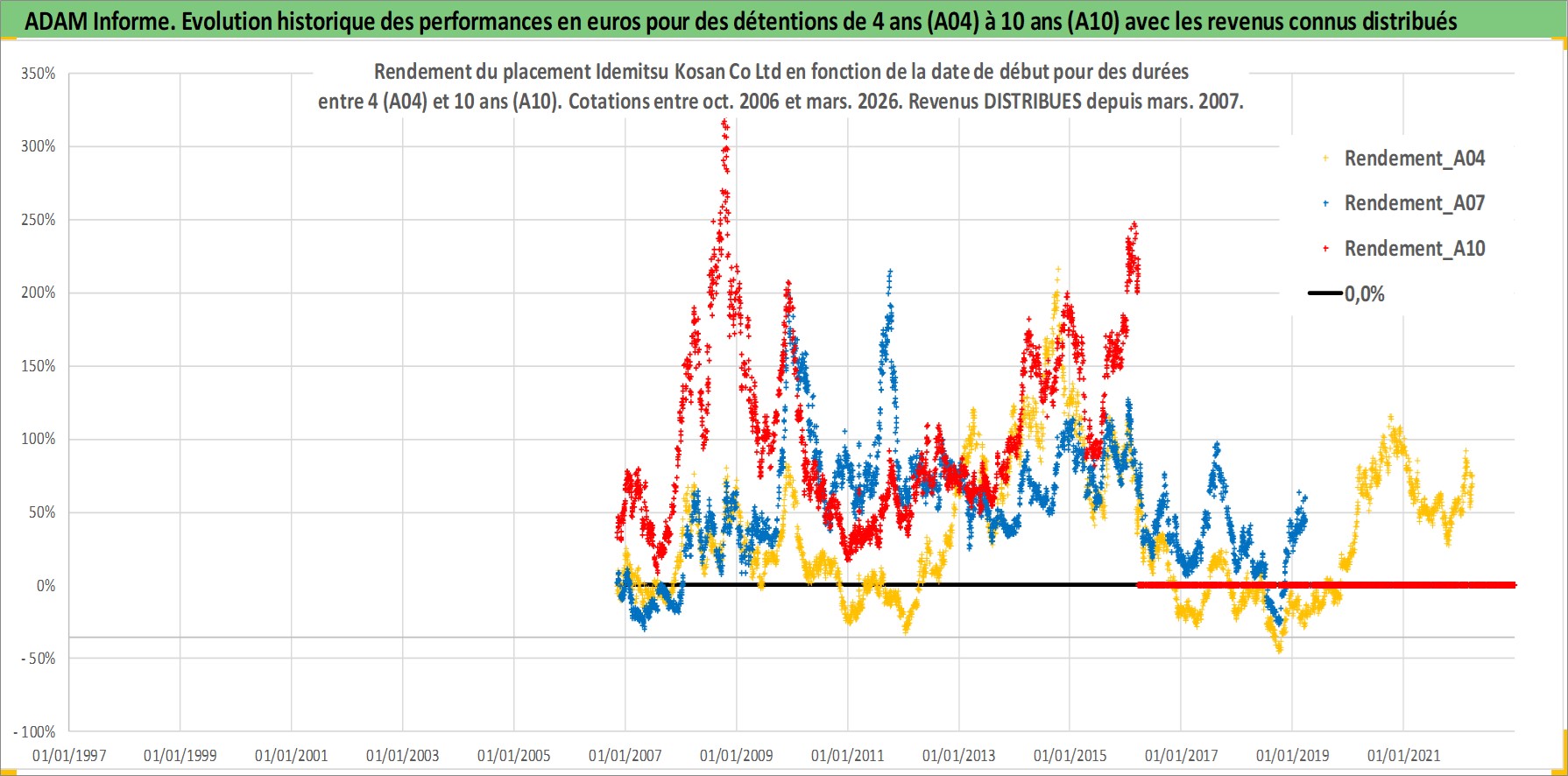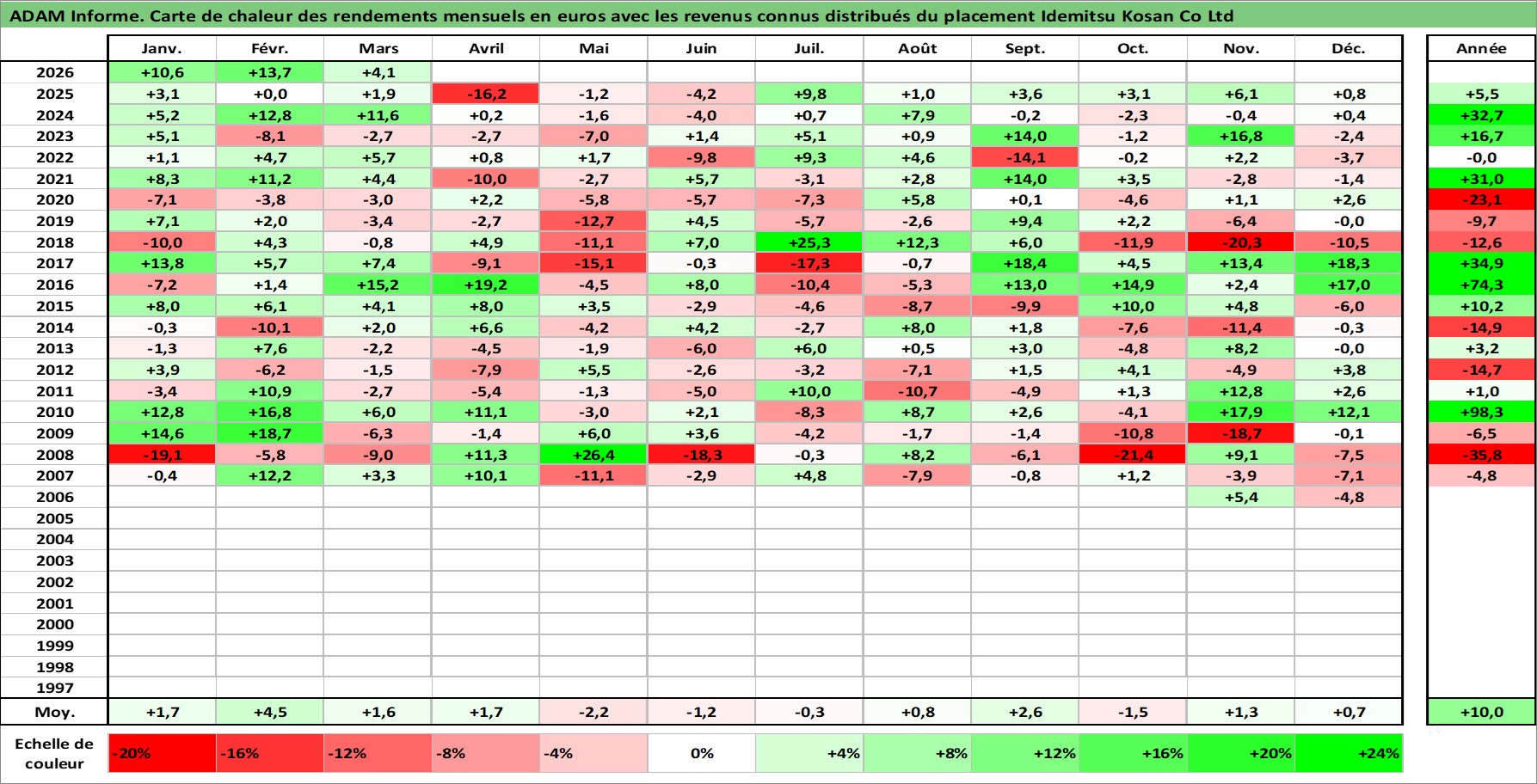 Site dédié aux investisseursPage dédiée sur site financeAnalyse des valorisations hebdomadaires de l'action Idemitsu Kosan Co Ltd. Cet actif est cote en JPY. Les valorisations sont en contrevaleur EURO et couvrent les semaines 2006W44 a 2026W13. Les revenus de cet actif financier sont pris en compte depuis la semaine 2007W13. La note ESG de cet actif n'est pas connue.