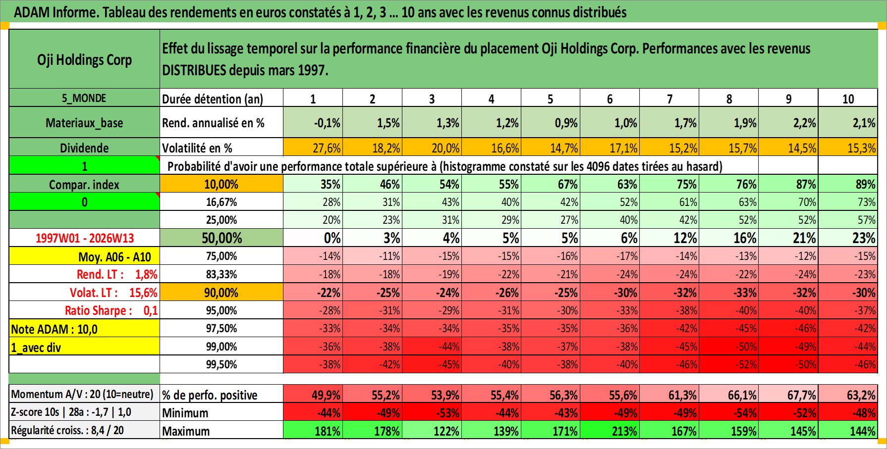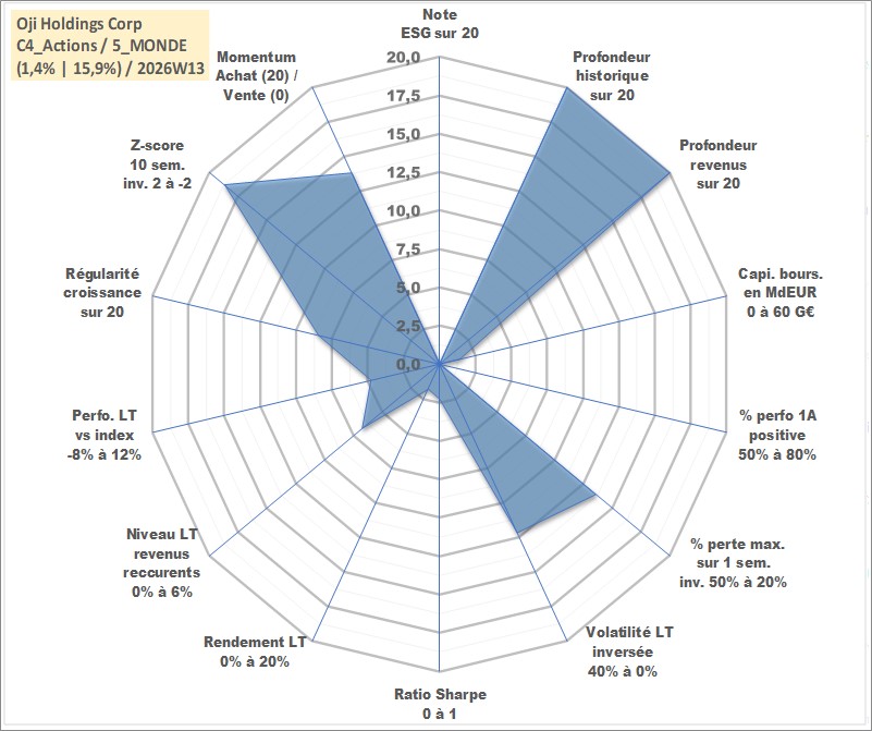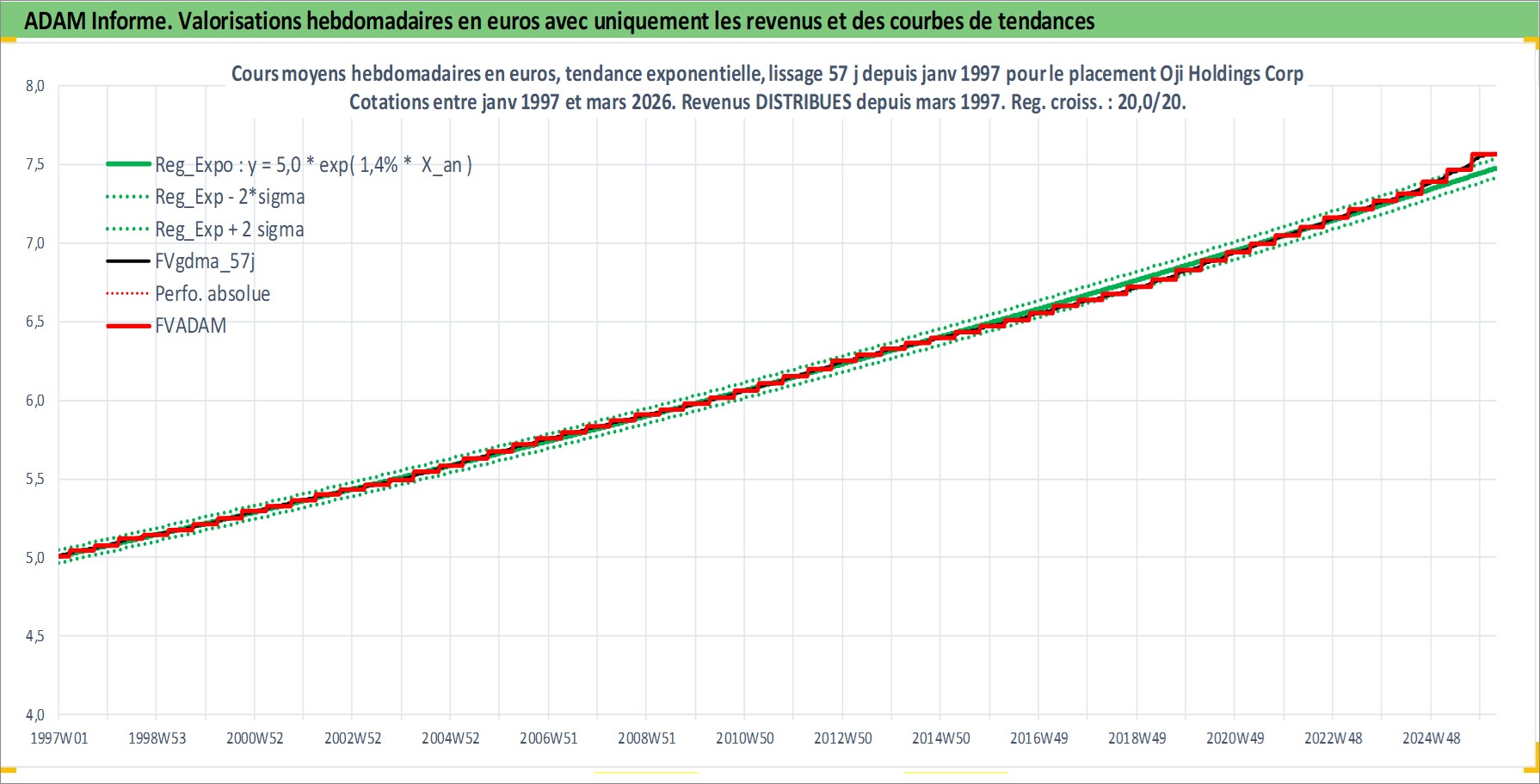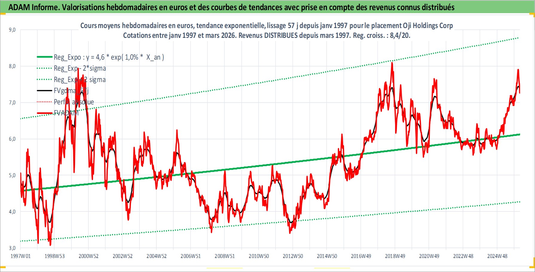 Site dédié aux investisseursPage dédiée sur site financeAnalyse des valorisations hebdomadaires de l'action Oji Holdings Corp. Cet actif est cote en JPY. Les valorisations sont en contrevaleur EURO et couvrent les semaines 1997W01 a 2026W13. Les revenus de cet actif financier sont pris en compte depuis la semaine 1997W13. La note ESG de cet actif n'est pas connue.
