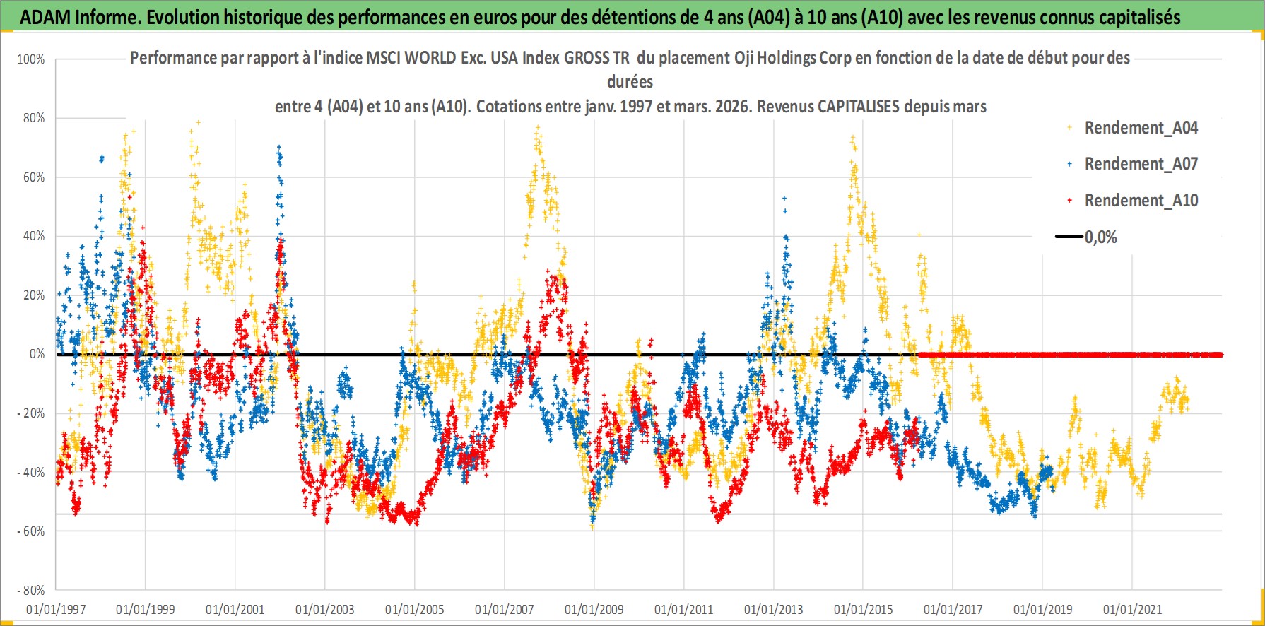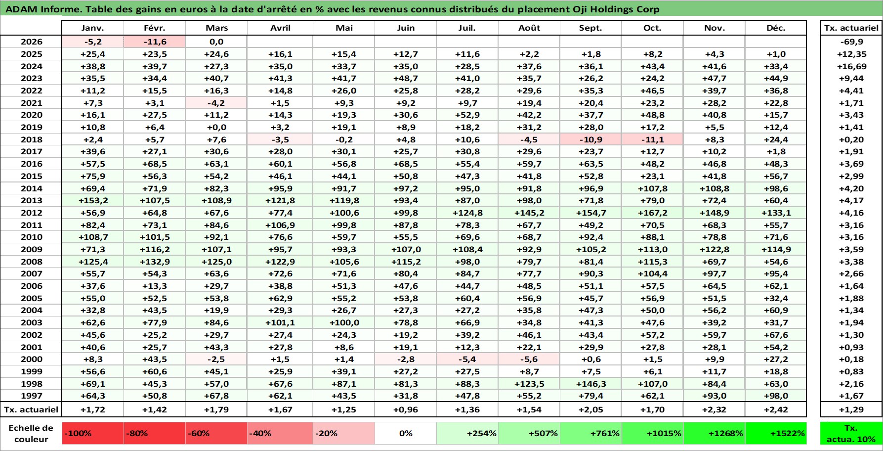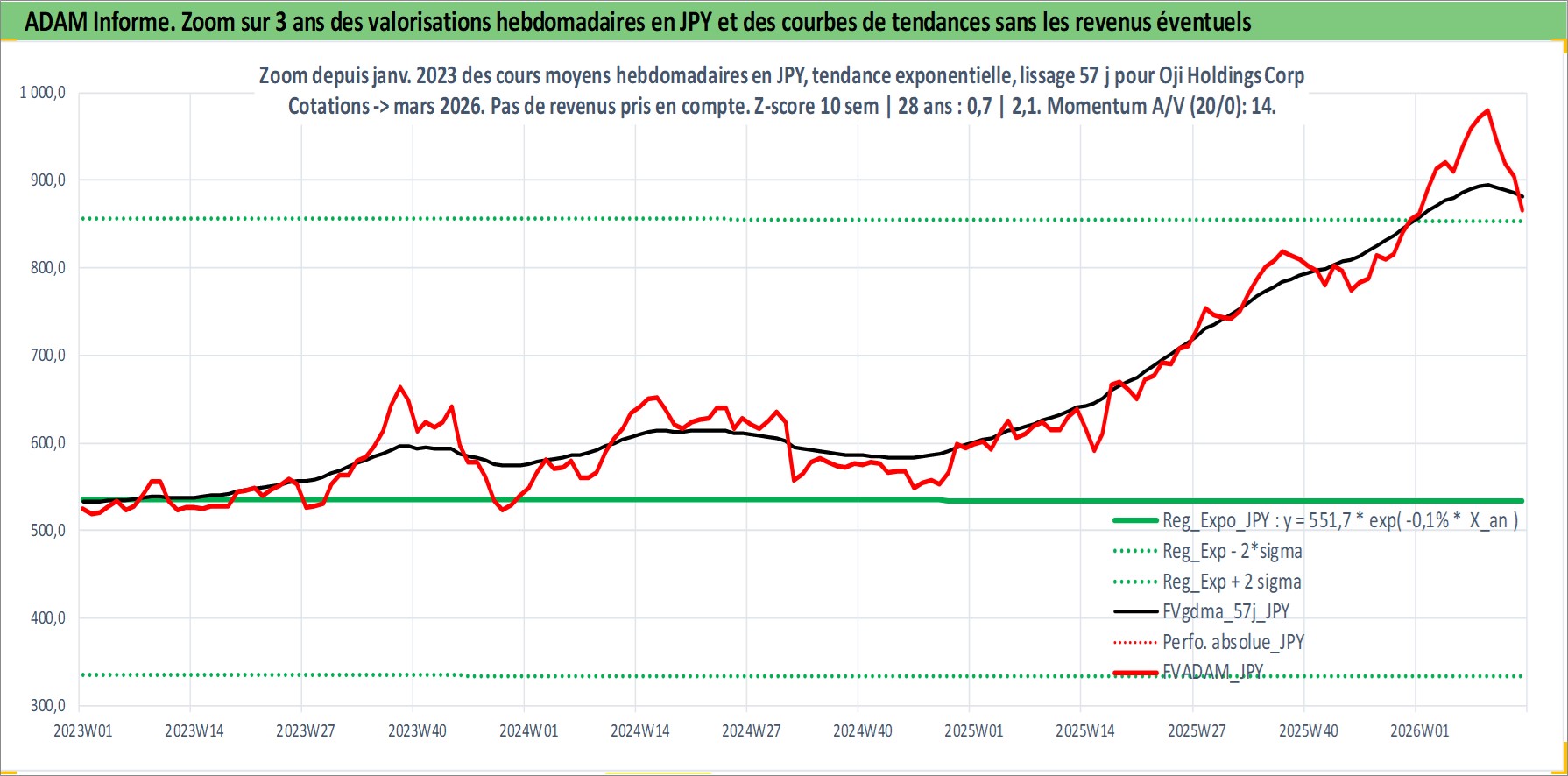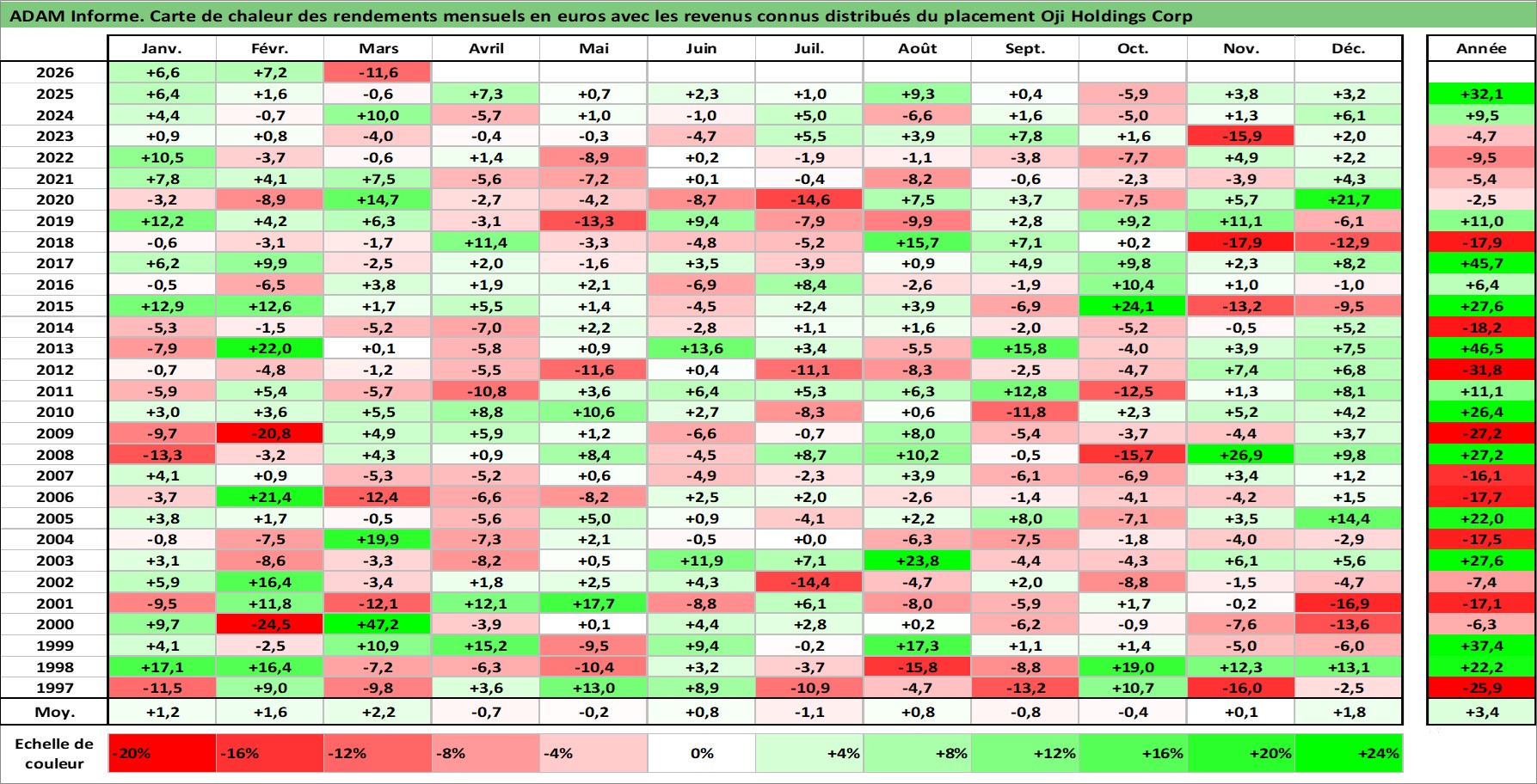 Site dédié aux investisseursPage dédiée sur site financeAnalyse des valorisations hebdomadaires de l'action Oji Holdings Corp. Cet actif est cote en JPY. Les valorisations sont en contrevaleur EURO et couvrent les semaines 1997W01 a 2026W13. Les revenus de cet actif financier sont pris en compte depuis la semaine 1997W13. La note ESG de cet actif n'est pas connue.