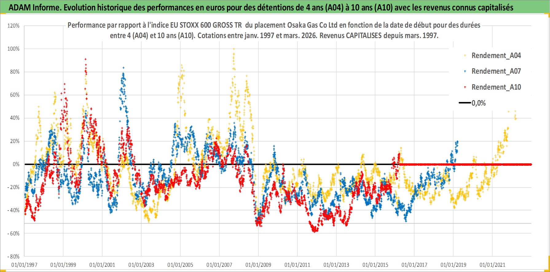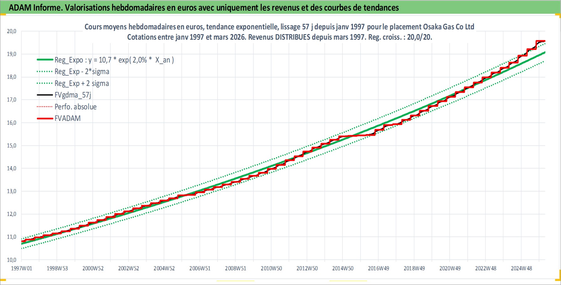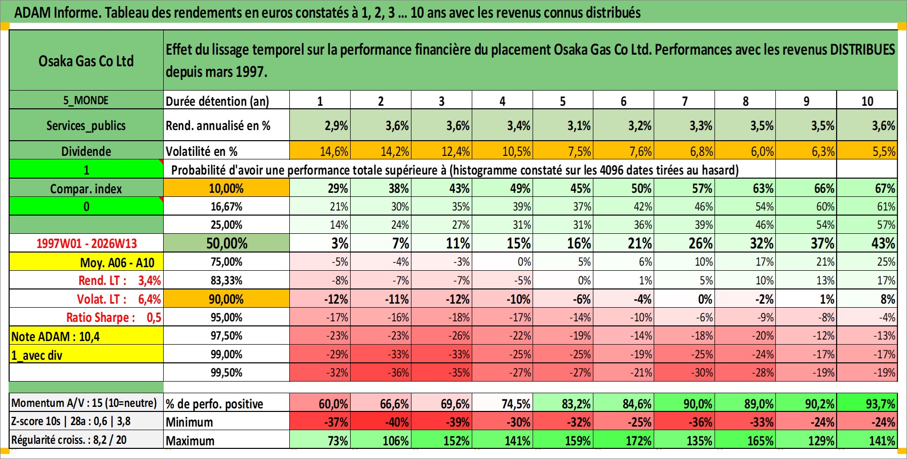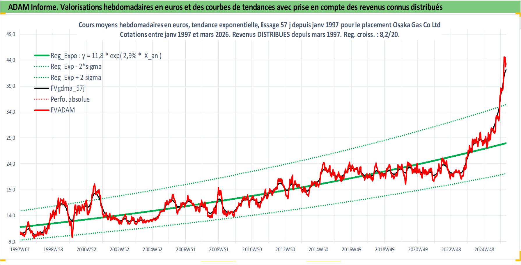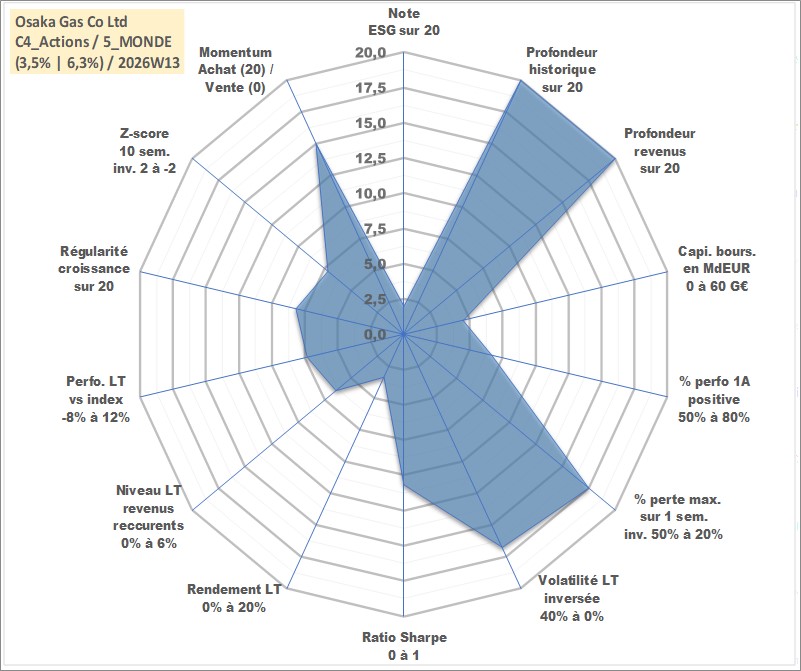 Site dédié aux investisseursPage dédiée sur site financeAnalyse des valorisations hebdomadaires de l'action Osaka Gas Co Ltd. Cet actif est cote en JPY. Les valorisations sont en contrevaleur EURO et couvrent les semaines 1997W01 a 2026W13. Les revenus de cet actif financier sont pris en compte depuis la semaine 1997W13. La note globale ESG de cet actif est estimee a 2.0 (apres rebasage entre 0 et 20).