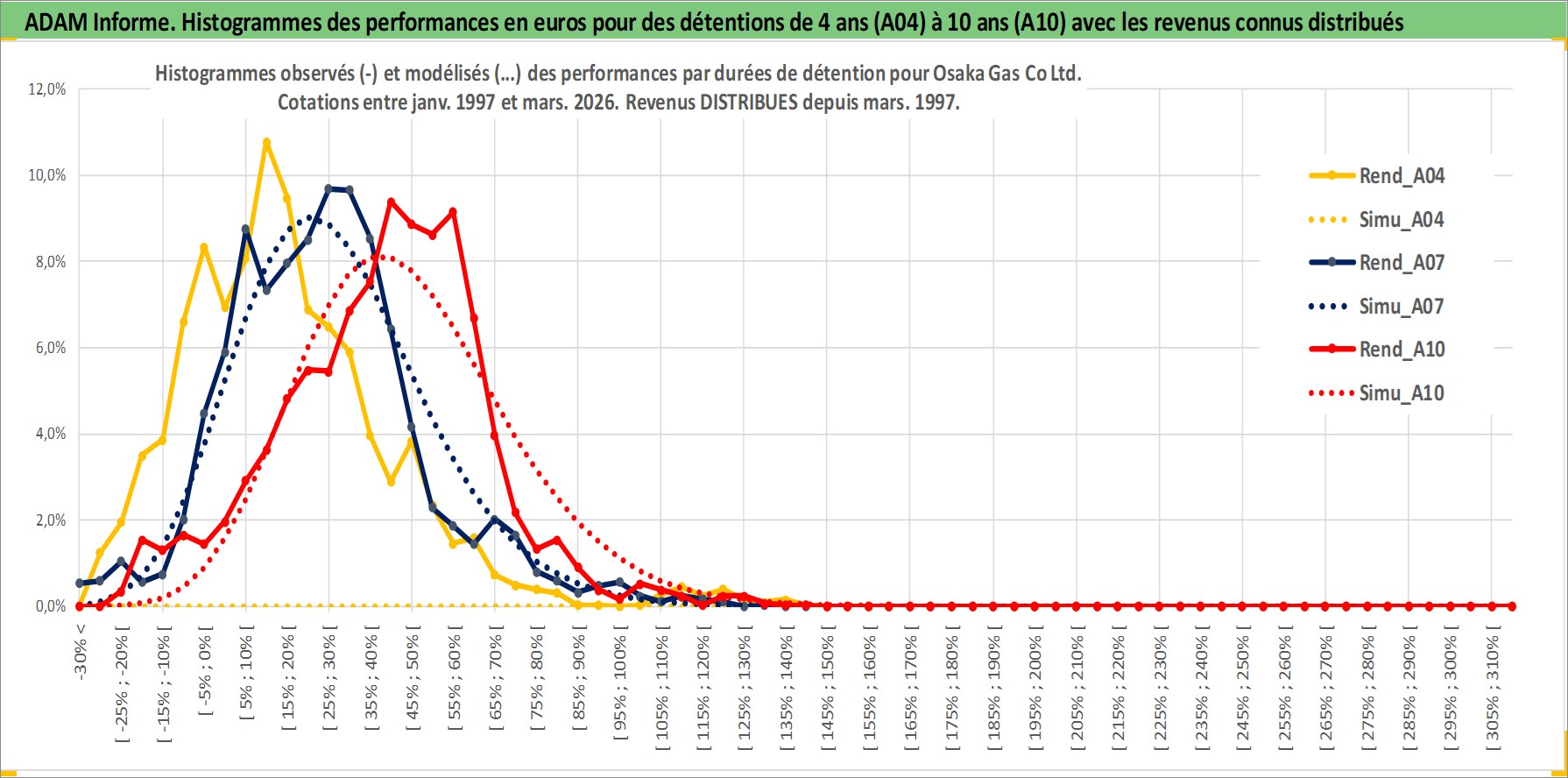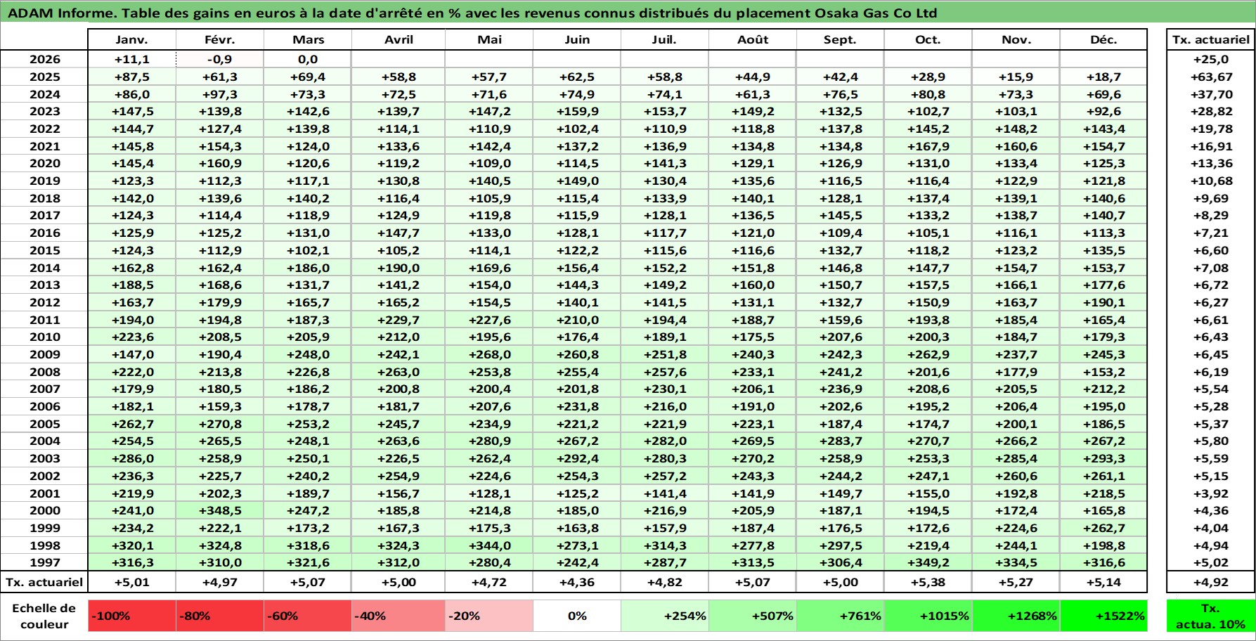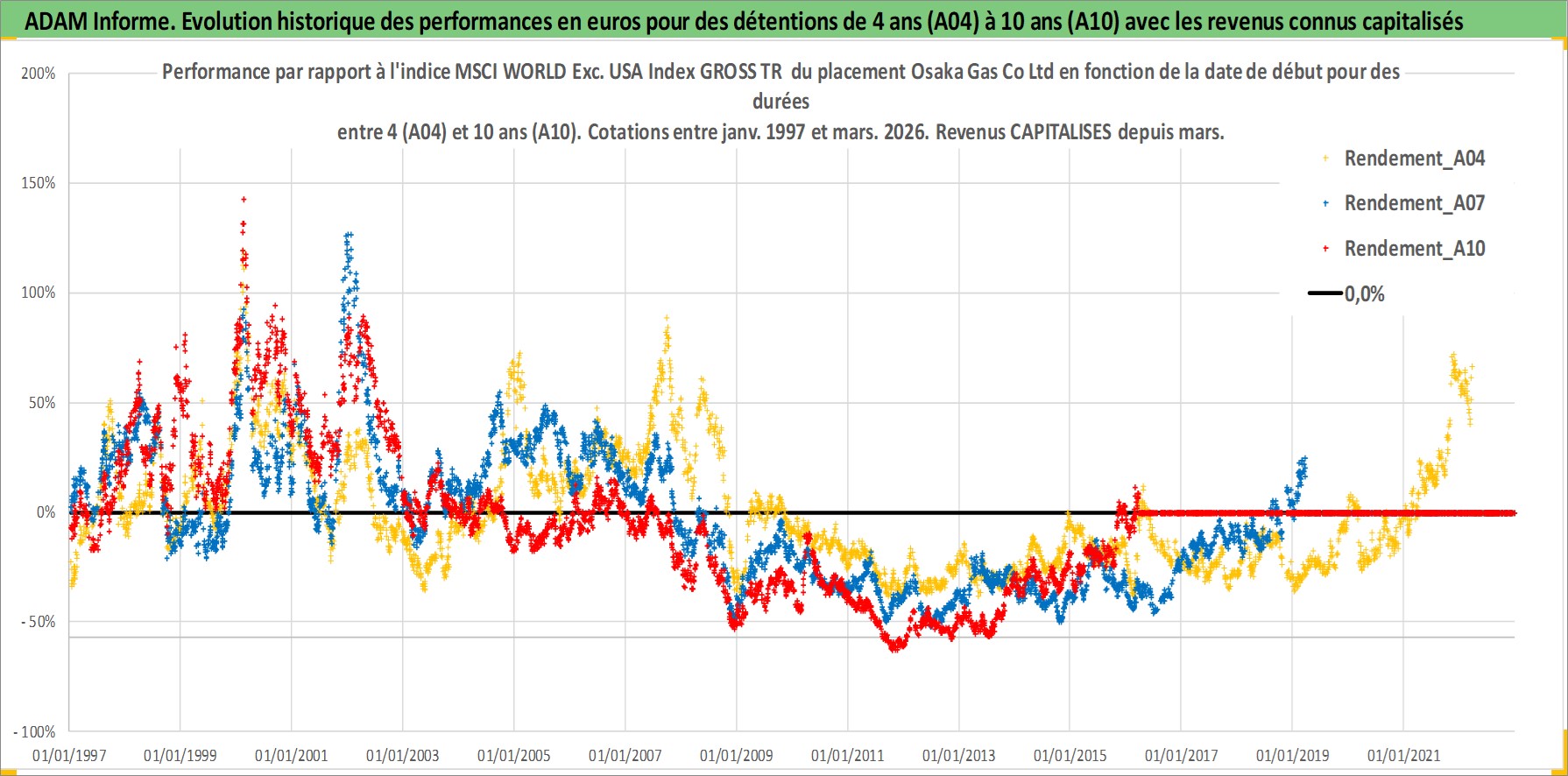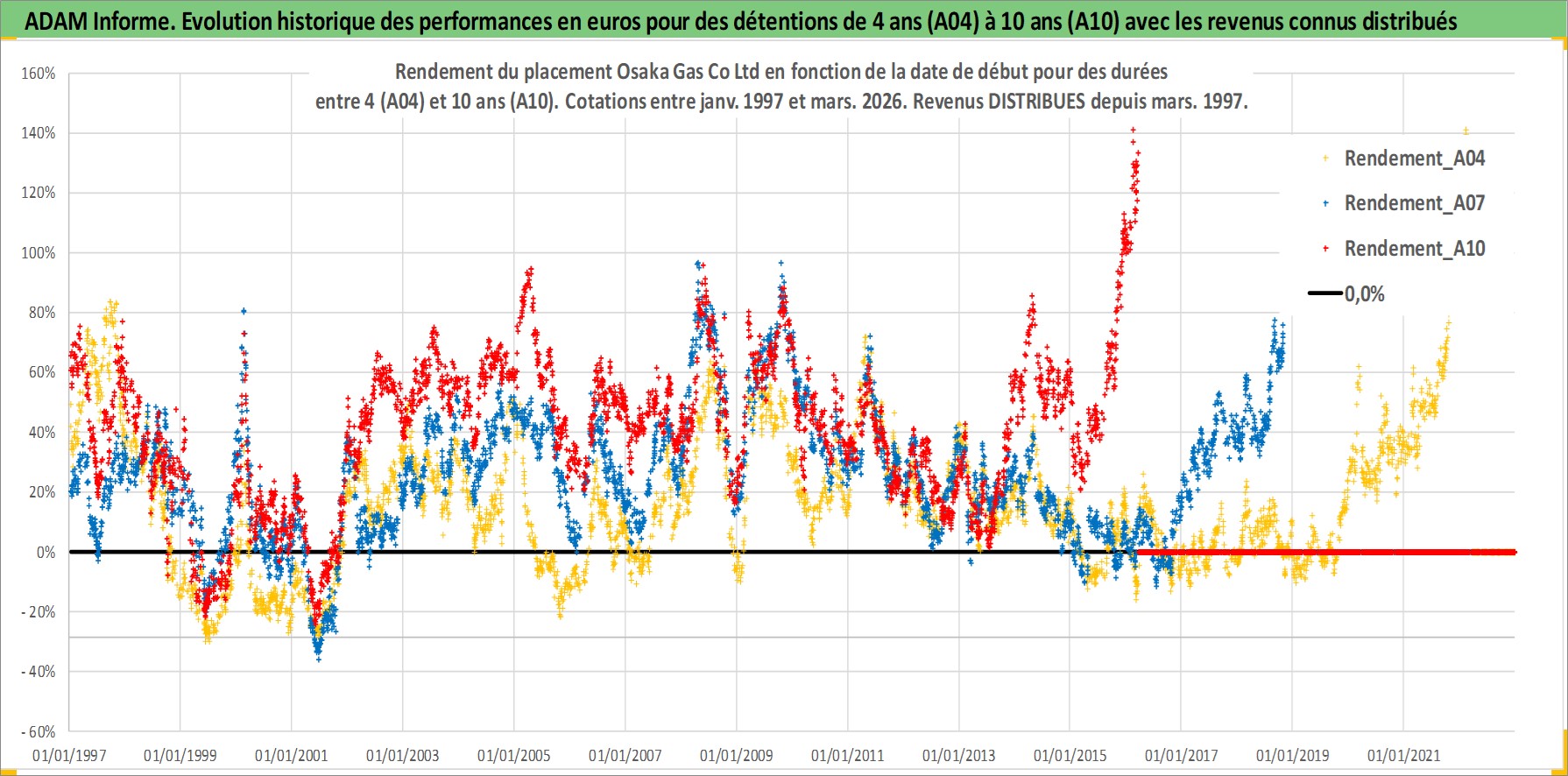 Site dédié aux investisseursPage dédiée sur site financeAnalyse des valorisations hebdomadaires de l'action Osaka Gas Co Ltd. Cet actif est cote en JPY. Les valorisations sont en contrevaleur EURO et couvrent les semaines 1997W01 a 2026W13. Les revenus de cet actif financier sont pris en compte depuis la semaine 1997W13. La note globale ESG de cet actif est estimee a 2.0 (apres rebasage entre 0 et 20).
