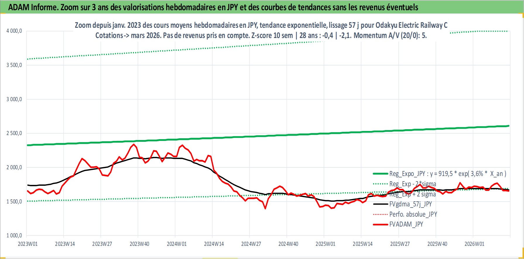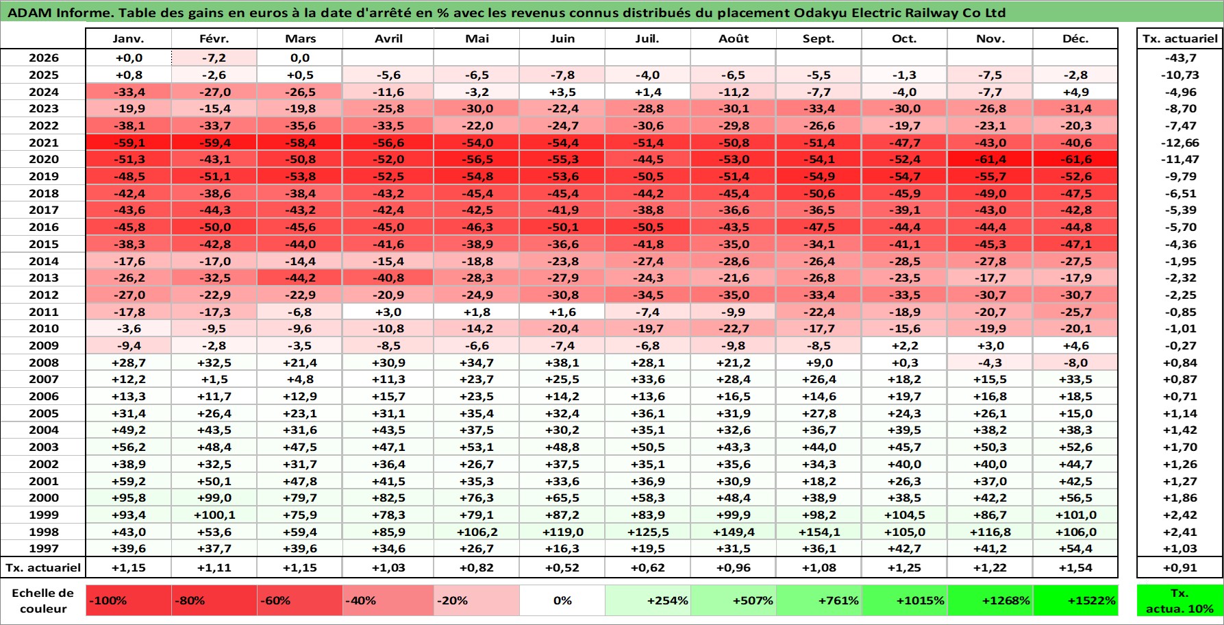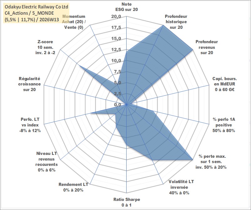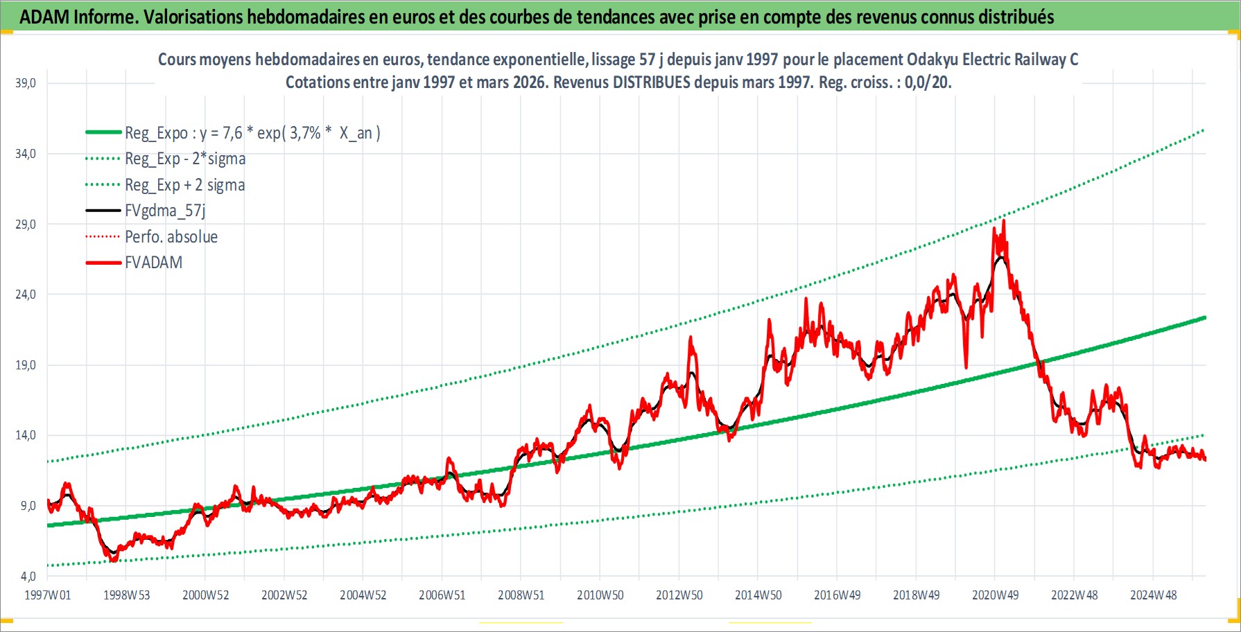 Site dédié aux investisseursPage dédiée sur site financeAnalyse des valorisations hebdomadaires de l'action Odakyu Electric Railway Co Ltd. Cet actif est cote en JPY. Les valorisations sont en contrevaleur EURO et couvrent les semaines 1997W01 a 2026W13. Les revenus de cet actif financier sont pris en compte depuis la semaine 1997W13. La note globale ESG de cet actif est estimee a 12.0 (apres rebasage entre 0 et 20).