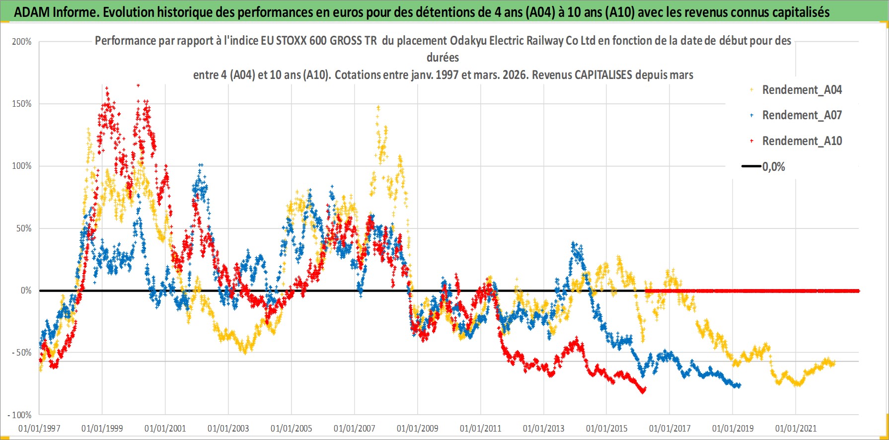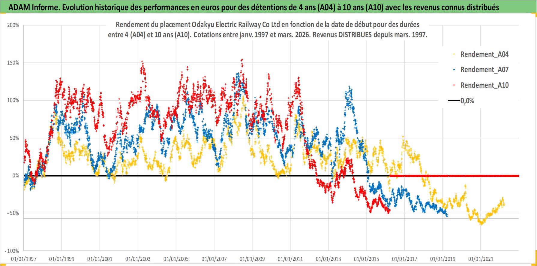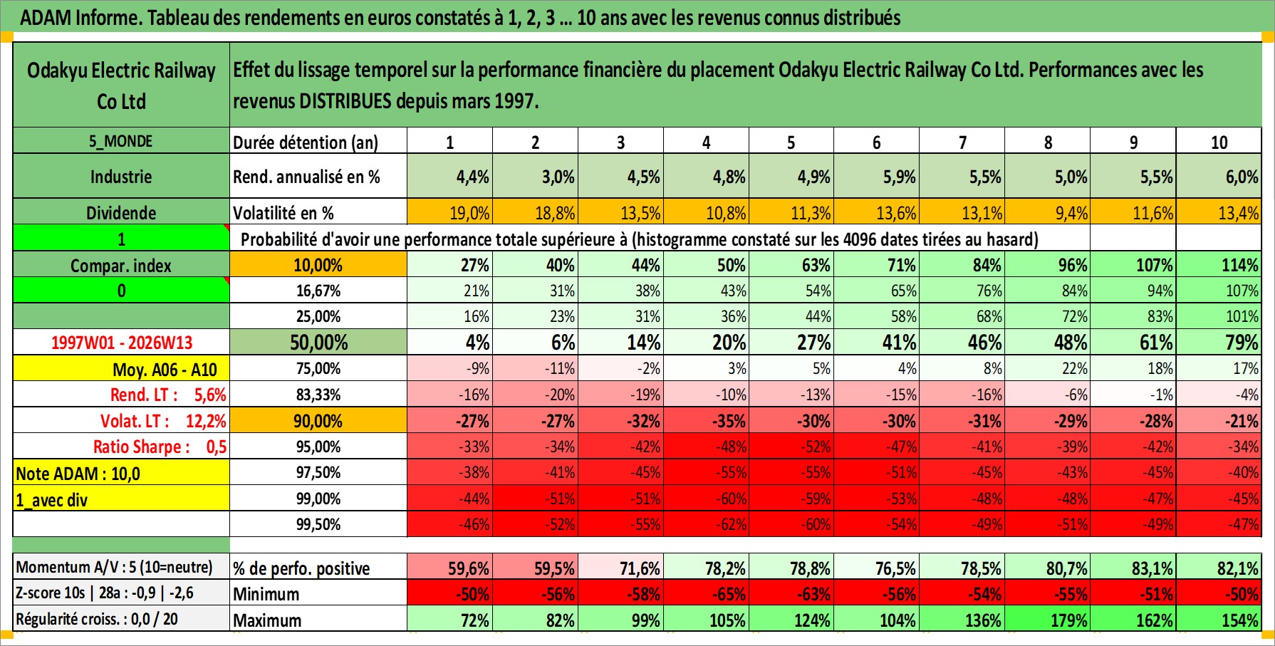 Site dédié aux investisseursPage dédiée sur site financeAnalyse des valorisations hebdomadaires de l'action Odakyu Electric Railway Co Ltd. Cet actif est cote en JPY. Les valorisations sont en contrevaleur EURO et couvrent les semaines 1997W01 a 2026W13. Les revenus de cet actif financier sont pris en compte depuis la semaine 1997W13. La note globale ESG de cet actif est estimee a 12.0 (apres rebasage entre 0 et 20).
