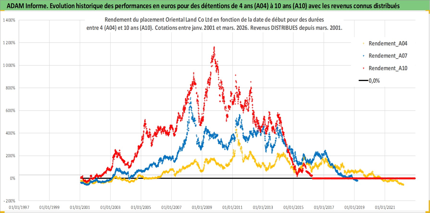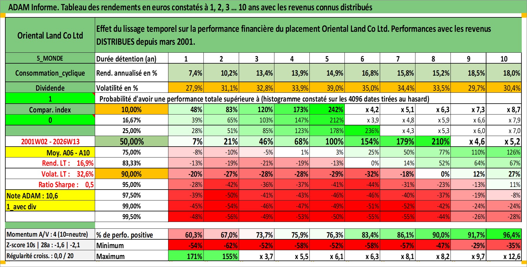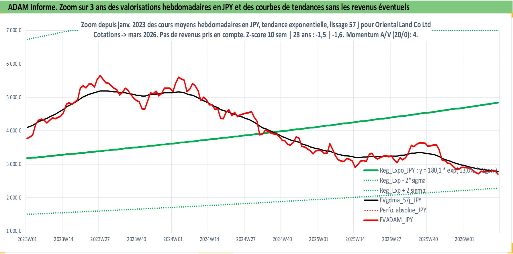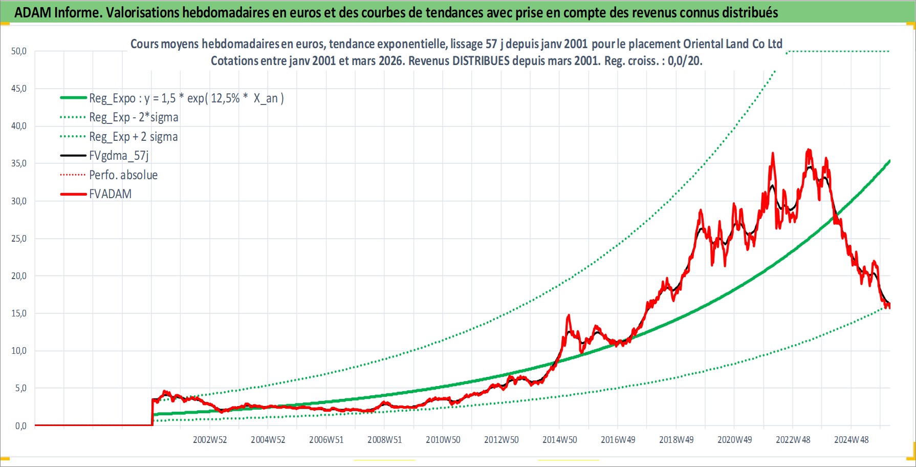Site dédié aux investisseursPage dédiée sur site financeAnalyse des valorisations hebdomadaires de l'action Oriental Land Co Ltd. Cet actif est cote en JPY. Les valorisations sont en contrevaleur EURO et couvrent les semaines 2001W02 a 2026W13. Les revenus de cet actif financier sont pris en compte depuis la semaine 2001W13. La note globale ESG de cet actif est estimee a 9.0 (apres rebasage entre 0 et 20).