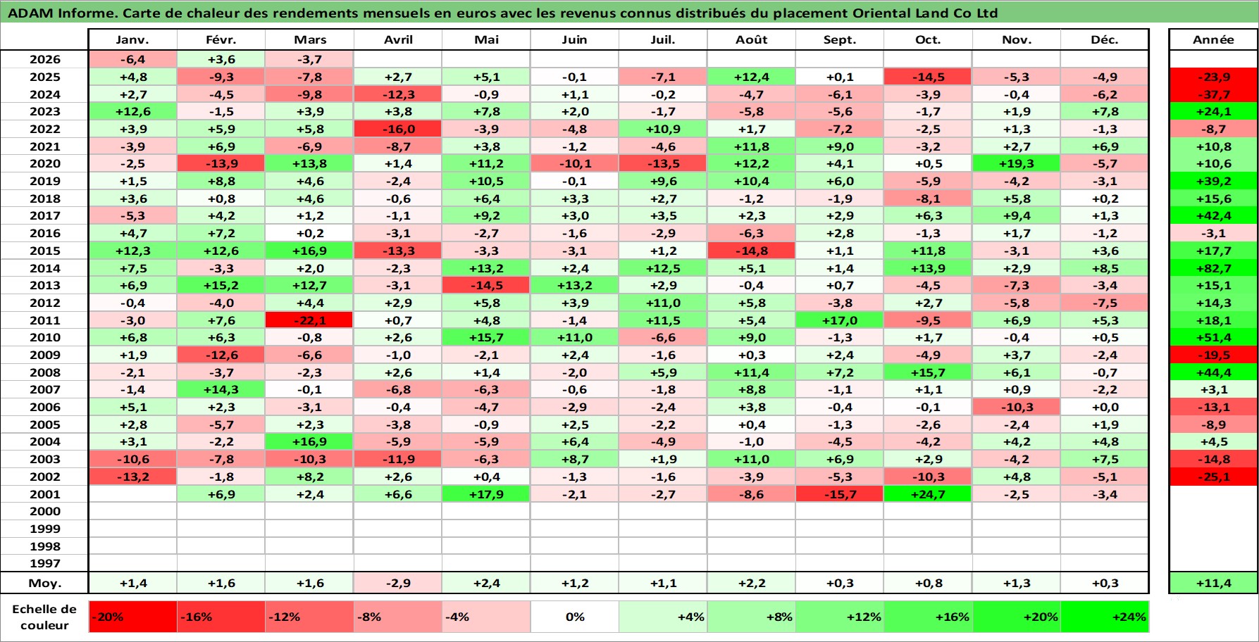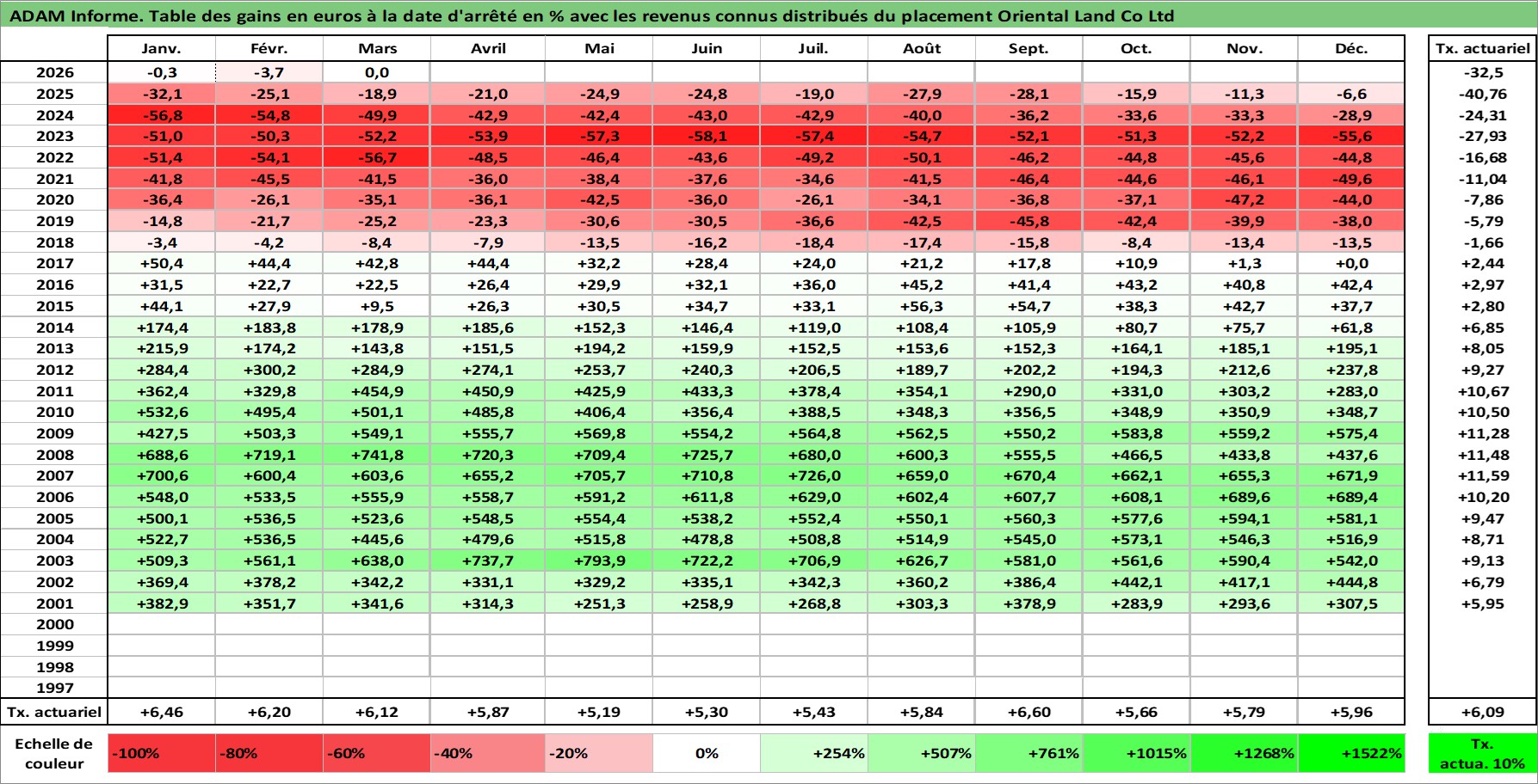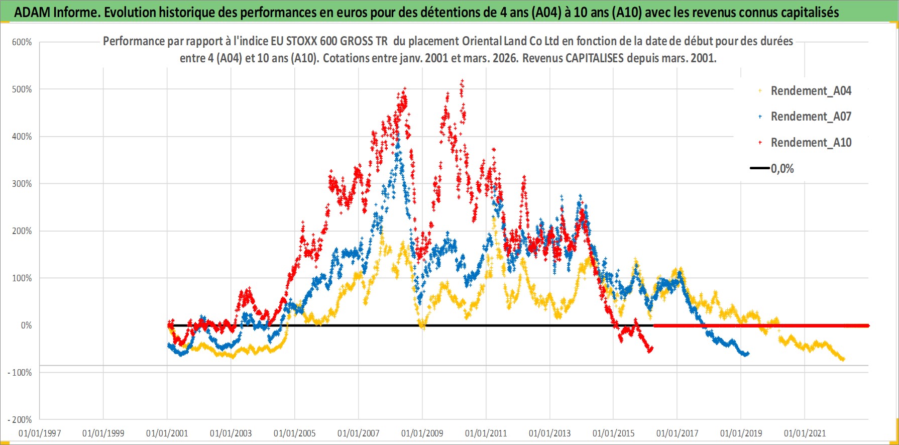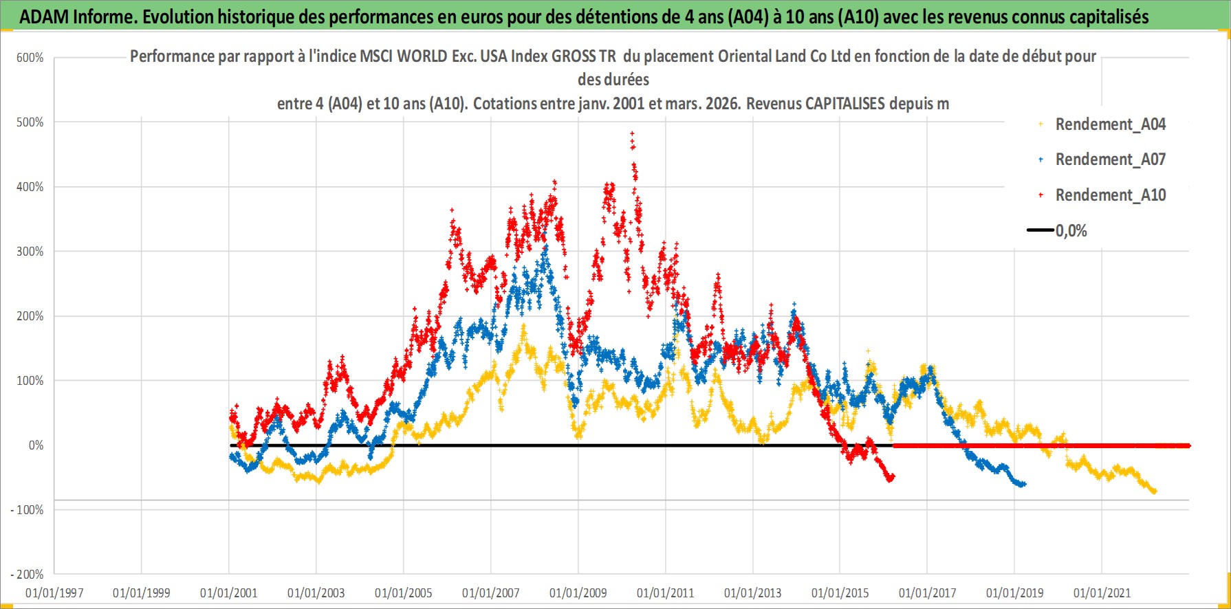 Site dédié aux investisseursPage dédiée sur site financeAnalyse des valorisations hebdomadaires de l'action Oriental Land Co Ltd. Cet actif est cote en JPY. Les valorisations sont en contrevaleur EURO et couvrent les semaines 2001W02 a 2026W13. Les revenus de cet actif financier sont pris en compte depuis la semaine 2001W13. La note globale ESG de cet actif est estimee a 9.0 (apres rebasage entre 0 et 20).
