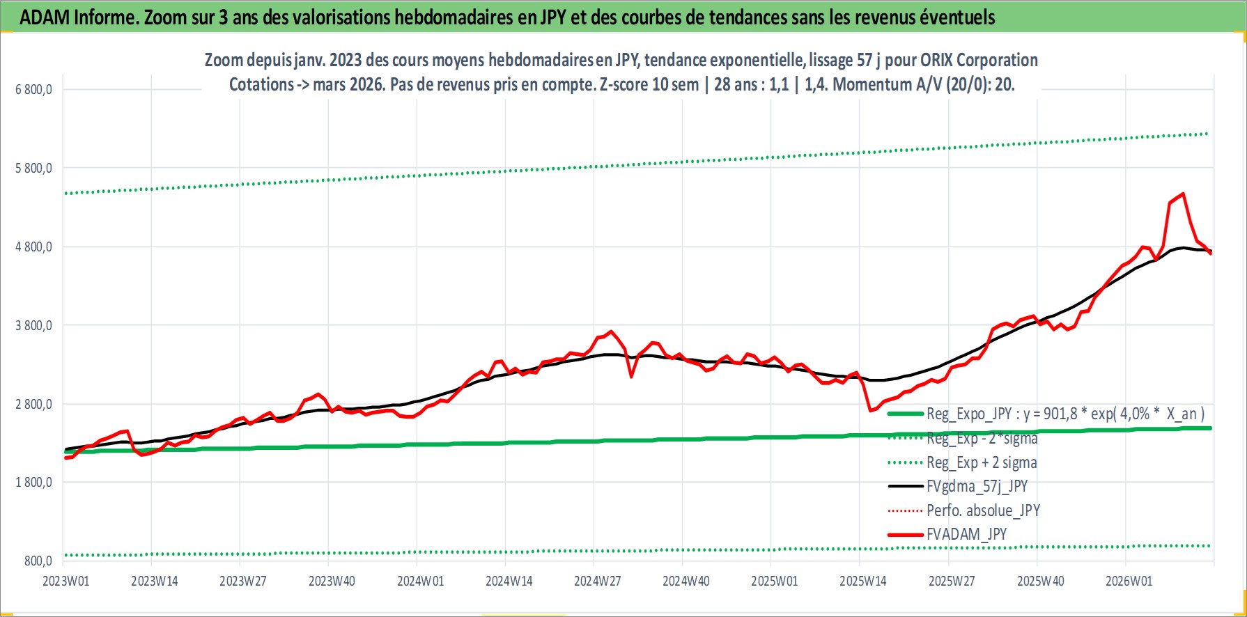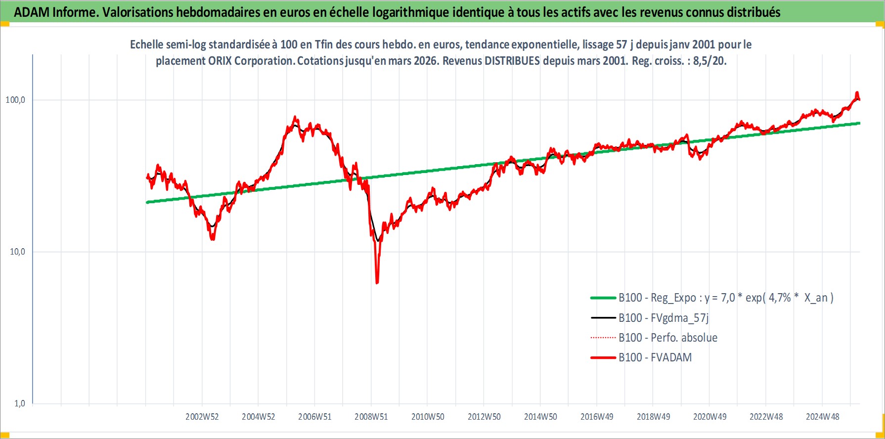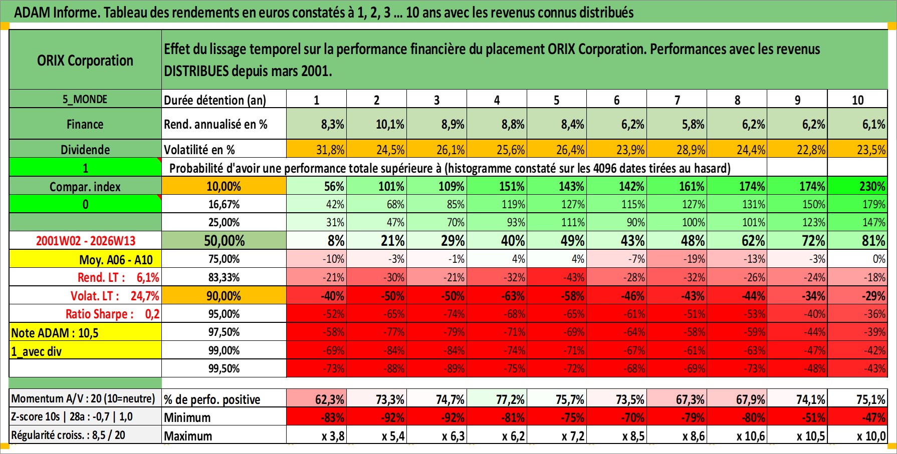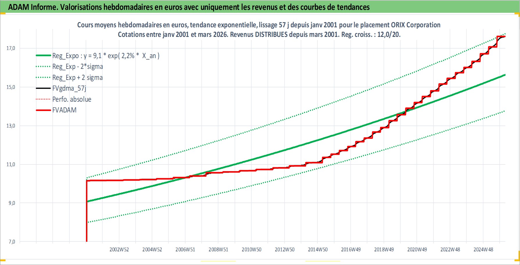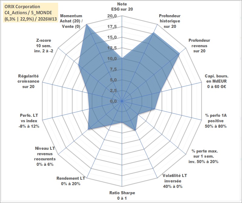 Site dédié aux investisseursPage dédiée sur site financeAnalyse des valorisations hebdomadaires de l'action ORIX Corporation. Cet actif est cote en JPY. Les valorisations sont en contrevaleur EURO et couvrent les semaines 2001W02 a 2026W13. Les revenus de cet actif financier sont pris en compte depuis la semaine 2001W13. La note globale ESG de cet actif est estimee a 10.0 (apres rebasage entre 0 et 20).