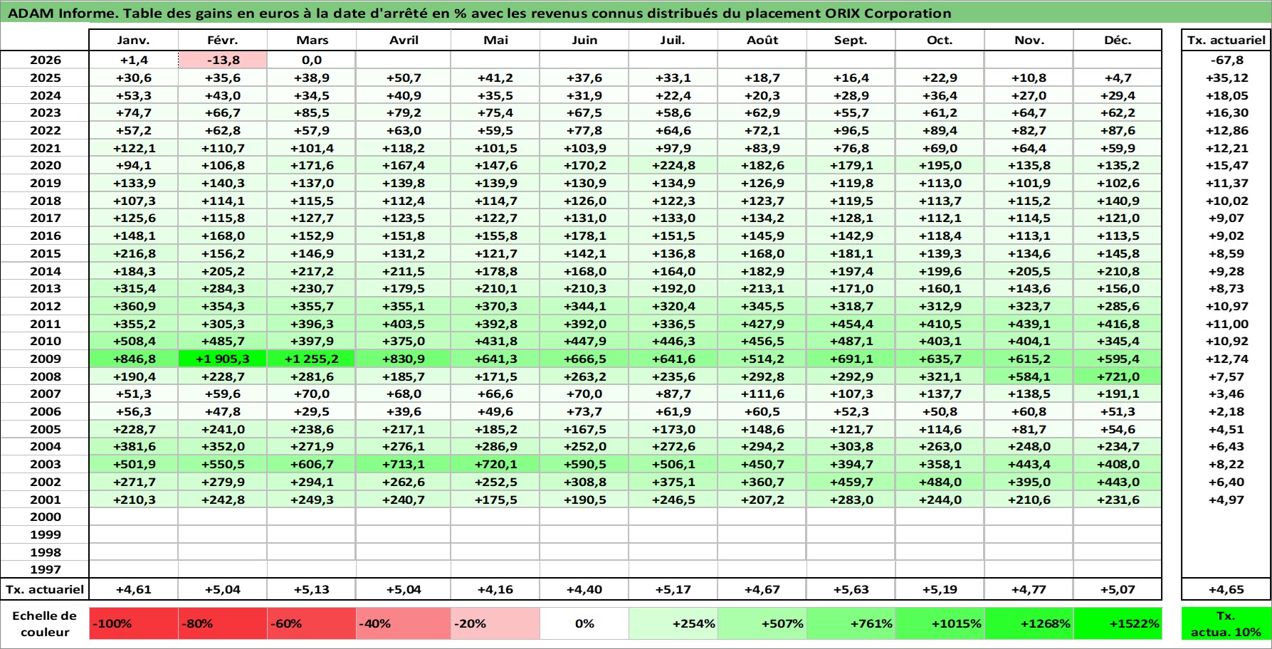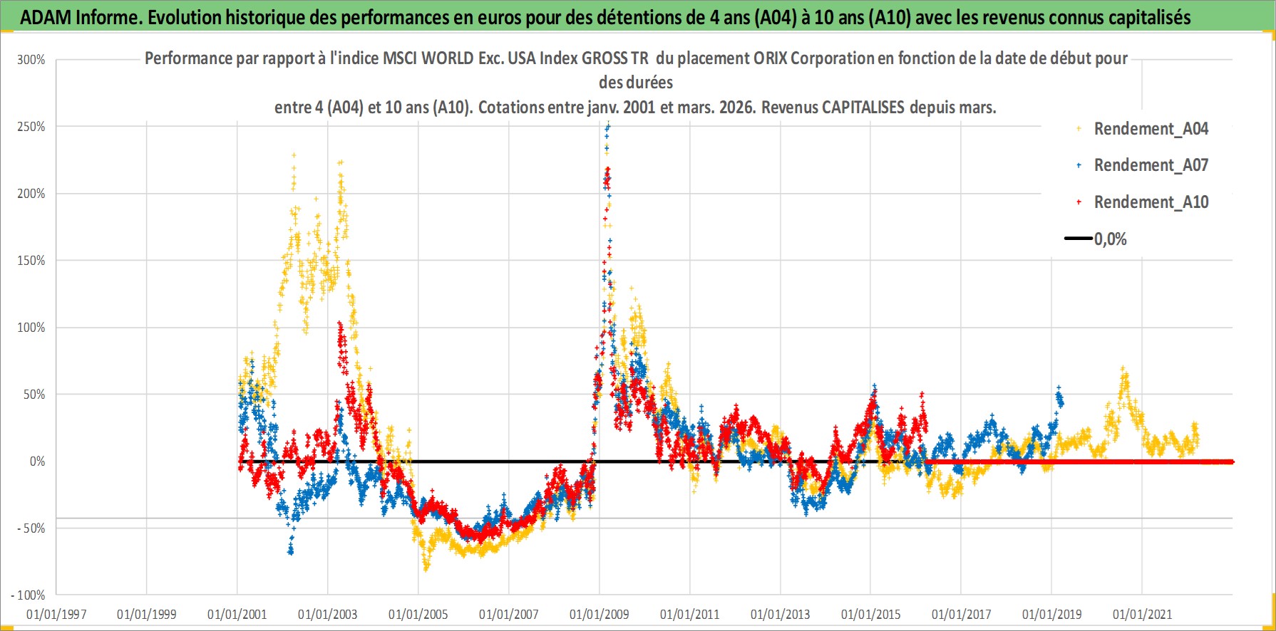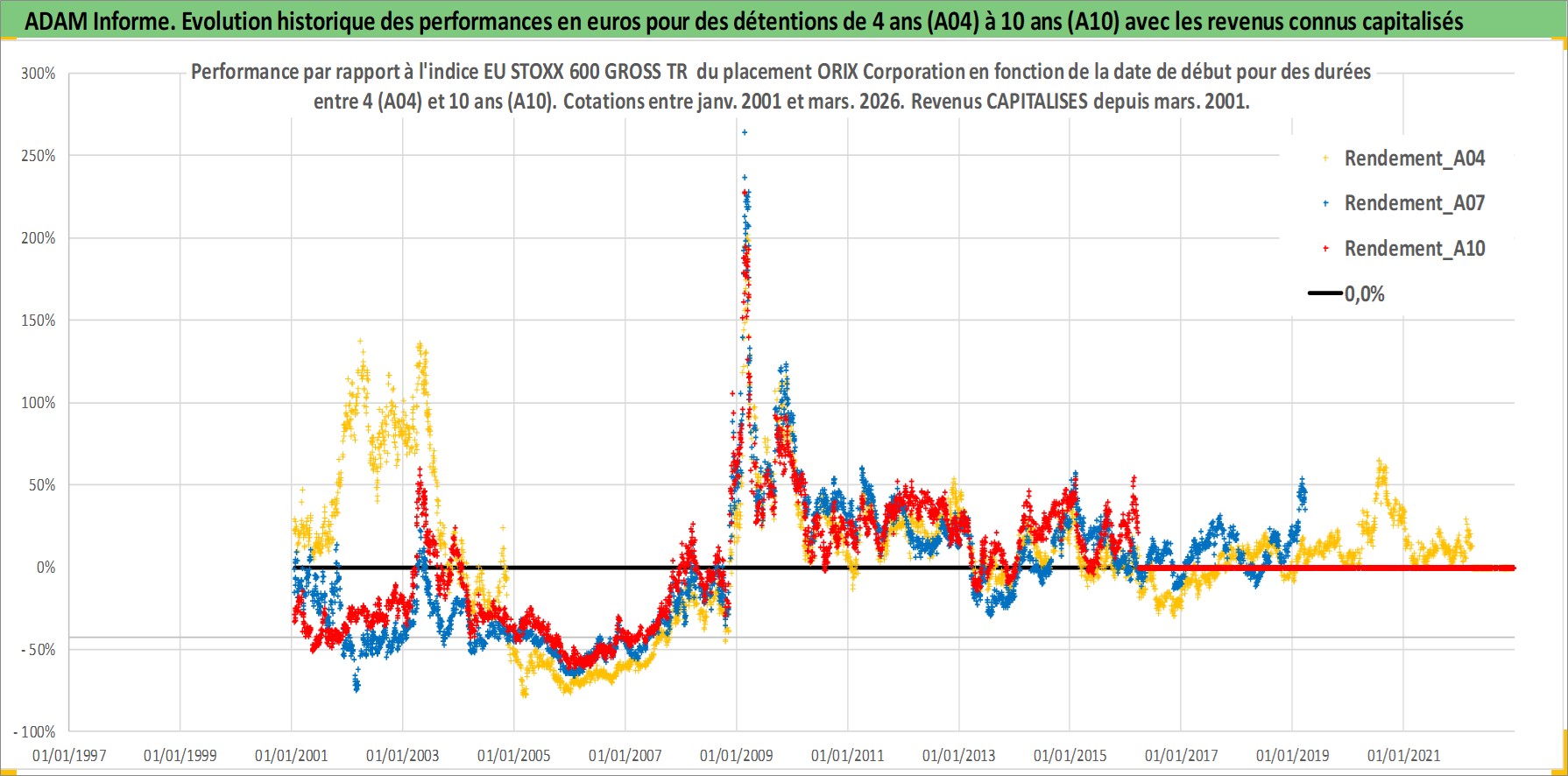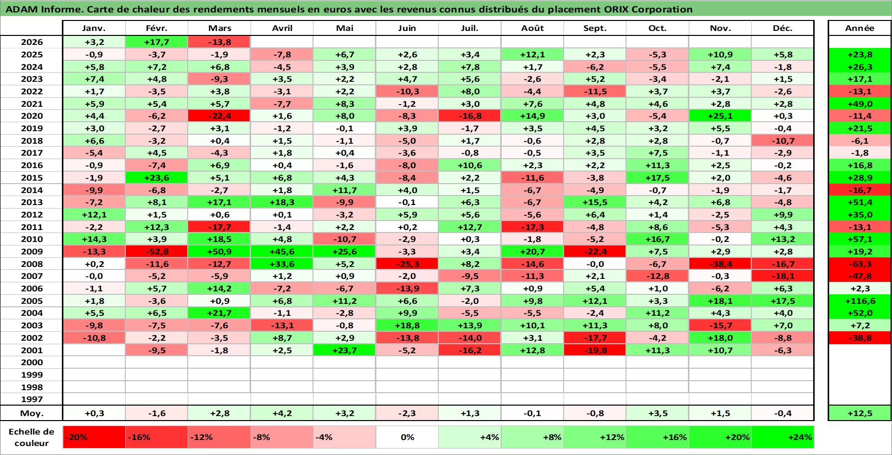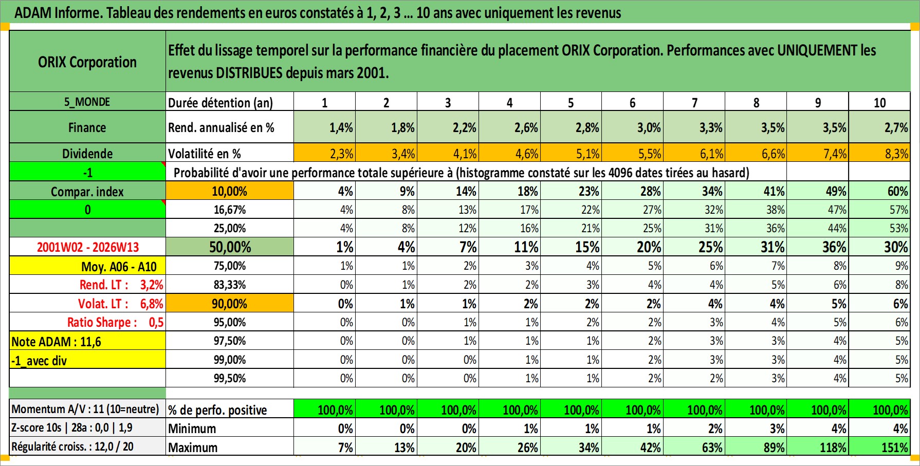 Site dédié aux investisseursPage dédiée sur site financeAnalyse des valorisations hebdomadaires de l'action ORIX Corporation. Cet actif est cote en JPY. Les valorisations sont en contrevaleur EURO et couvrent les semaines 2001W02 a 2026W13. Les revenus de cet actif financier sont pris en compte depuis la semaine 2001W13. La note globale ESG de cet actif est estimee a 10.0 (apres rebasage entre 0 et 20).