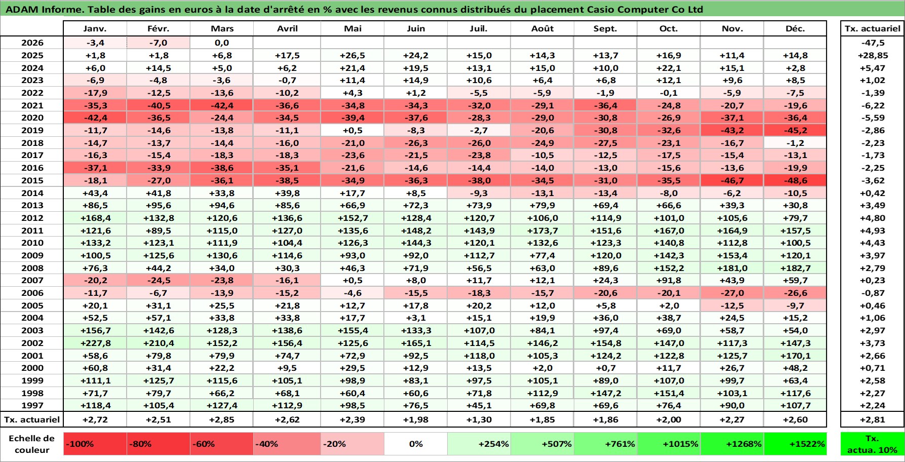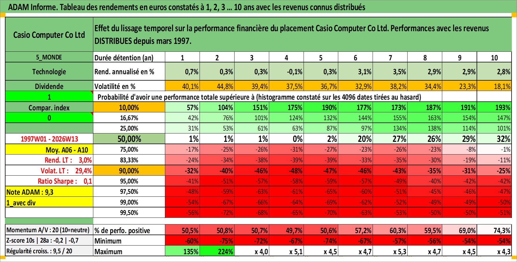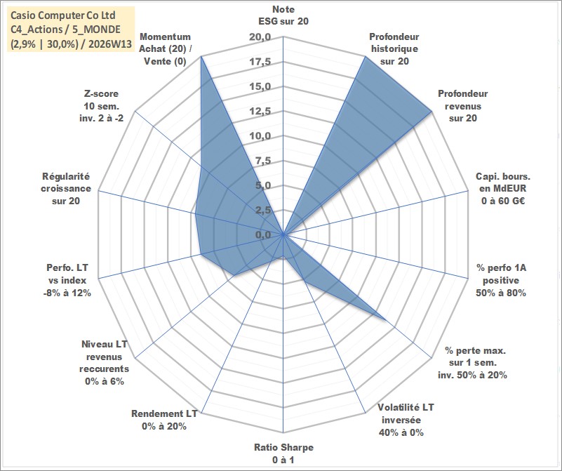 Site dédié aux investisseursPage dédiée sur site financeAnalyse des valorisations hebdomadaires de l'action Casio Computer Co Ltd. Cet actif est cote en JPY. Les valorisations sont en contrevaleur EURO et couvrent les semaines 1997W01 a 2026W13. Les revenus de cet actif financier sont pris en compte depuis la semaine 1997W13. La note ESG de cet actif n'est pas connue.