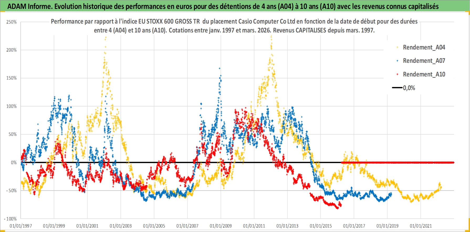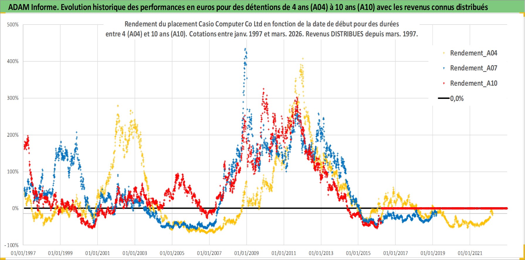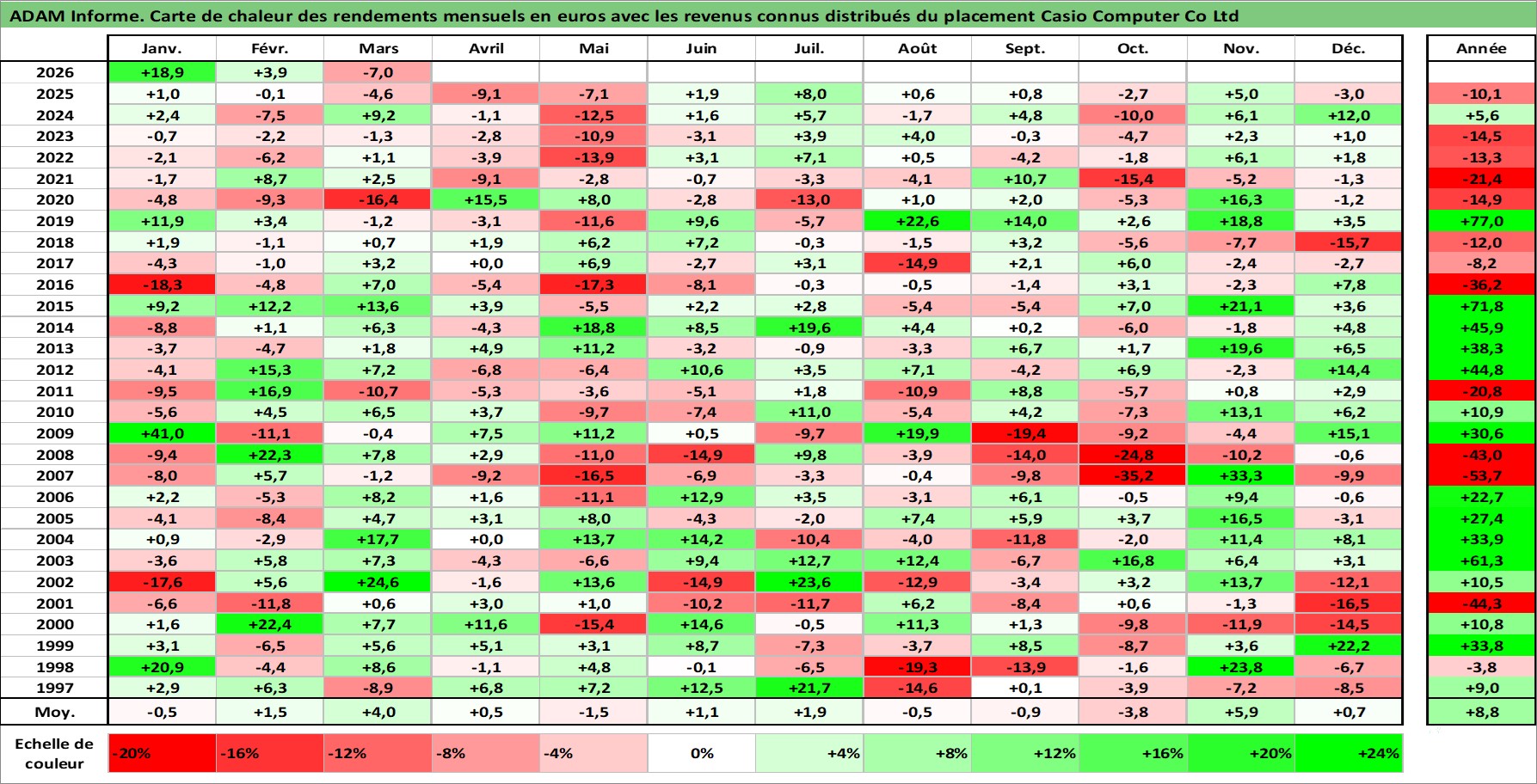 Site dédié aux investisseursPage dédiée sur site financeAnalyse des valorisations hebdomadaires de l'action Casio Computer Co Ltd. Cet actif est cote en JPY. Les valorisations sont en contrevaleur EURO et couvrent les semaines 1997W01 a 2026W13. Les revenus de cet actif financier sont pris en compte depuis la semaine 1997W13. La note ESG de cet actif n'est pas connue.