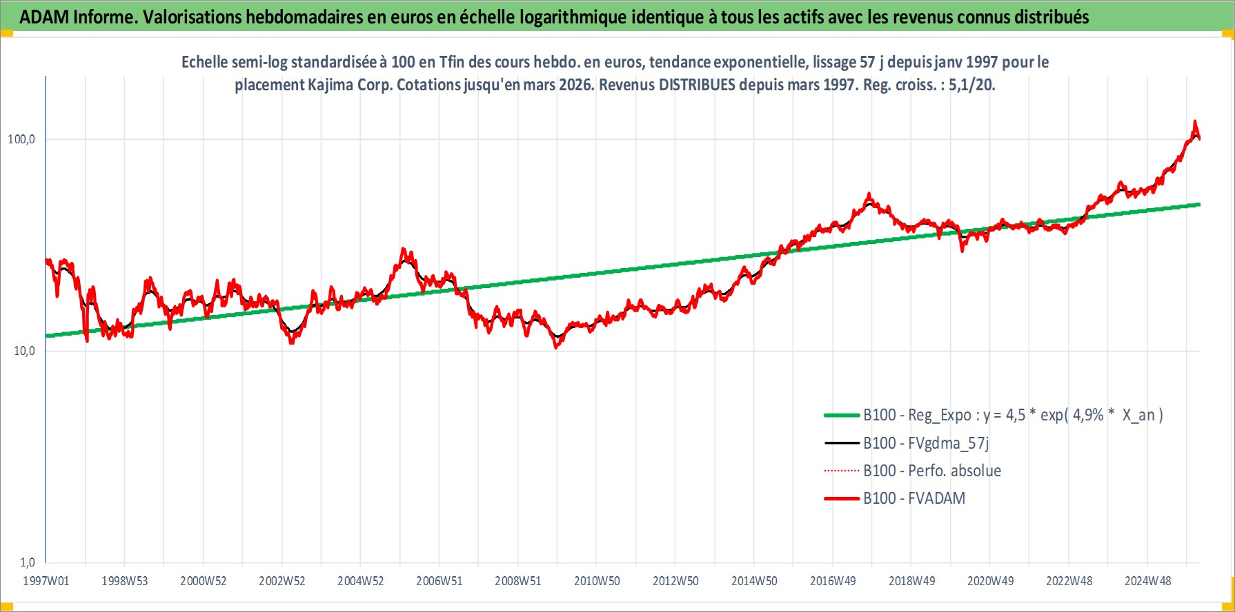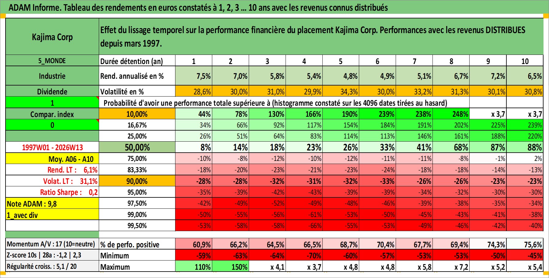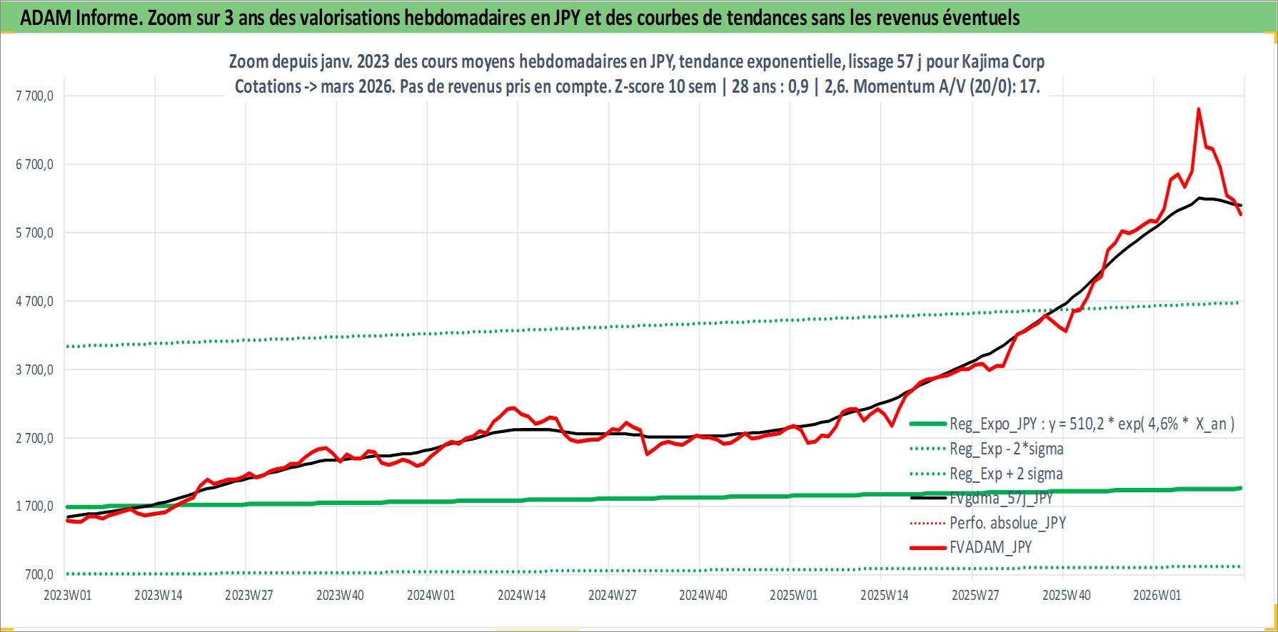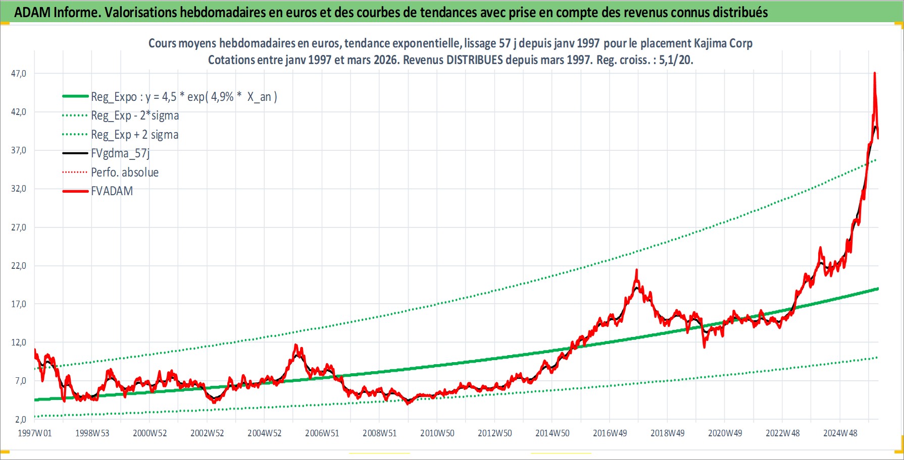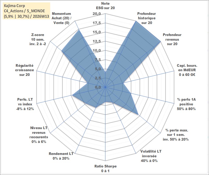Site dédié aux investisseursPage dédiée sur site financeAnalyse des valorisations hebdomadaires de l'action Kajima Corp. Cet actif est cote en JPY. Les valorisations sont en contrevaleur EURO et couvrent les semaines 1997W01 a 2026W13. Les revenus de cet actif financier sont pris en compte depuis la semaine 1997W13. La note globale ESG de cet actif est estimee a 4.0 (apres rebasage entre 0 et 20).