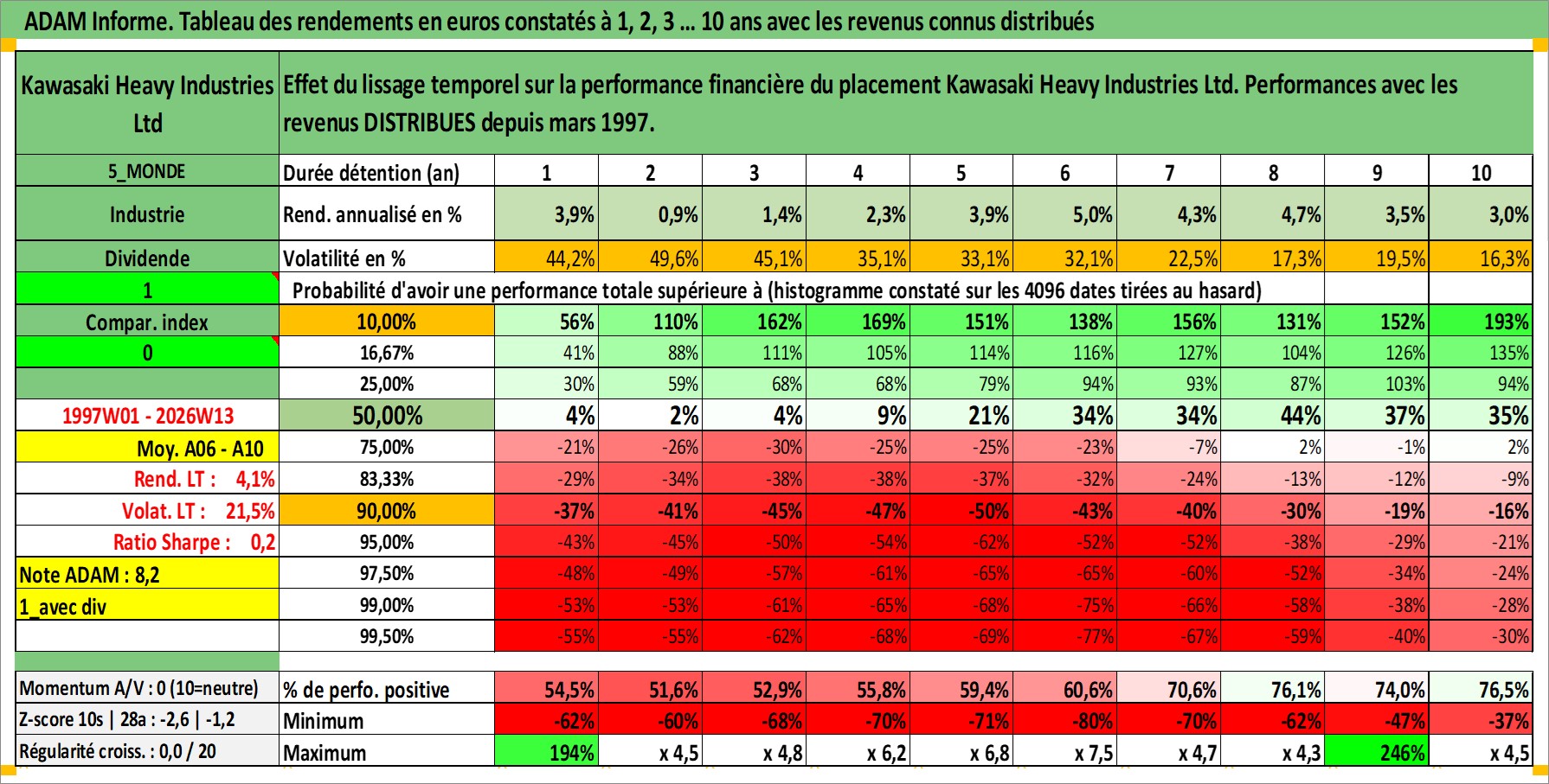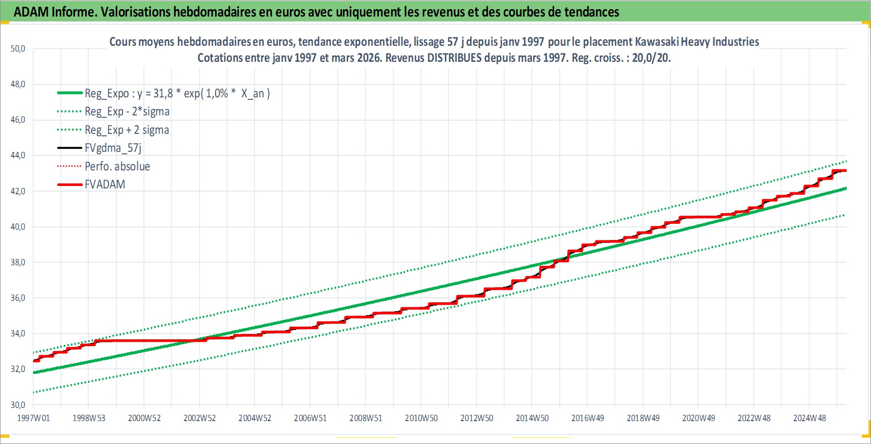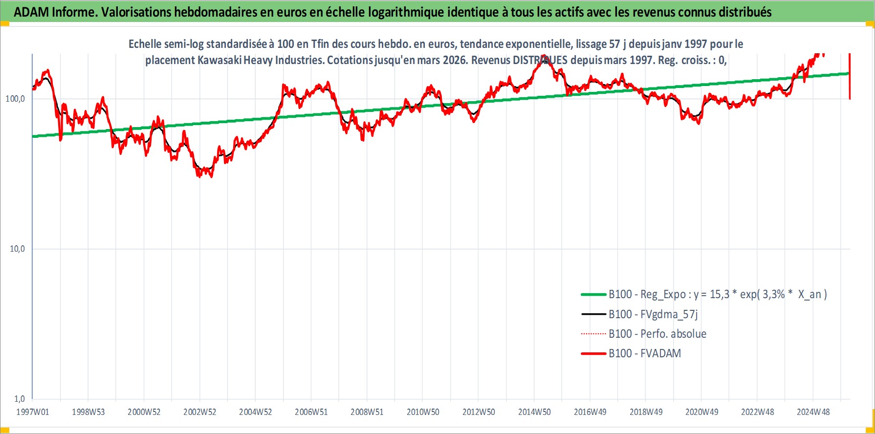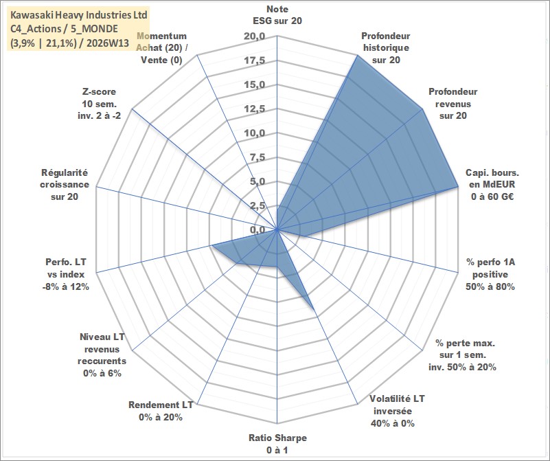 Site dédié aux investisseursPage dédiée sur site financeAnalyse des valorisations hebdomadaires de l'action Kawasaki Heavy Industries Ltd. Cet actif est cote en JPY. Les valorisations sont en contrevaleur EURO et couvrent les semaines 1997W01 a 2026W13. Les revenus de cet actif financier sont pris en compte depuis la semaine 1997W13. La note globale ESG de cet actif est estimee a 2.0 (apres rebasage entre 0 et 20).