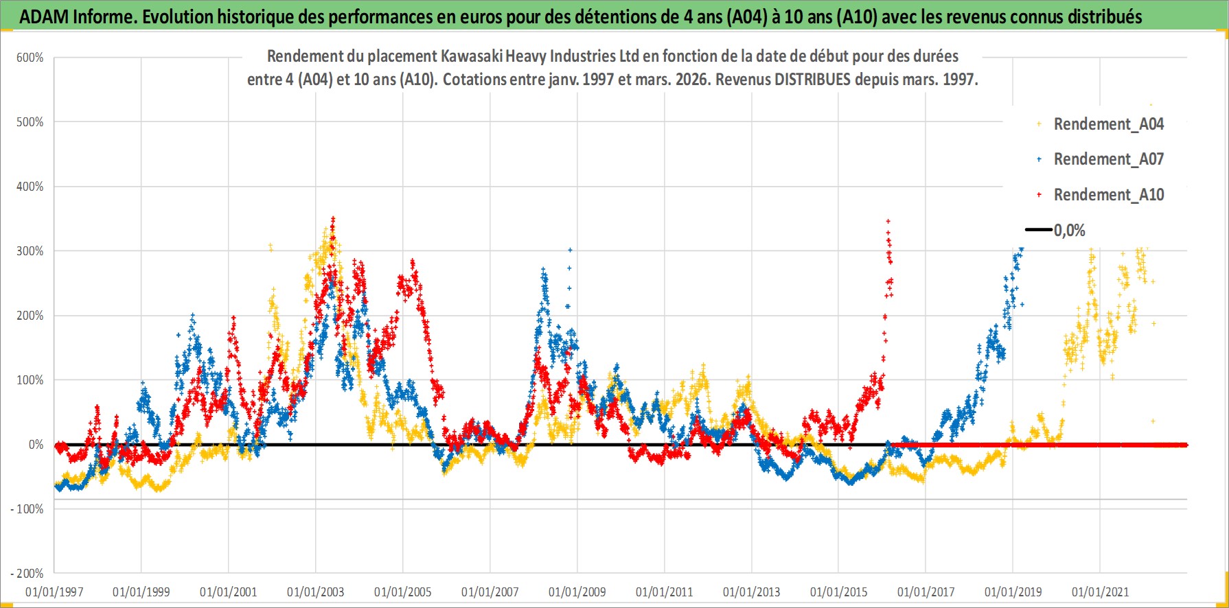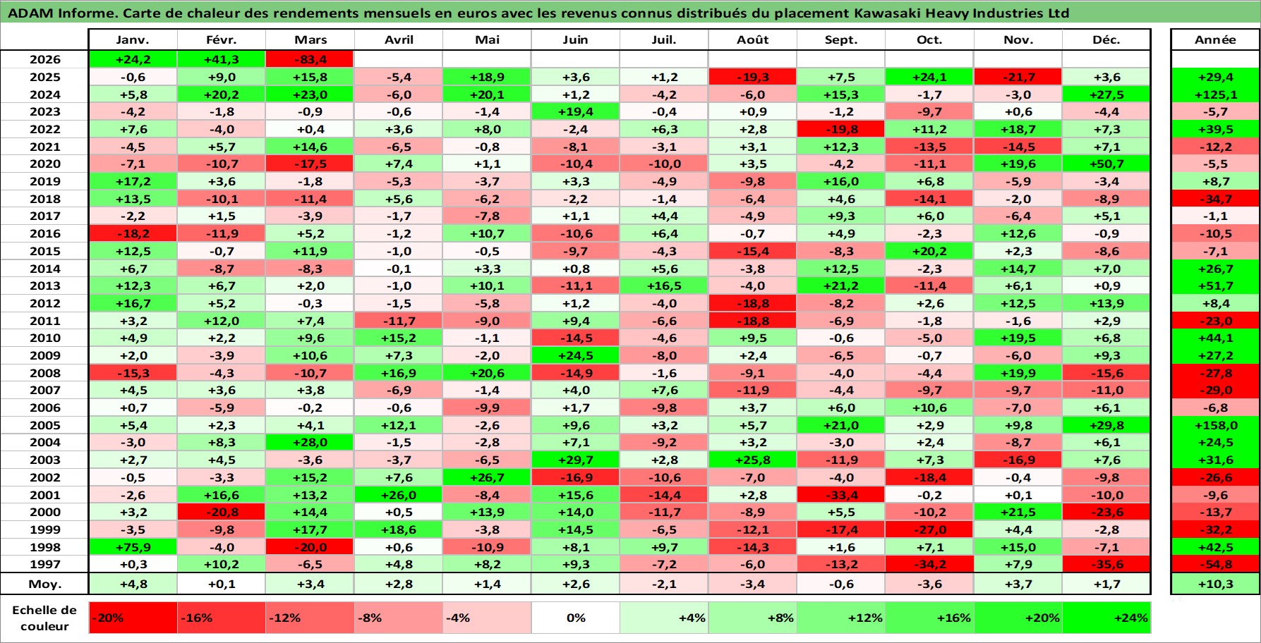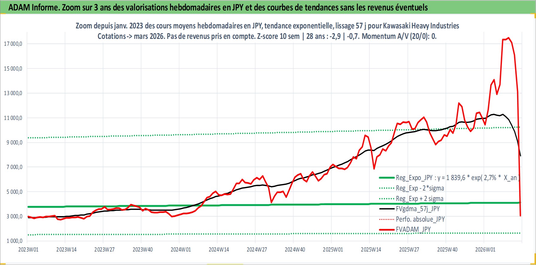 Site dédié aux investisseursPage dédiée sur site financeAnalyse des valorisations hebdomadaires de l'action Kawasaki Heavy Industries Ltd. Cet actif est cote en JPY. Les valorisations sont en contrevaleur EURO et couvrent les semaines 1997W01 a 2026W13. Les revenus de cet actif financier sont pris en compte depuis la semaine 1997W13. La note globale ESG de cet actif est estimee a 2.0 (apres rebasage entre 0 et 20).
