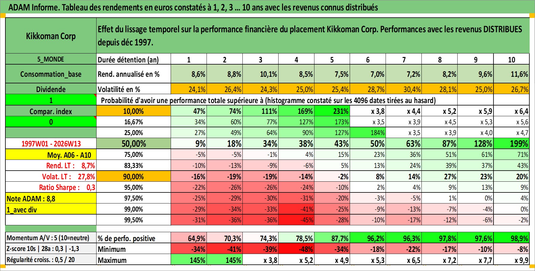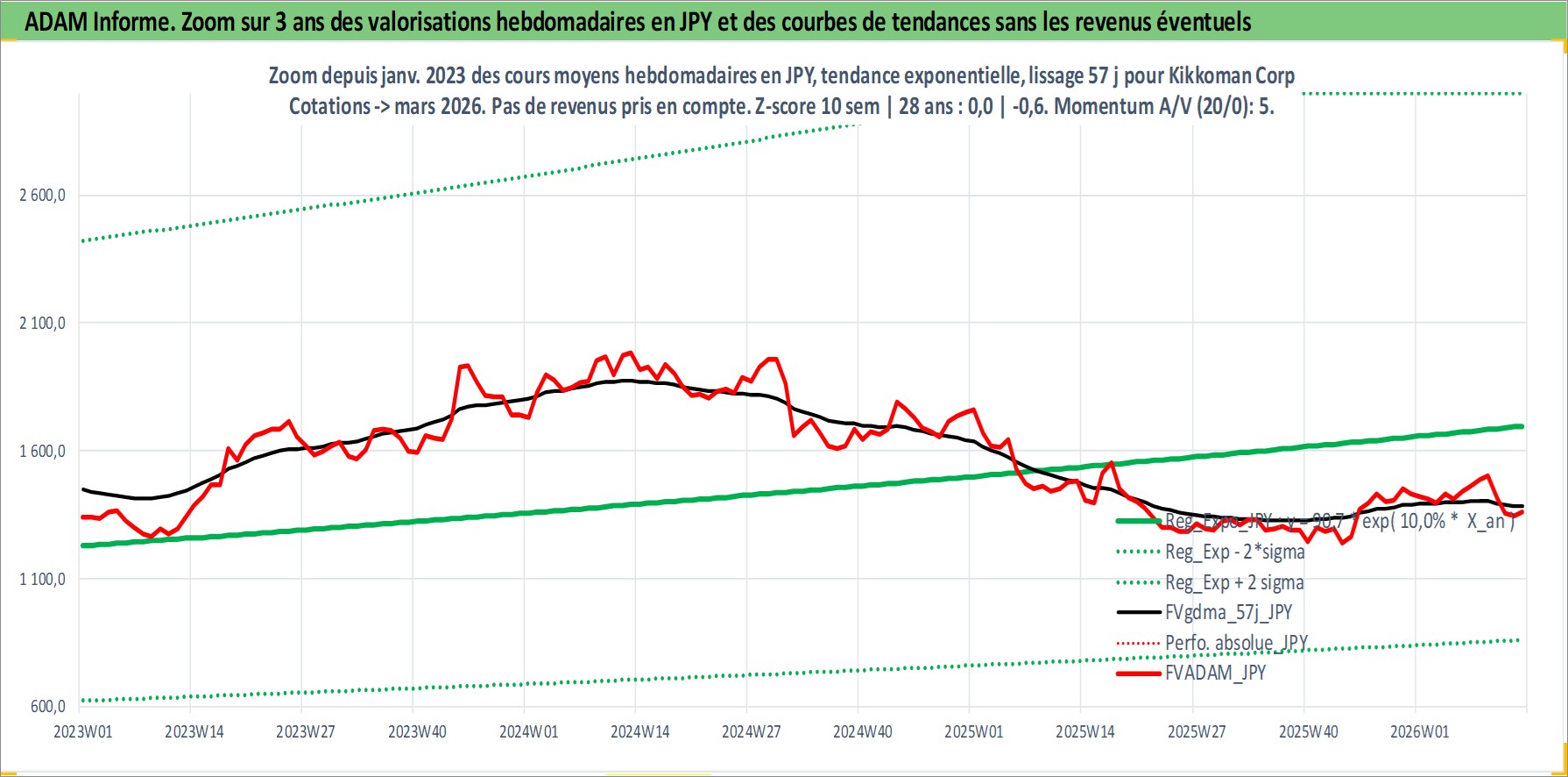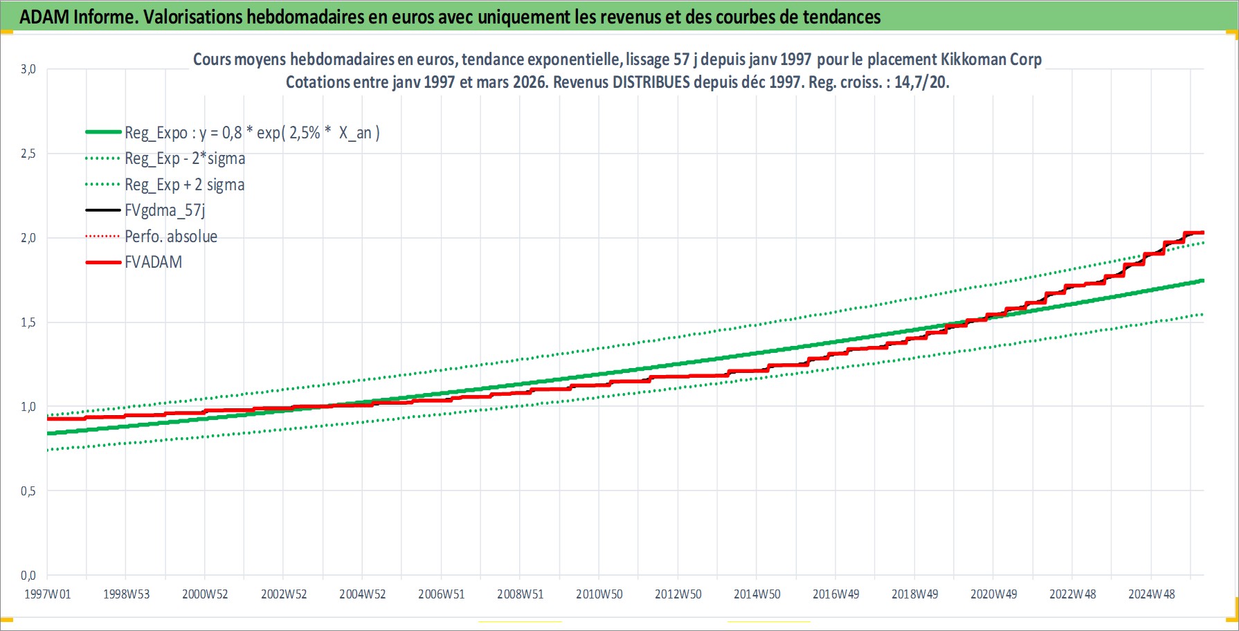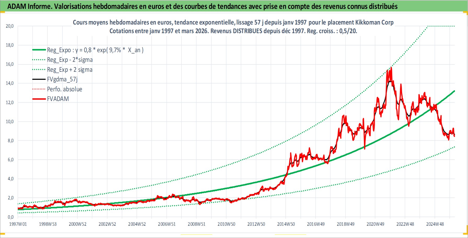 Site dédié aux investisseursPage dédiée sur site financeAnalyse des valorisations hebdomadaires de l'action Kikkoman Corp. Cet actif est cote en JPY. Les valorisations sont en contrevaleur EURO et couvrent les semaines 1997W01 a 2026W13. Les revenus de cet actif financier sont pris en compte depuis la semaine 1997W52. La note globale ESG de cet actif est estimee a 3.0 (apres rebasage entre 0 et 20).