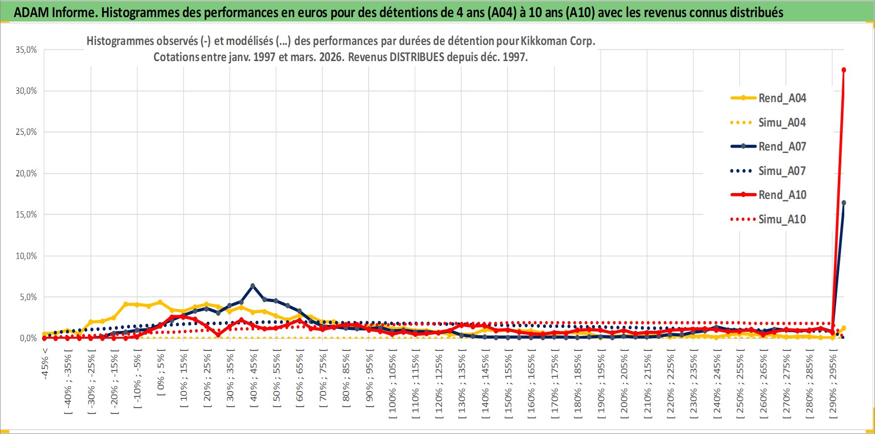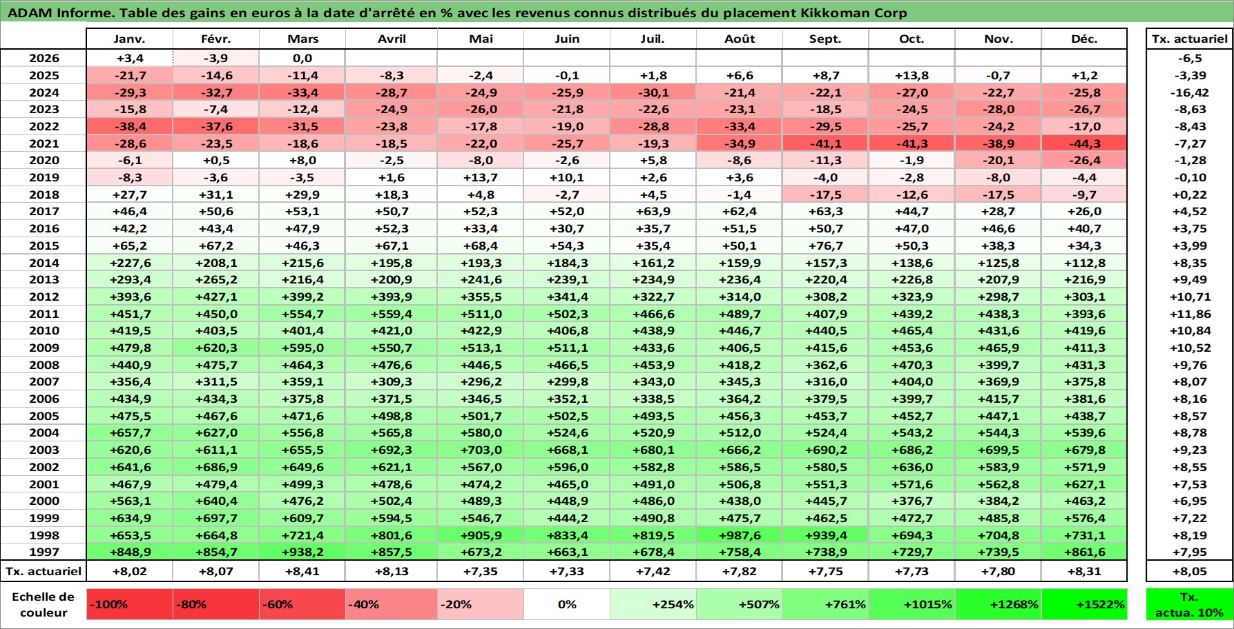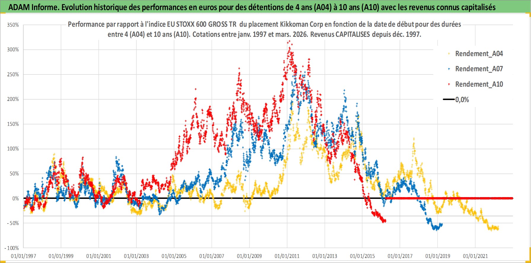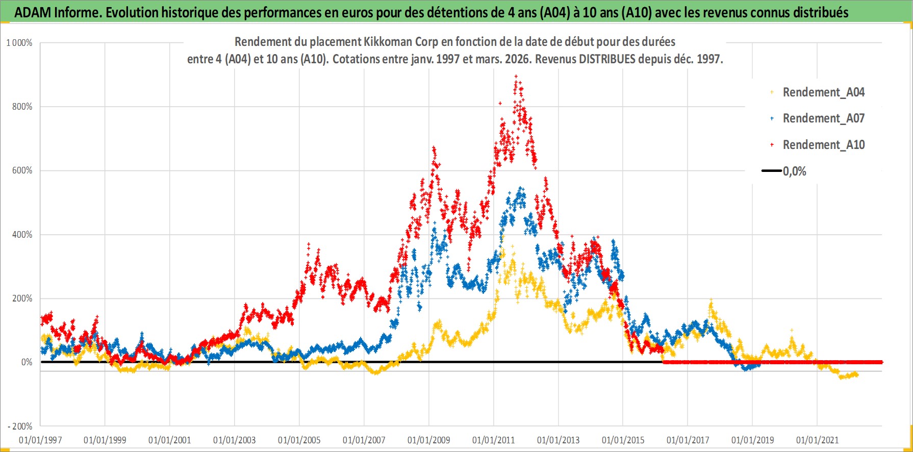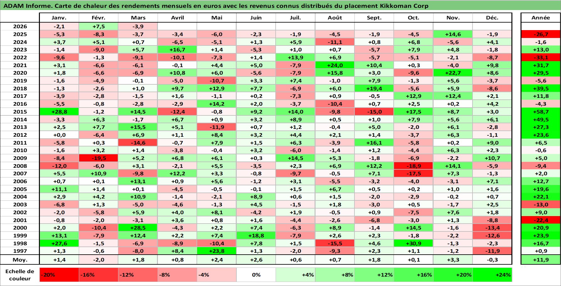 Site dédié aux investisseursPage dédiée sur site financeAnalyse des valorisations hebdomadaires de l'action Kikkoman Corp. Cet actif est cote en JPY. Les valorisations sont en contrevaleur EURO et couvrent les semaines 1997W01 a 2026W13. Les revenus de cet actif financier sont pris en compte depuis la semaine 1997W52. La note globale ESG de cet actif est estimee a 3.0 (apres rebasage entre 0 et 20).